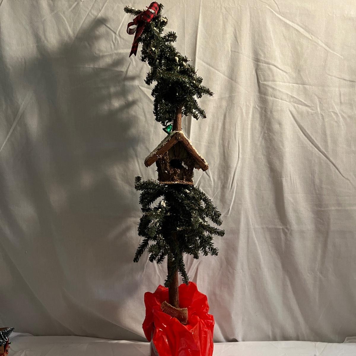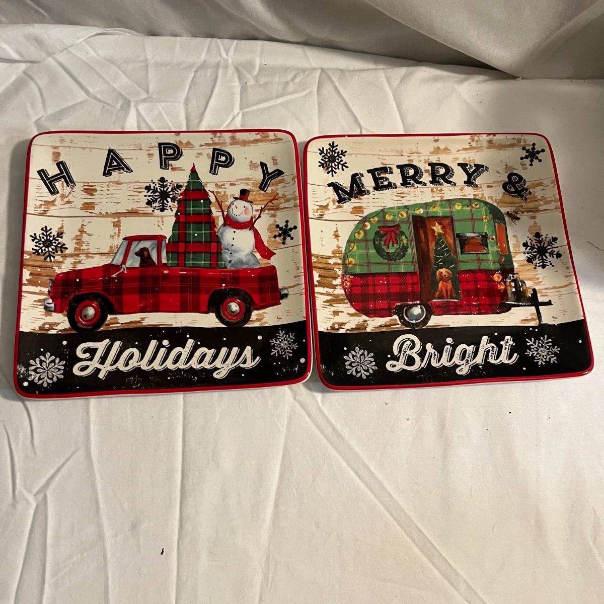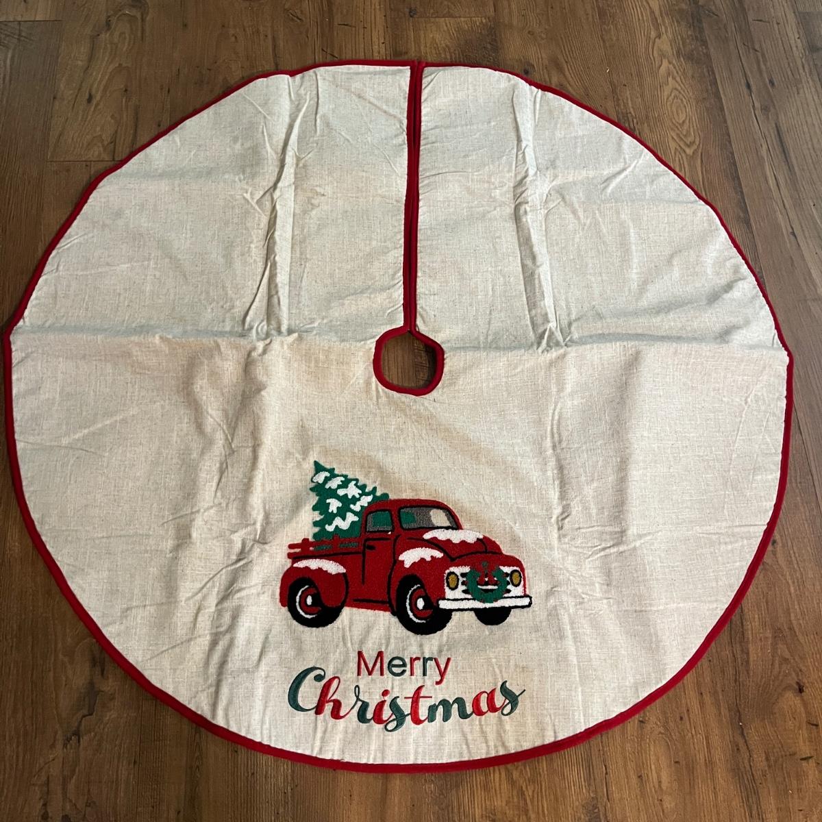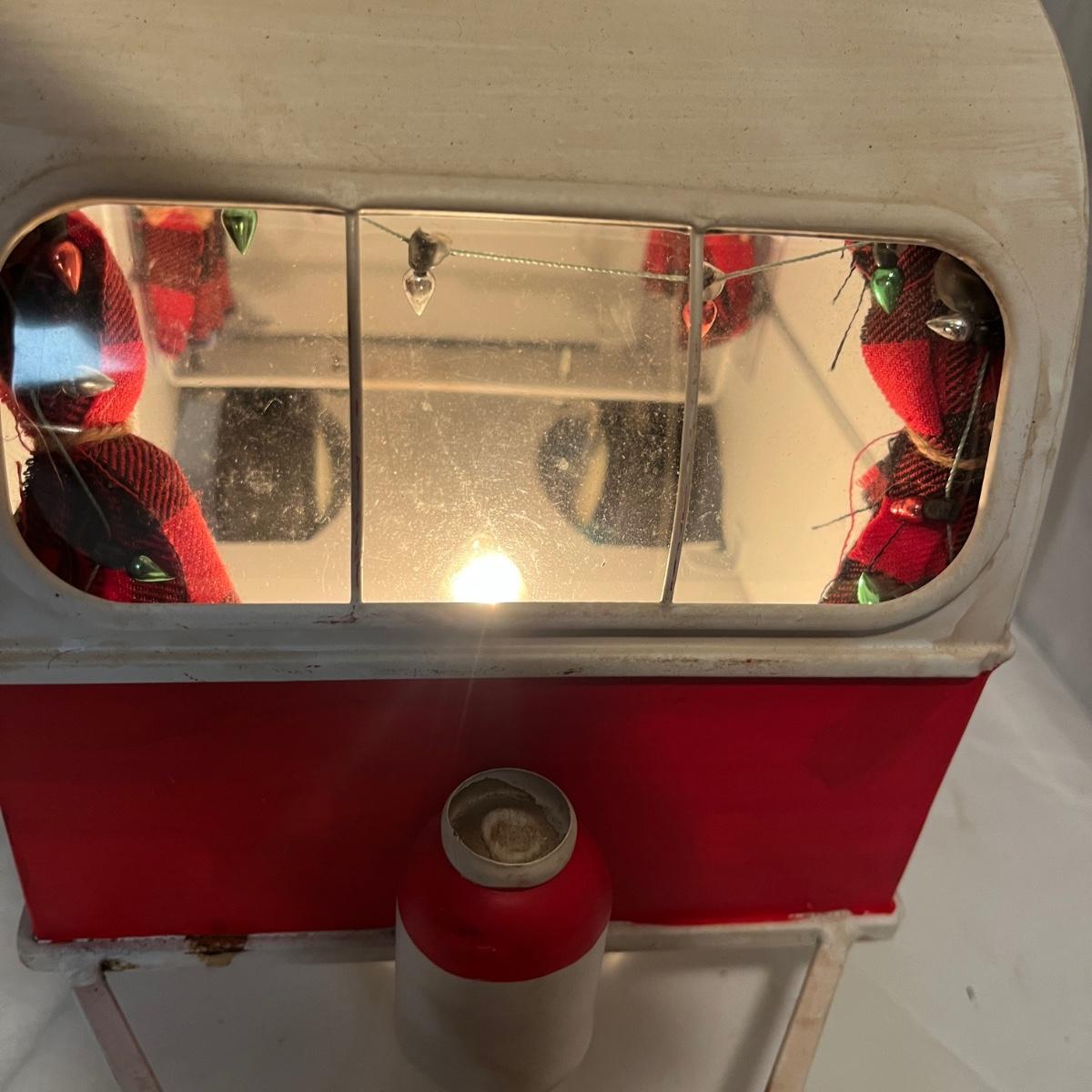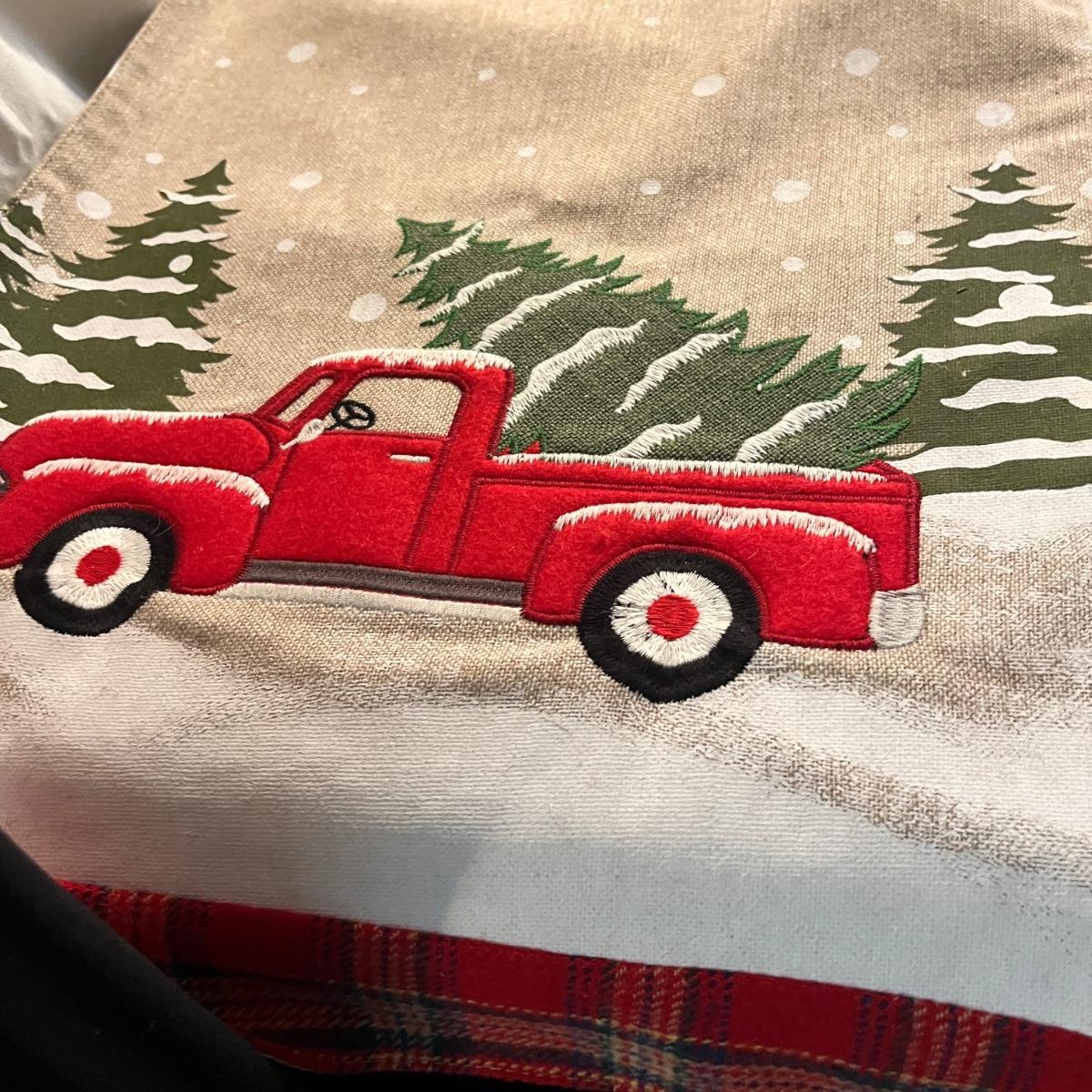 This large Christmas lot contains a lighted tree, table runner, metal trucks and campers, plates, tree skirt, plastic plate and more. Tree measures 24”D x 86”H. Tree lit up when plugged in. The tree separates at the top, making the top piece 27” and the bottom piece(s) 59”. It is likely to separate further, but we were unable because of its garland and lights.