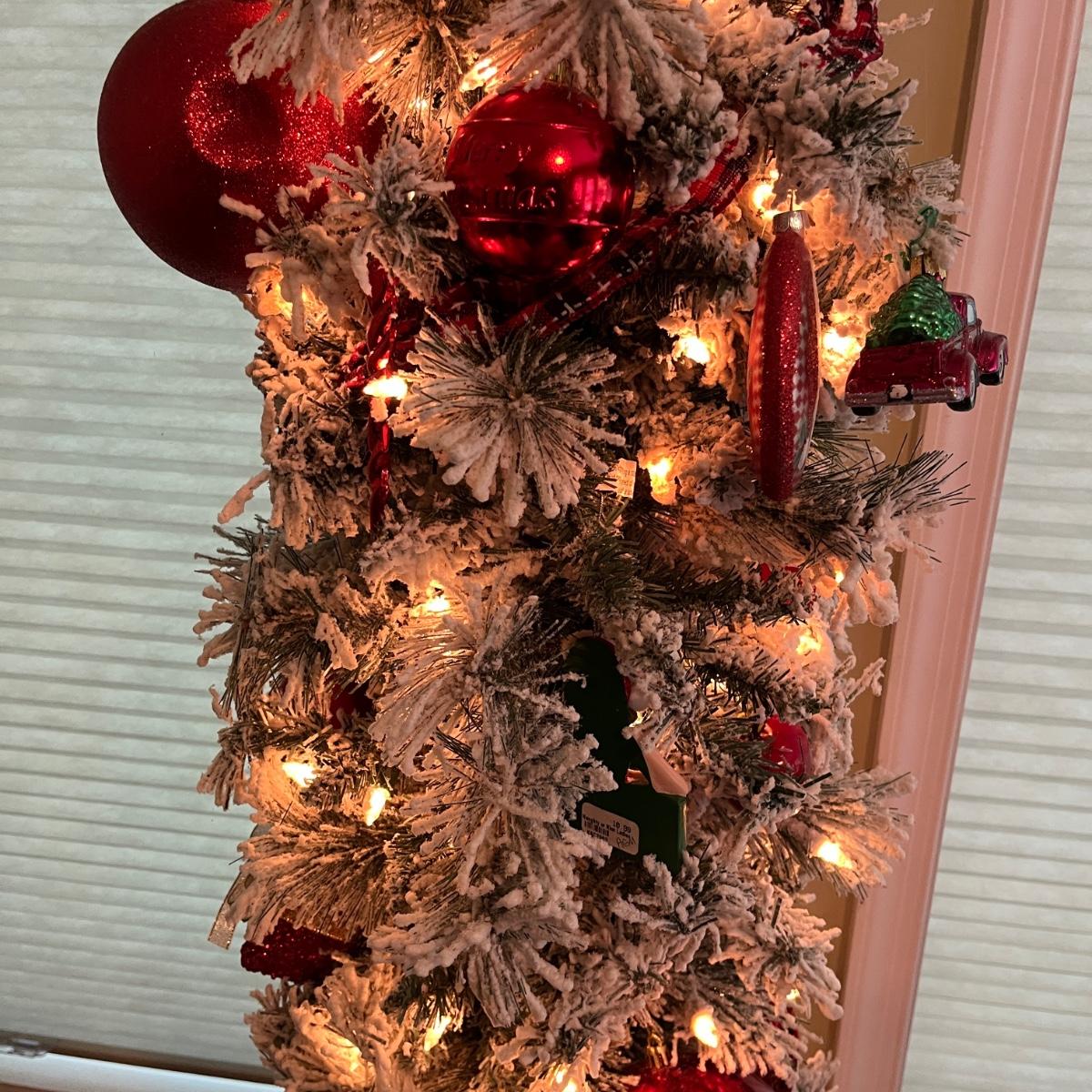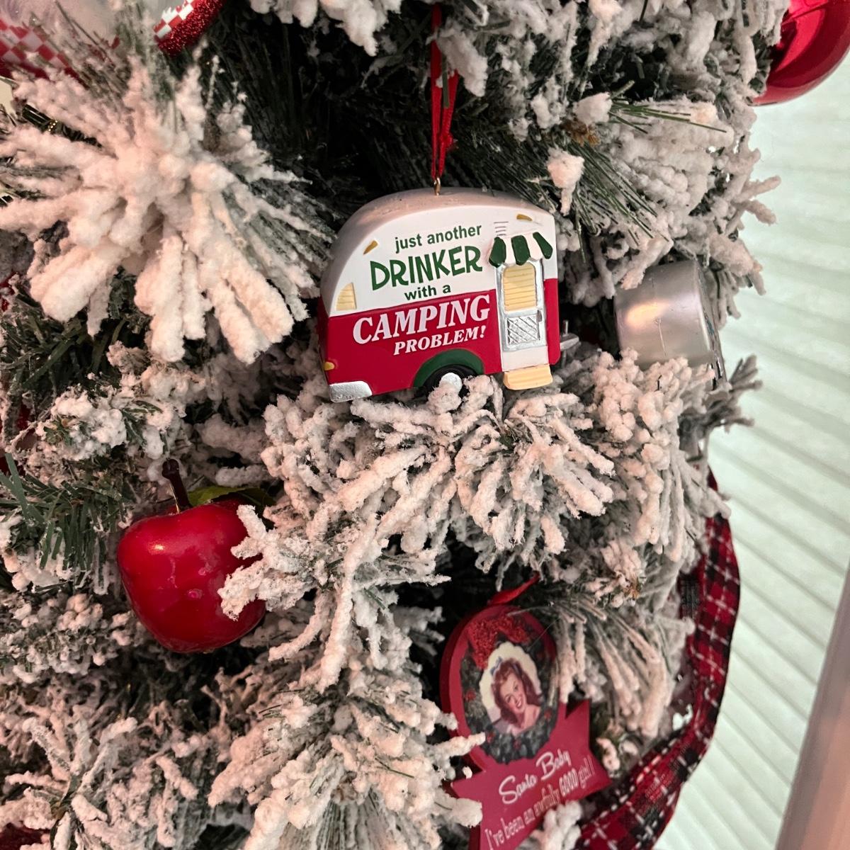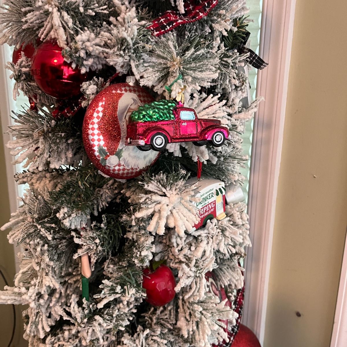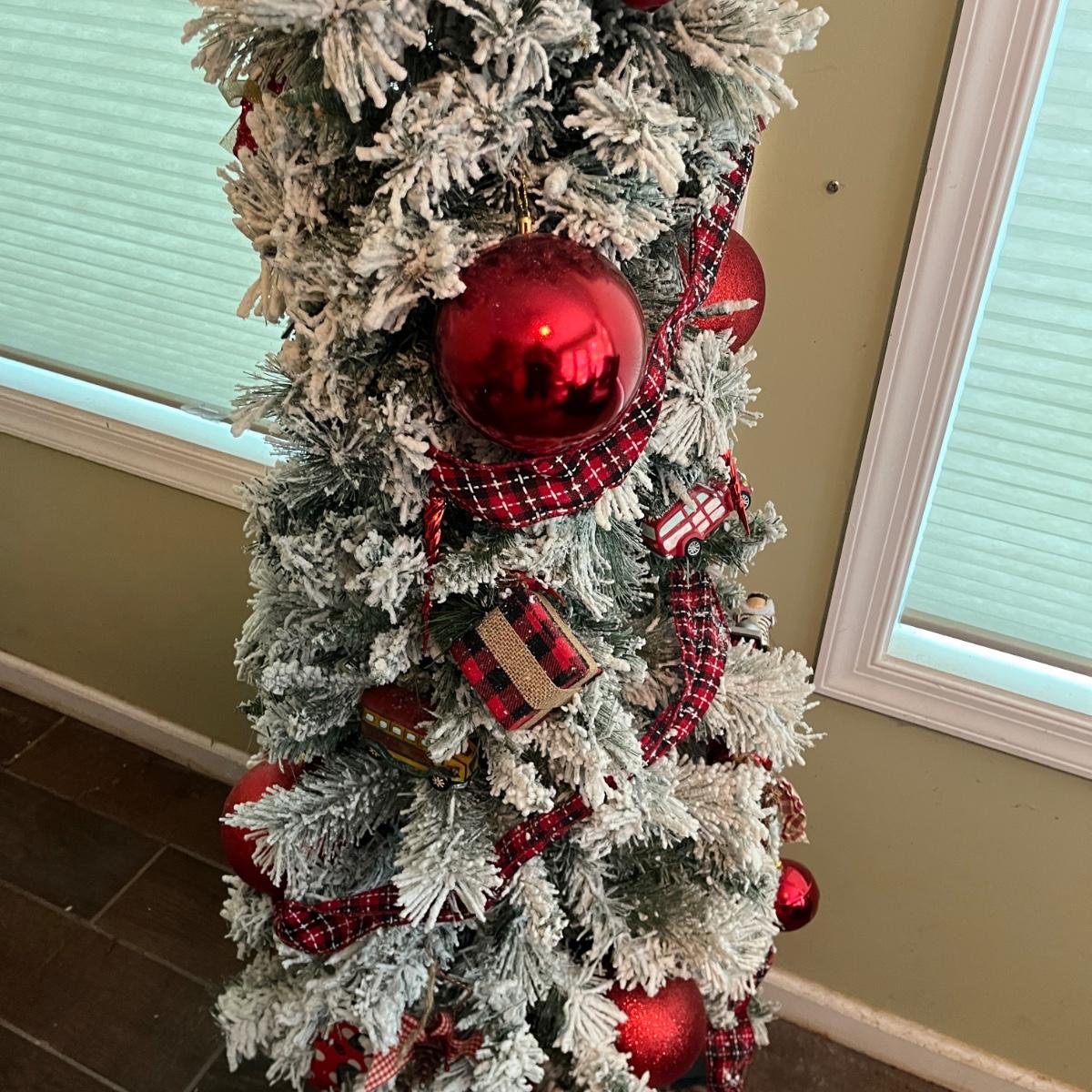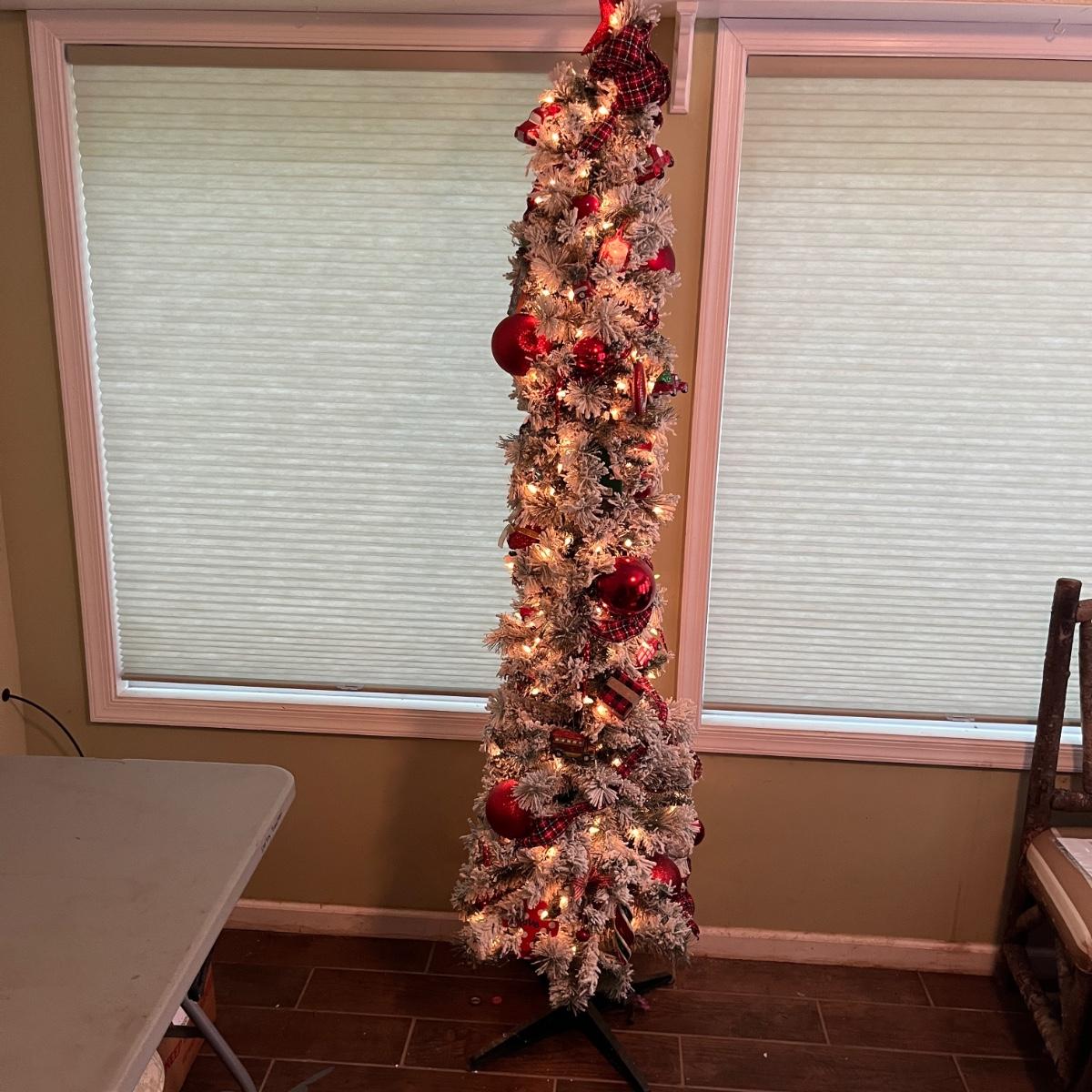 This large Christmas lot contains a lighted tree, table runner, metal trucks and campers, plates, tree skirt, plastic plate and more. Tree measures 24”D x 86”H. Tree lit up when plugged in. The tree separates at the top, making the top piece 27” and the bottom piece(s) 59”. It is likely to separate further, but we were unable because of its garland and lights.