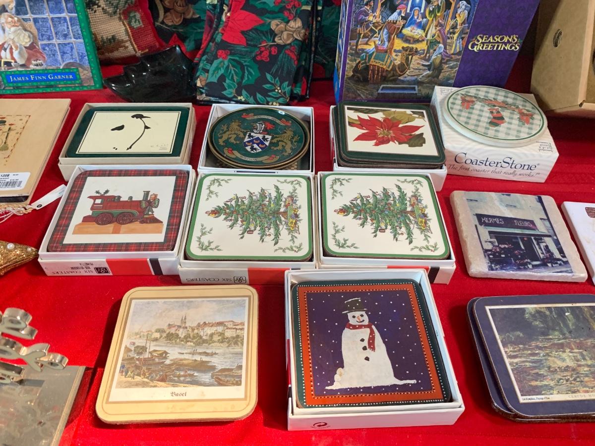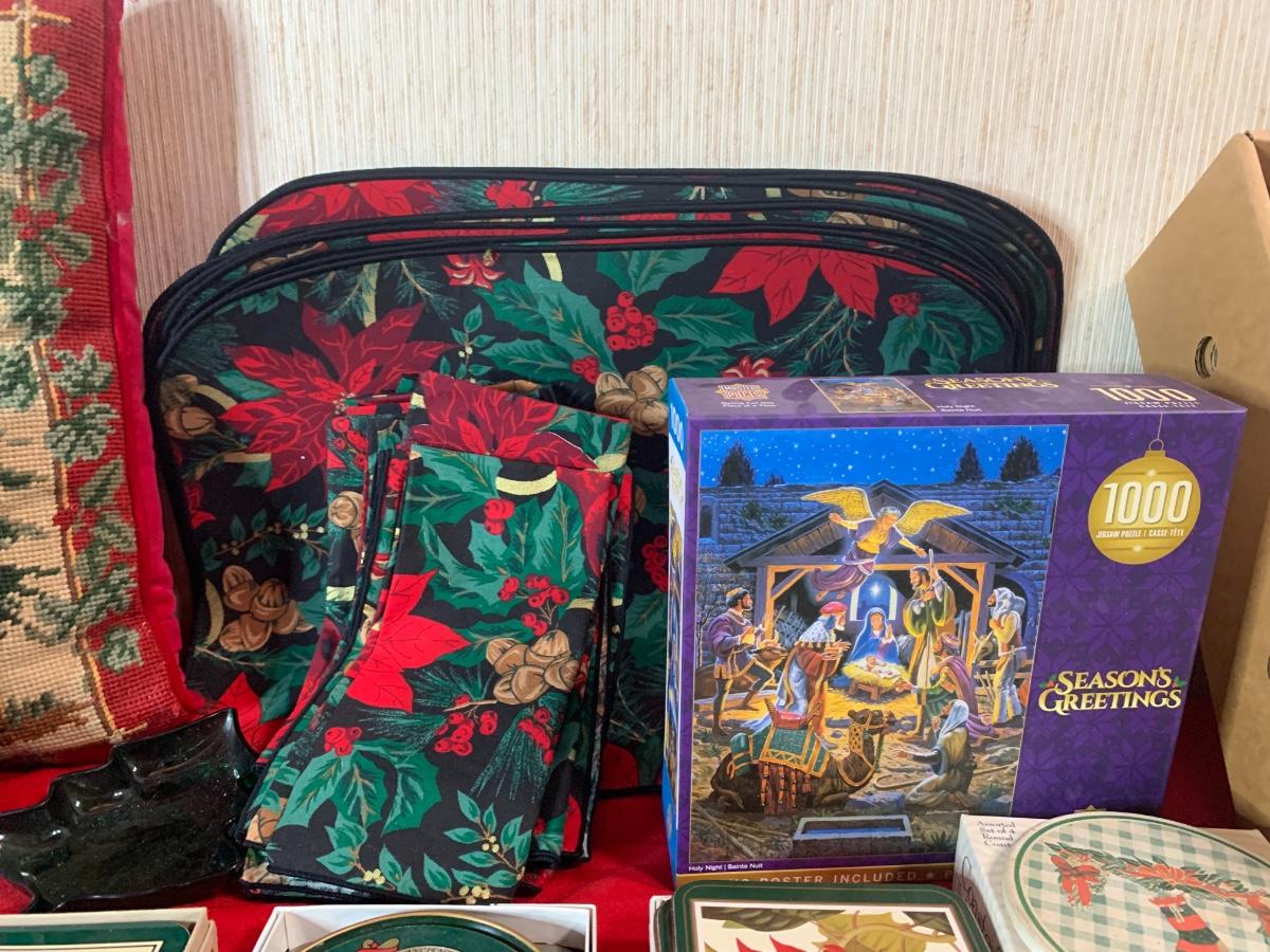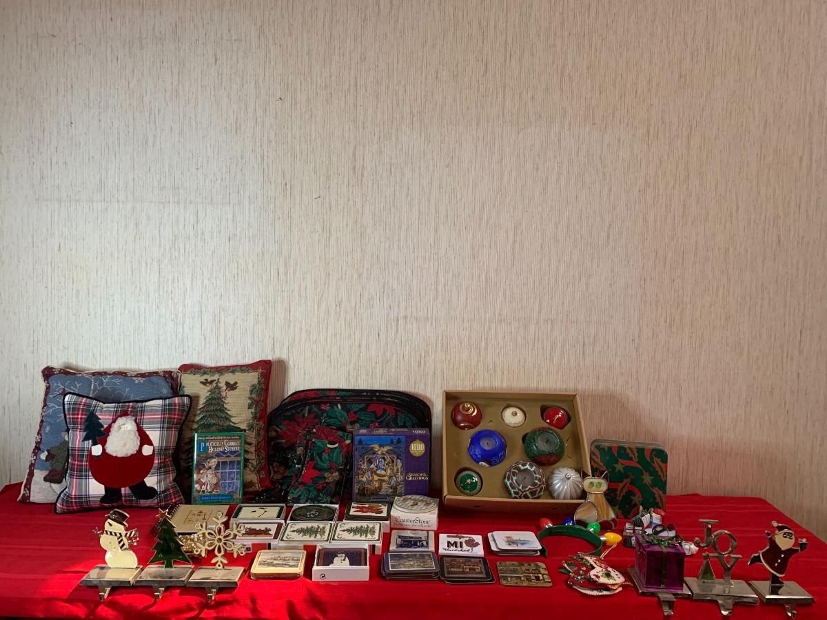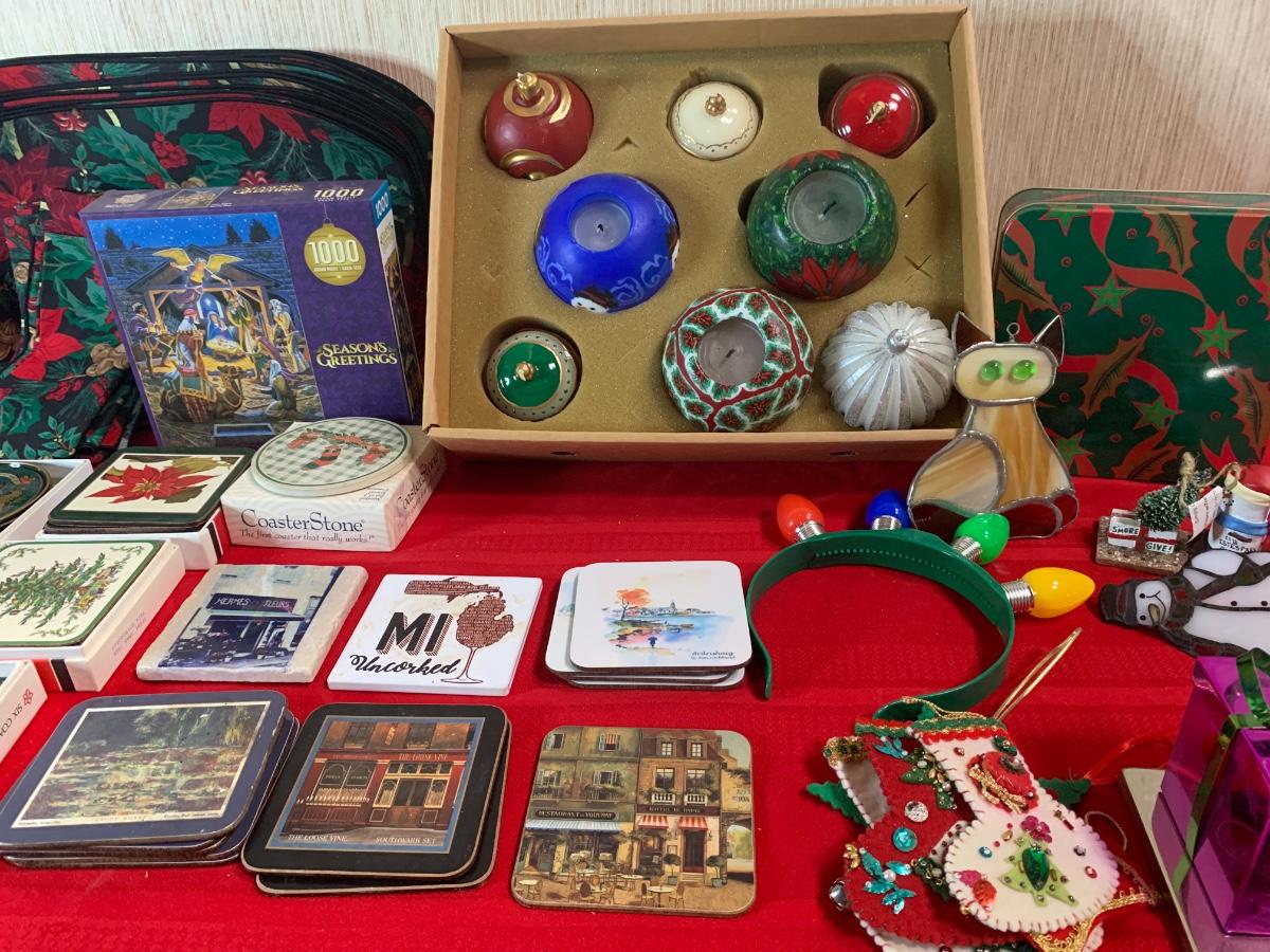 Assorted Holiday items including coasters, candles, stocking holders, a notebook, , book, puzzle, and more.