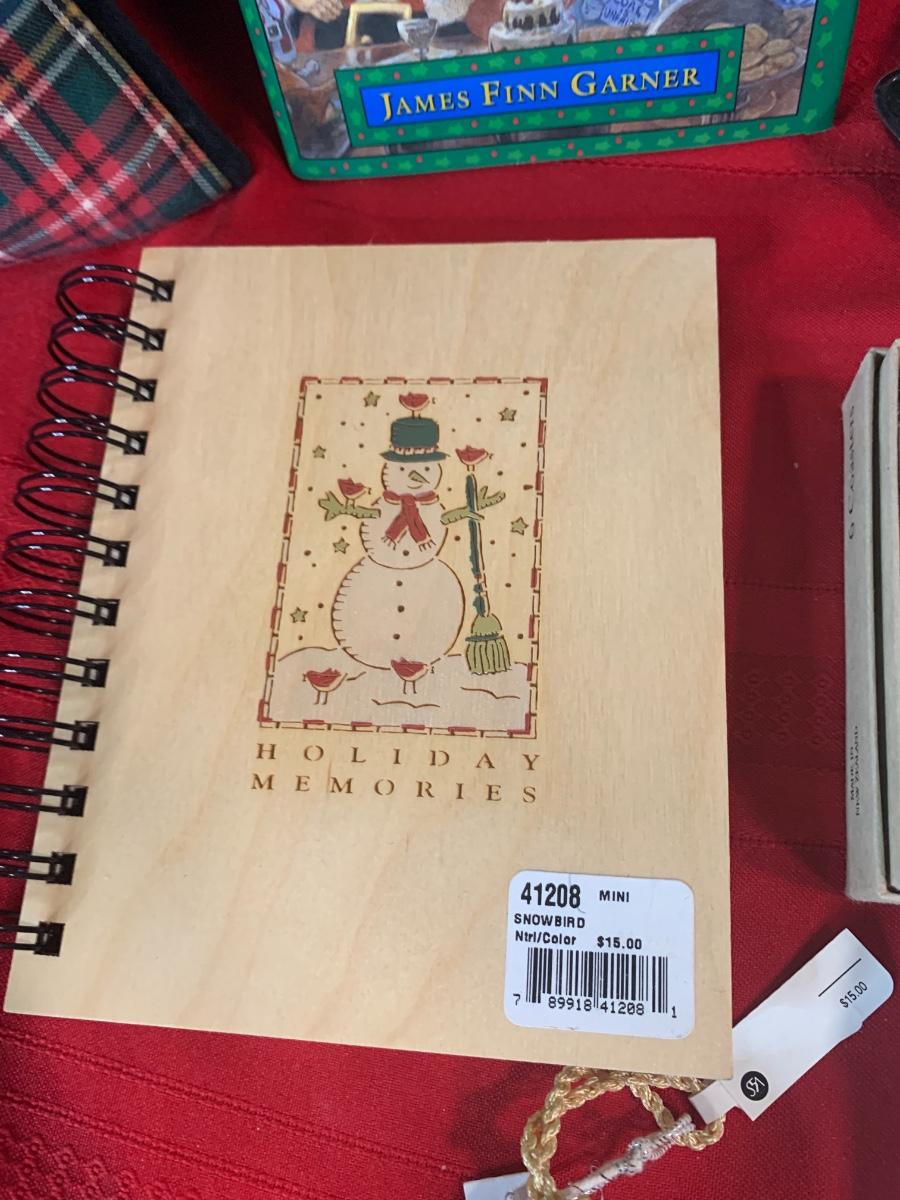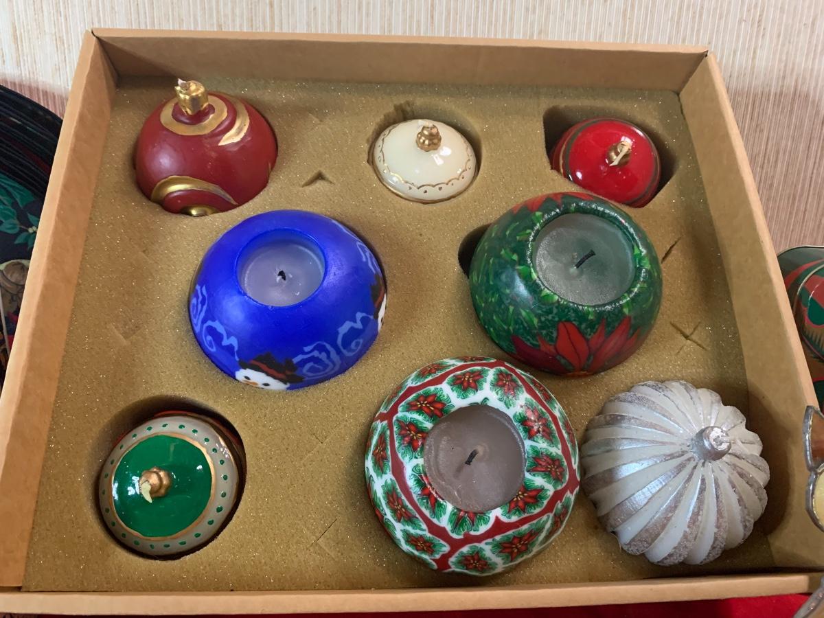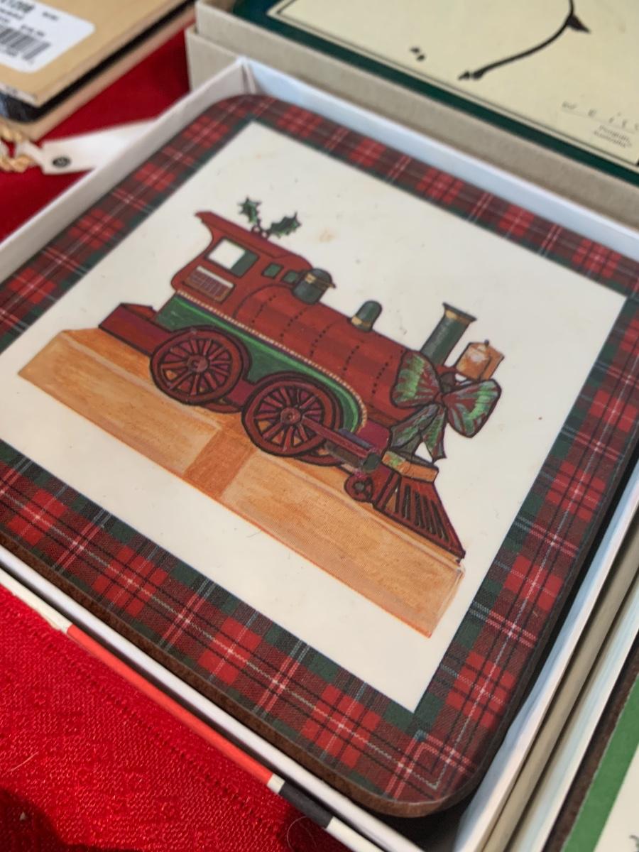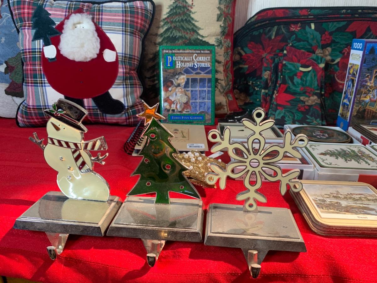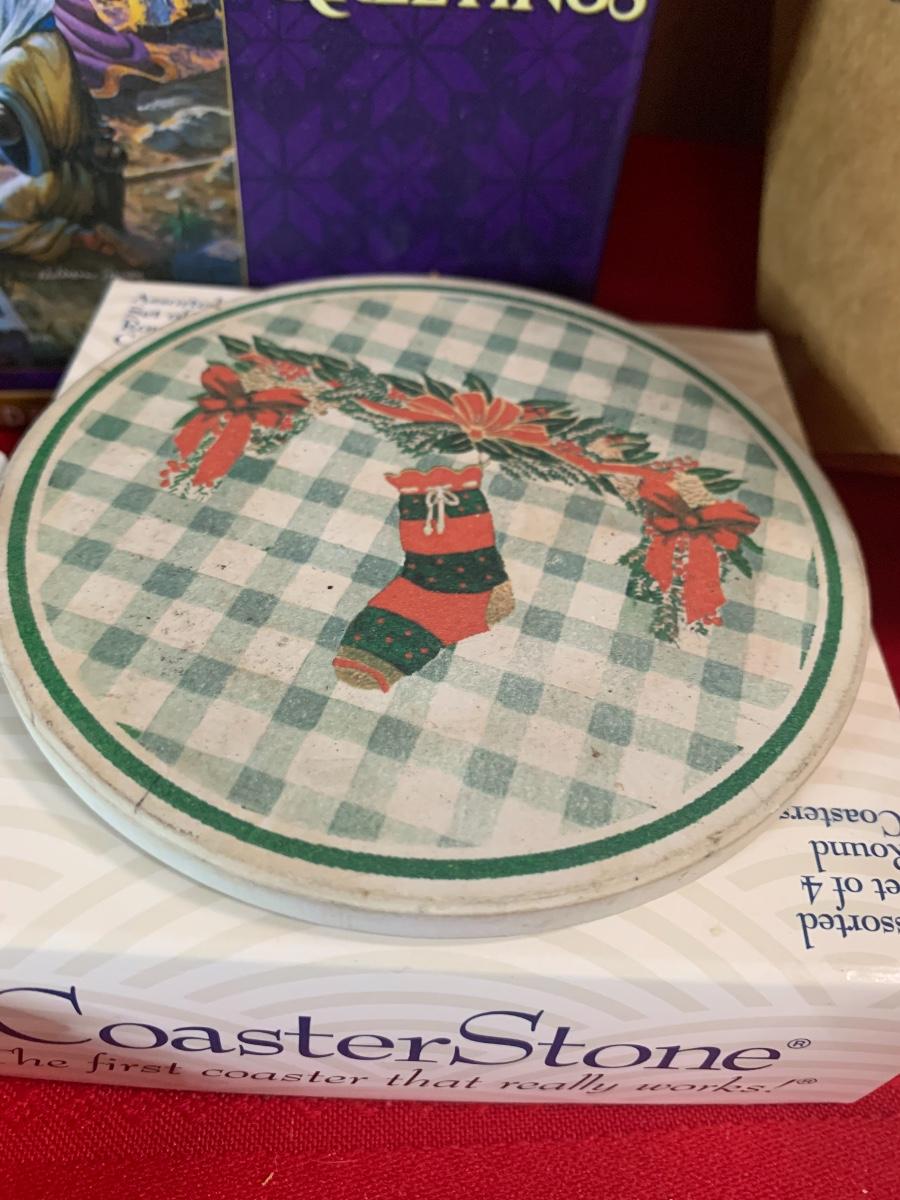 Assorted Holiday items including coasters, candles, stocking holders, a notebook, , book, puzzle, and more.