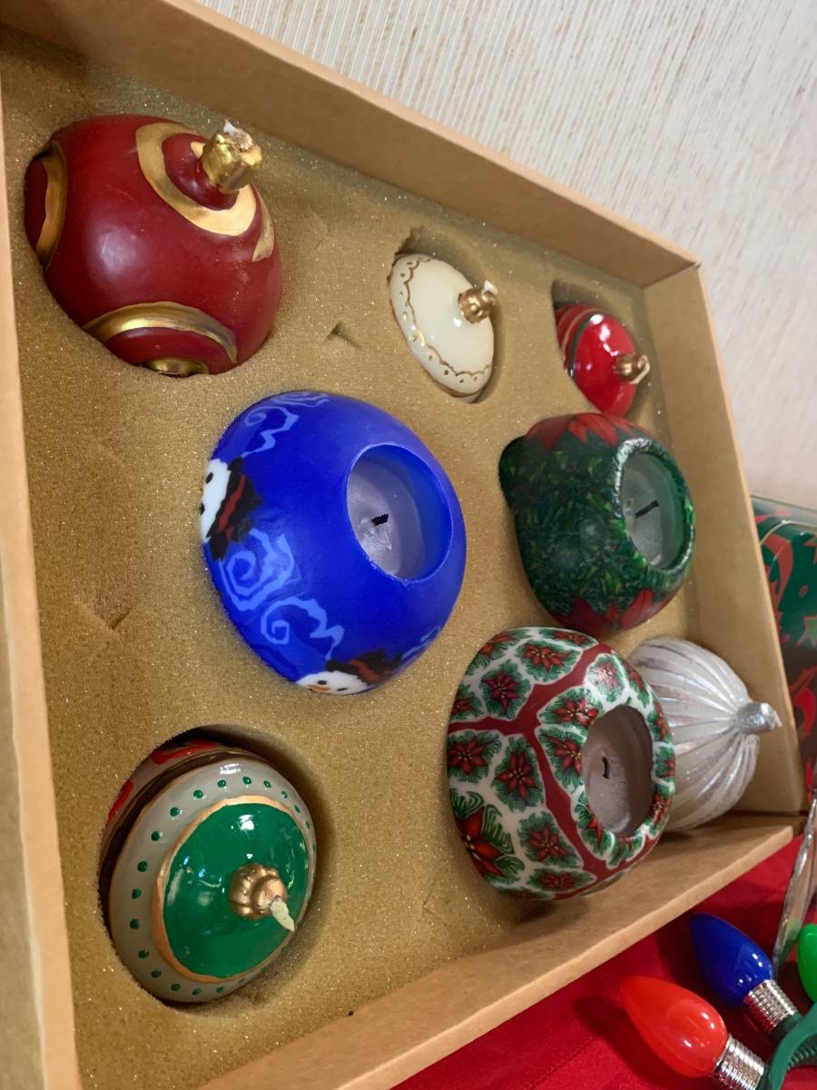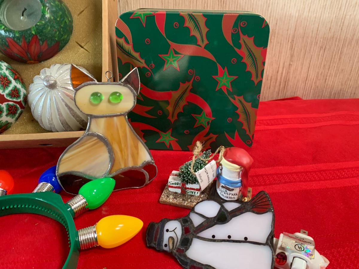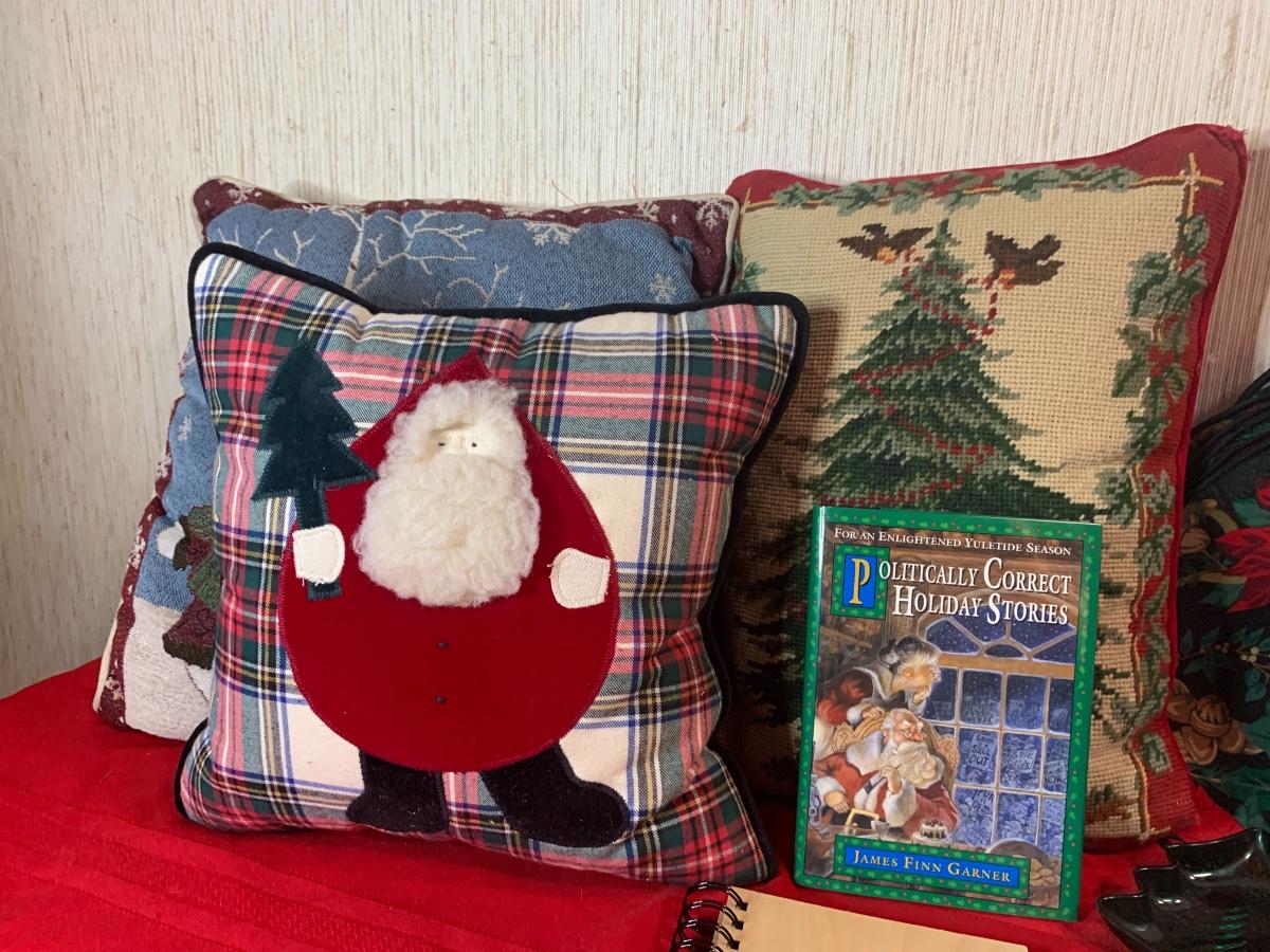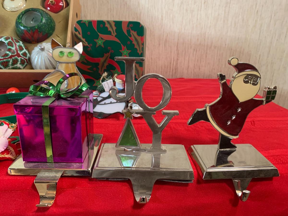 Assorted Holiday items including coasters, candles, stocking holders, a notebook, , book, puzzle, and more.