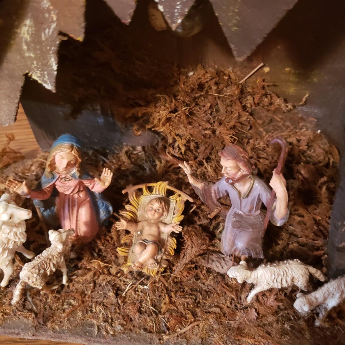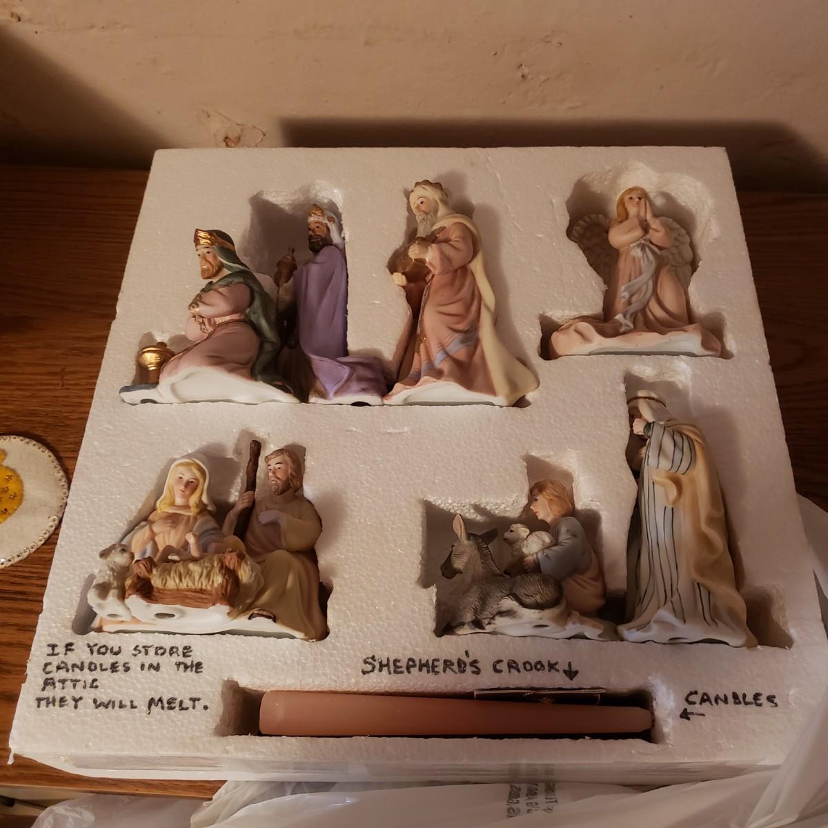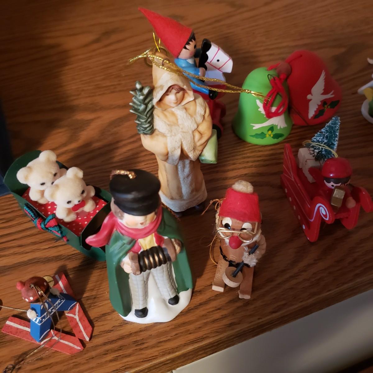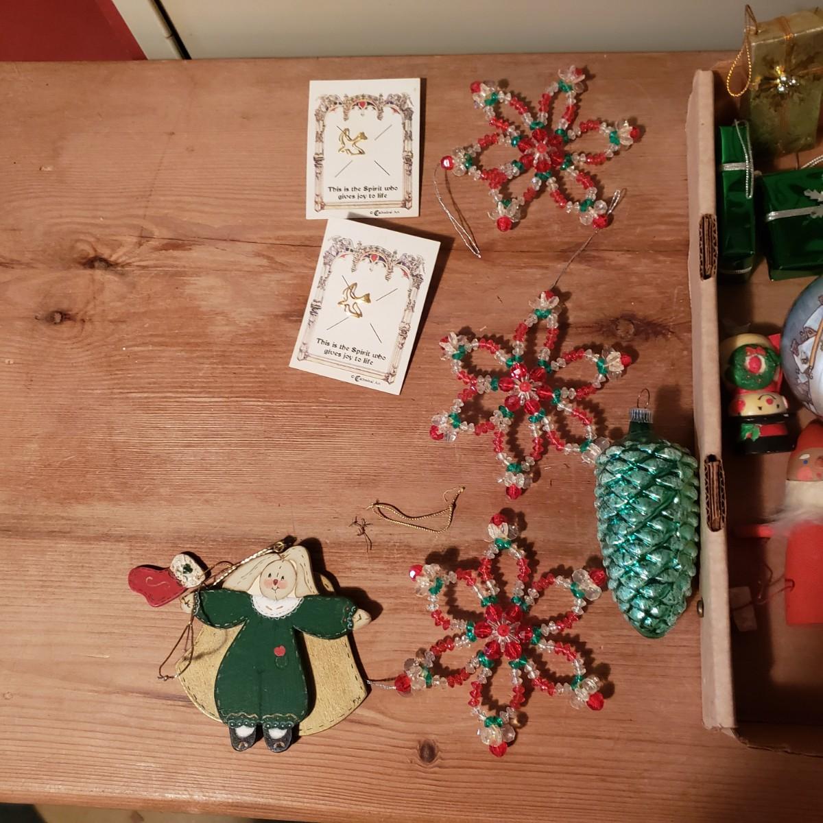 Christmas in May! Don't miss some of these handmade unique decorations, like the advent calendar, tree and ornaments all with sequenced sparkles. There is a Nativity scene made in Italy. The light does not come on when plugged in, may be a bulb. There are some vintage Hallmark ornaments and wooden ones. See pictures for details. Decorations have been stores in a basement and may be a little musty smelling.