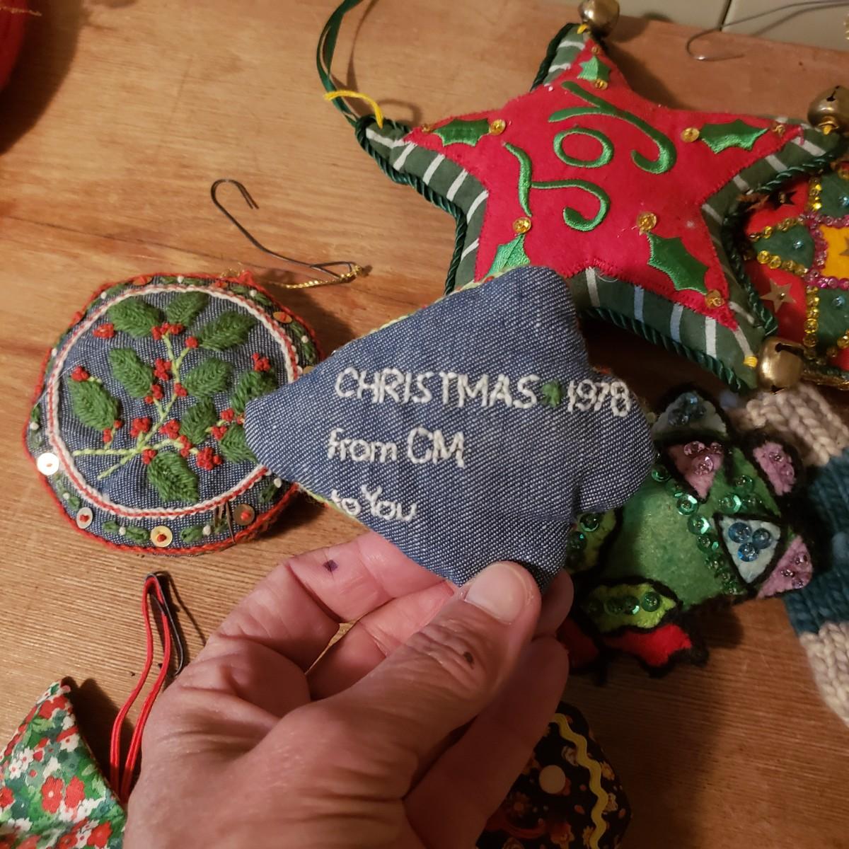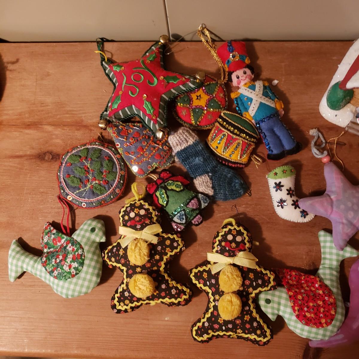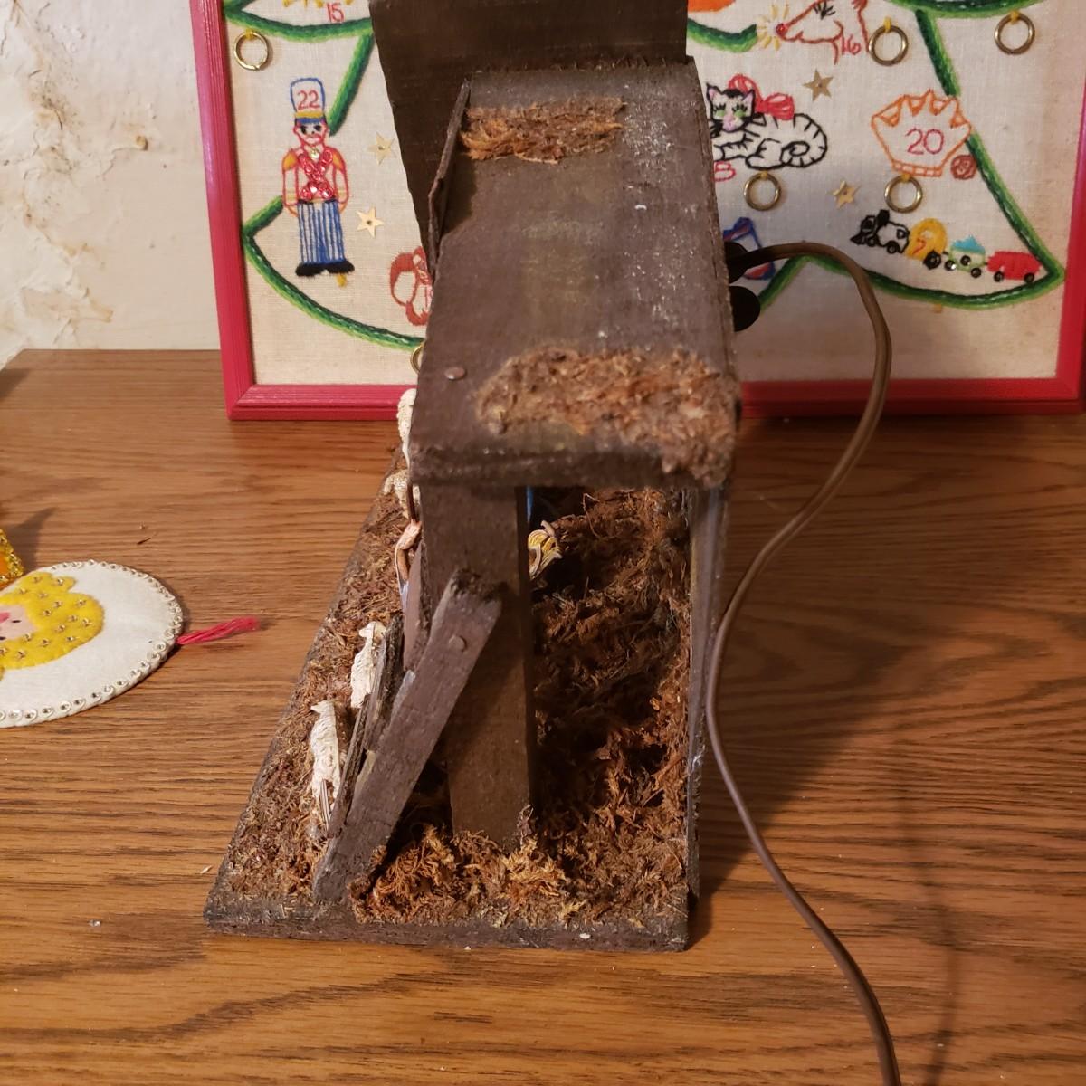 Christmas in May! Don't miss some of these handmade unique decorations, like the advent calendar, tree and ornaments all with sequenced sparkles. There is a Nativity scene made in Italy. The light does not come on when plugged in, may be a bulb. There are some vintage Hallmark ornaments and wooden ones. See pictures for details. Decorations have been stores in a basement and may be a little musty smelling.