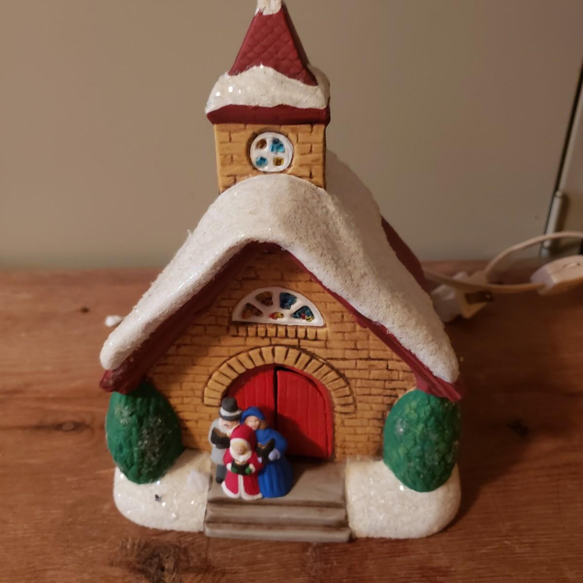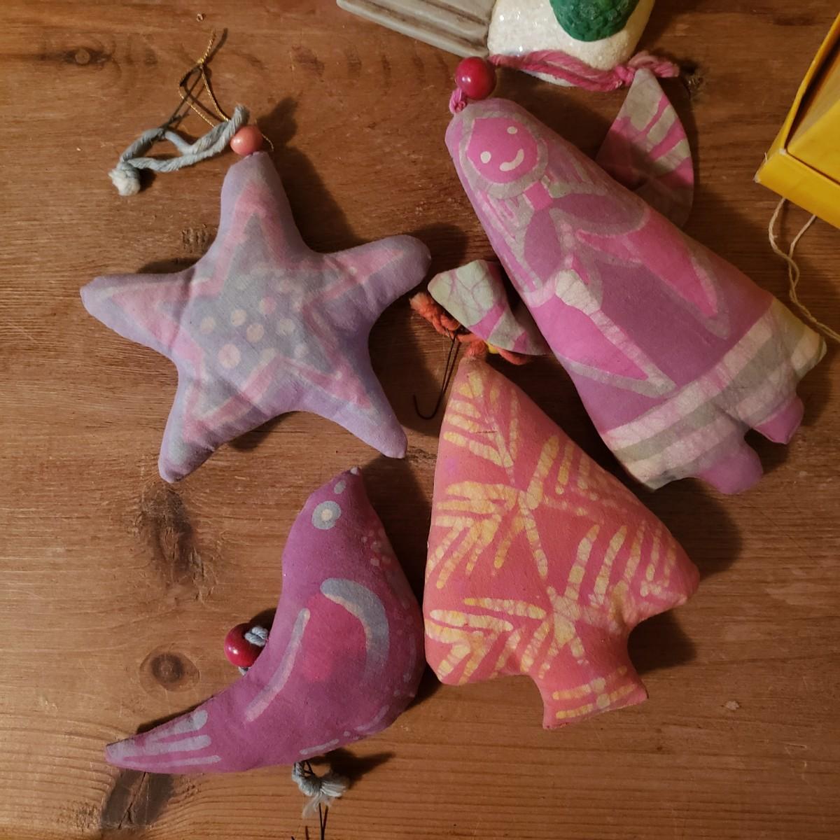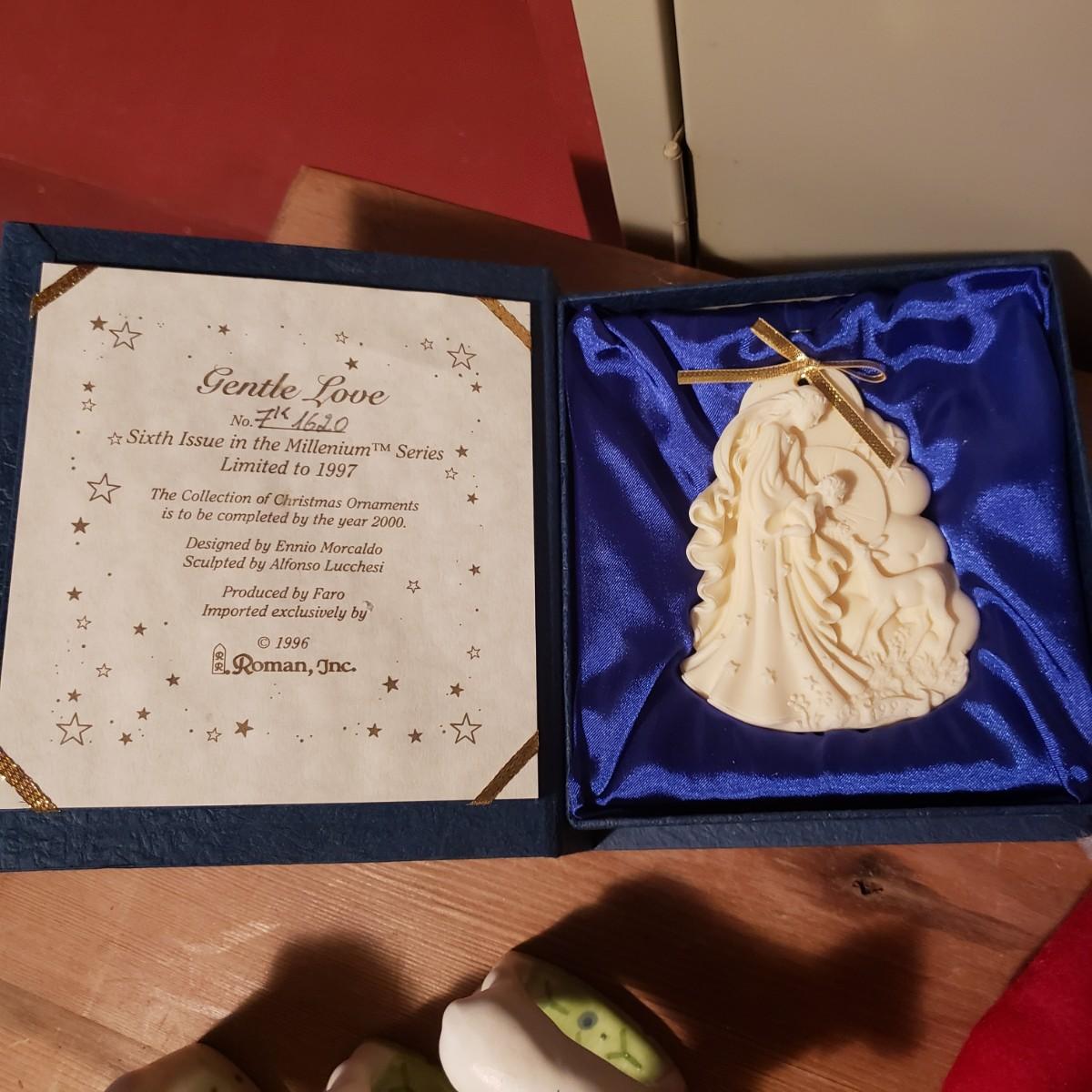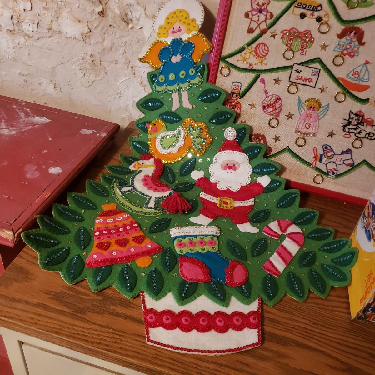 Christmas in May! Don't miss some of these handmade unique decorations, like the advent calendar, tree and ornaments all with sequenced sparkles. There is a Nativity scene made in Italy. The light does not come on when plugged in, may be a bulb. There are some vintage Hallmark ornaments and wooden ones. See pictures for details. Decorations have been stores in a basement and may be a little musty smelling.