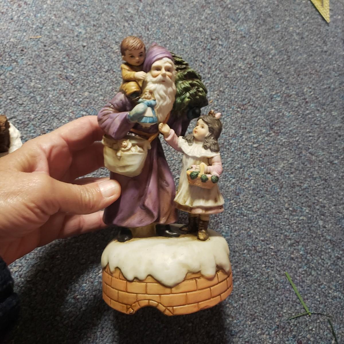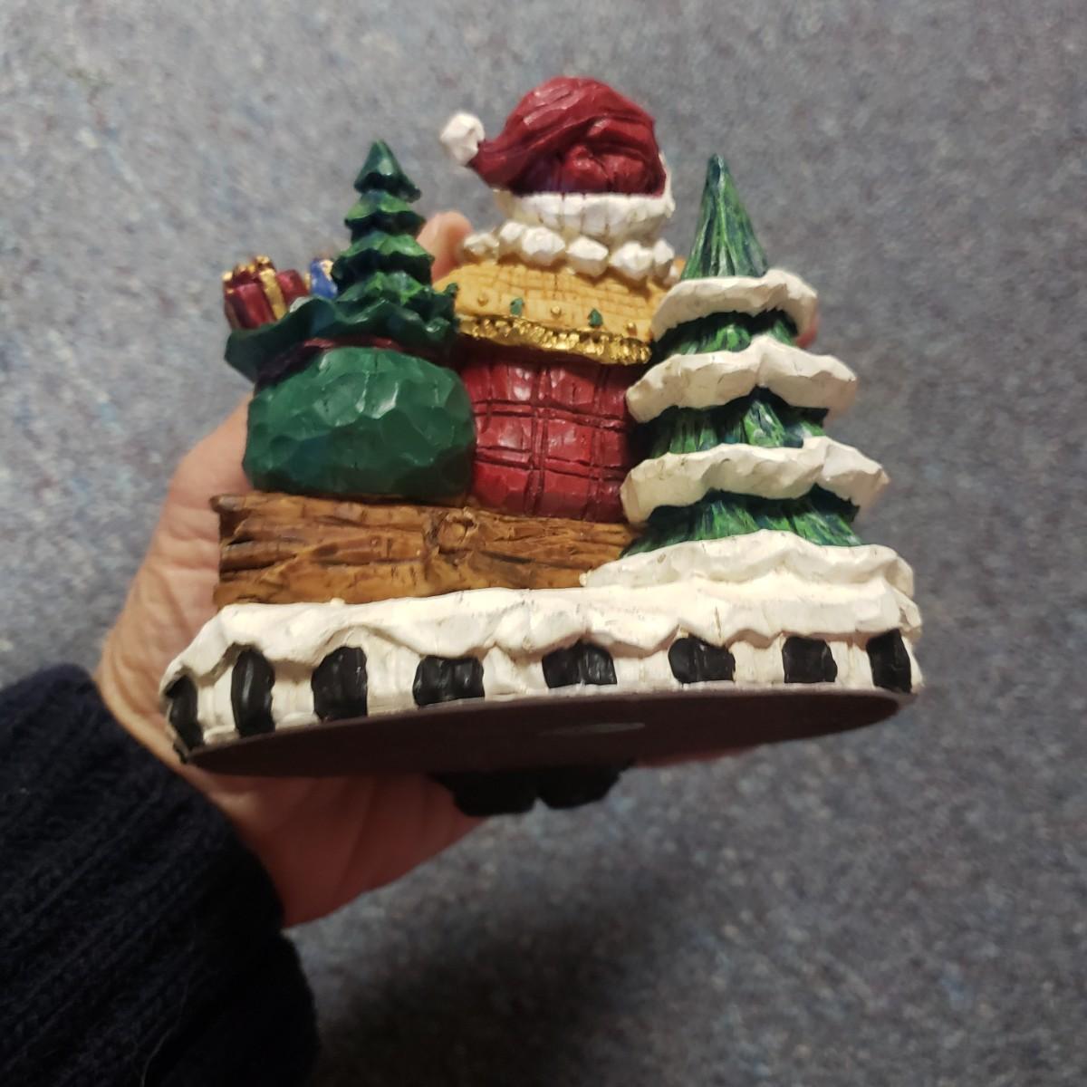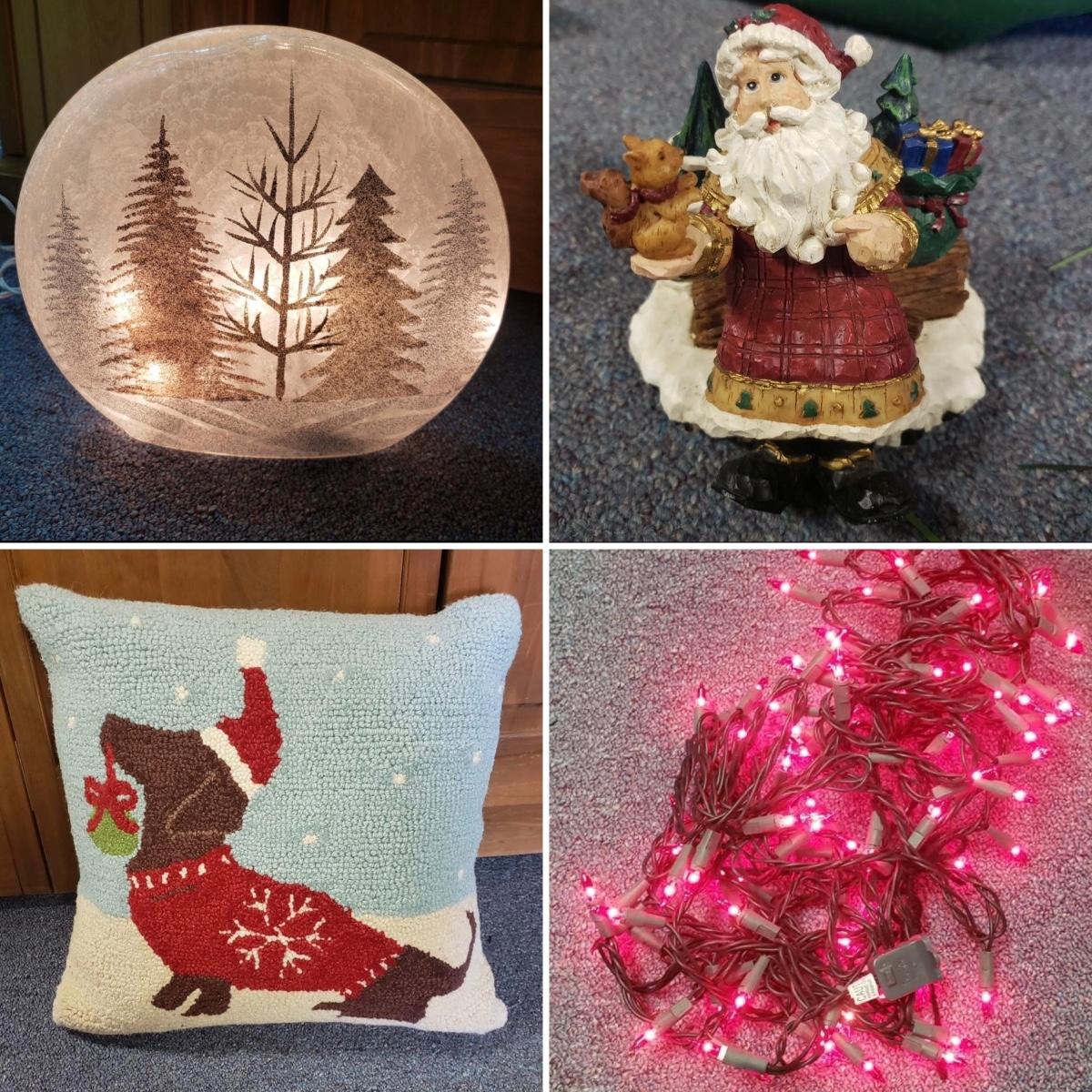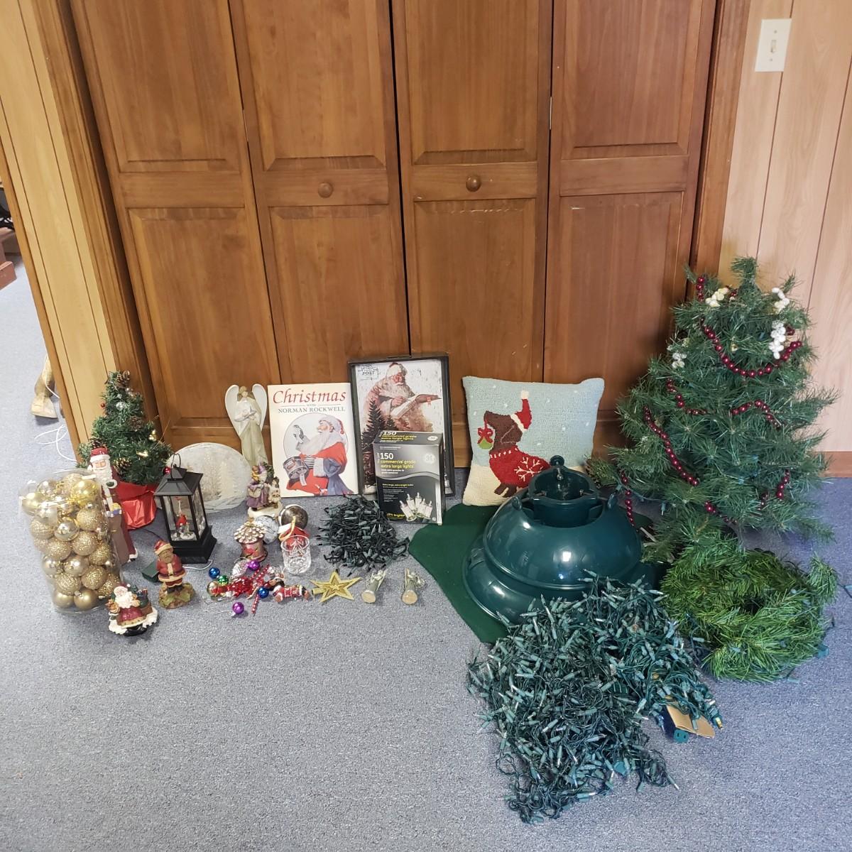 Christmas, just in time! This large Christmas lot features figurines, ornaments, lights, a tree stand and two small trees. All lights power on when plugged in, see pictures. The largest of the two trees measures 20" x 30"H. The tree is already stranded with red lights, plastic popcorn and cranberry garland. The purple coated Santa with children (4" x 8"H) is from the Santa Claus Shoppe and is a working music box. The Thomas Clark figurine is called "Mr. Claus" and measures 3" x 6"H. The tall angel figurine holding a silver star appears to be a resin material. The black metal cardinal snow globe lamp was not able to be tested with batteries, yet is still a beautiful piece to admire. The white frosted glass with winter trees lights up.