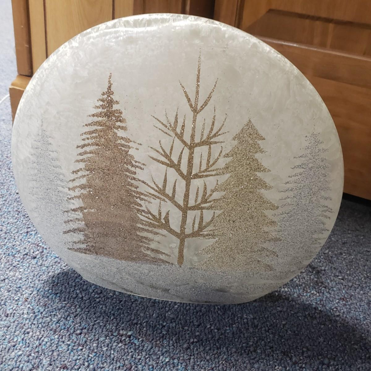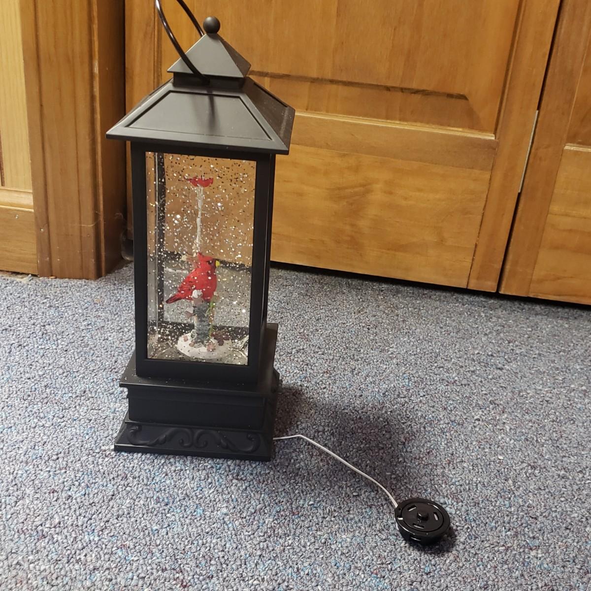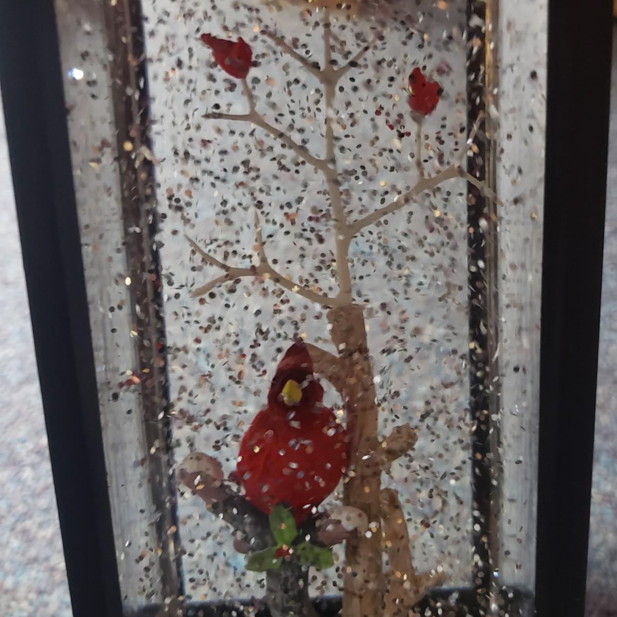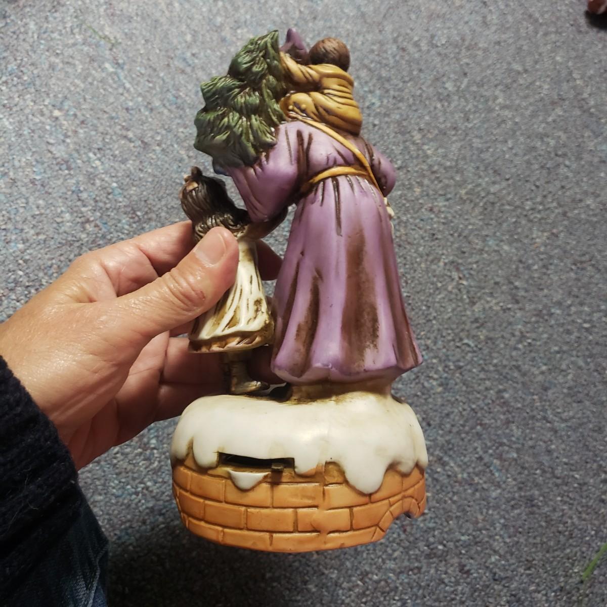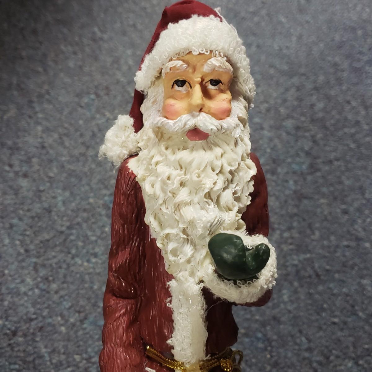 Christmas, just in time! This large Christmas lot features figurines, ornaments, lights, a tree stand and two small trees. All lights power on when plugged in, see pictures. The largest of the two trees measures 20" x 30"H. The tree is already stranded with red lights, plastic popcorn and cranberry garland. The purple coated Santa with children (4" x 8"H) is from the Santa Claus Shoppe and is a working music box. The Thomas Clark figurine is called "Mr. Claus" and measures 3" x 6"H. The tall angel figurine holding a silver star appears to be a resin material. The black metal cardinal snow globe lamp was not able to be tested with batteries, yet is still a beautiful piece to admire. The white frosted glass with winter trees lights up.