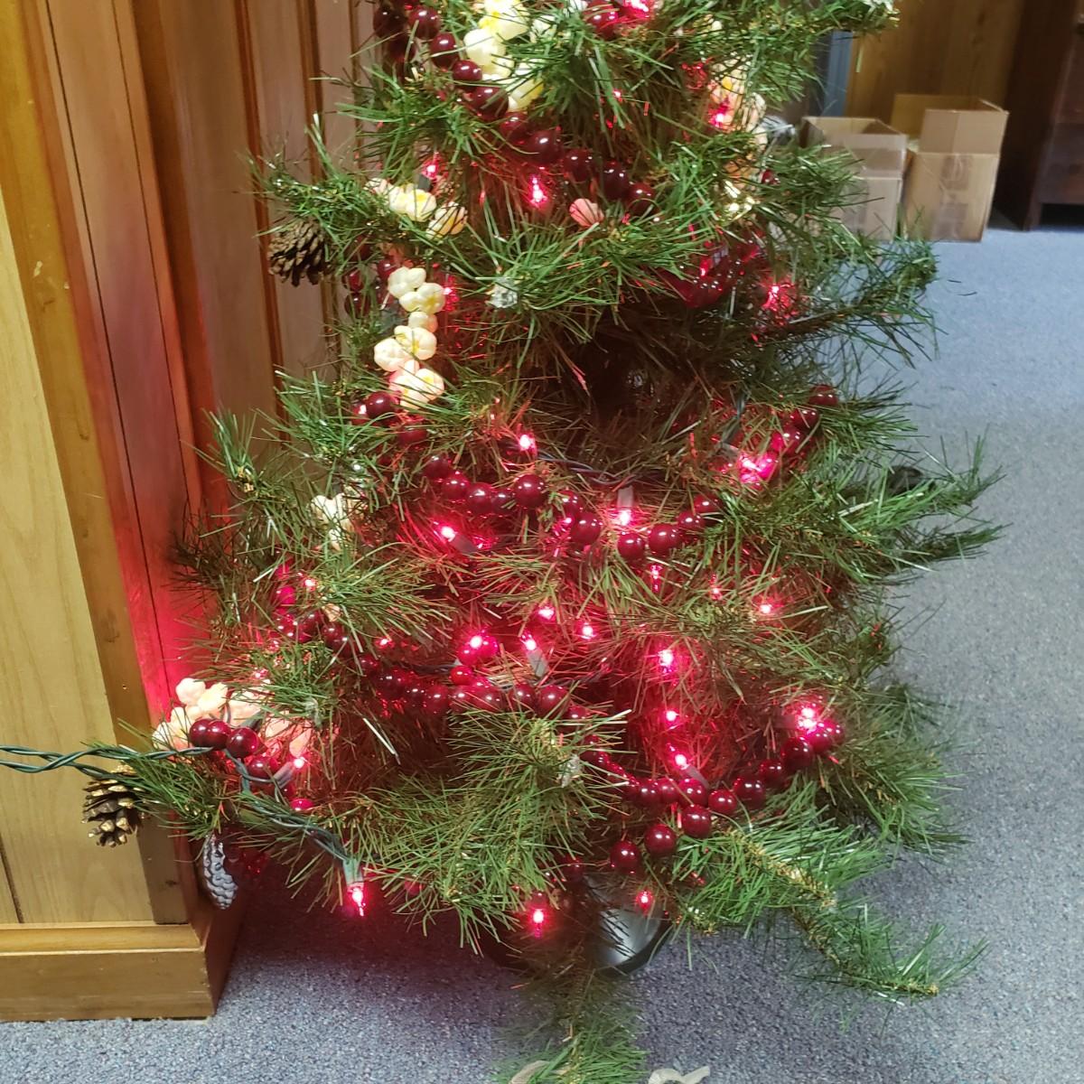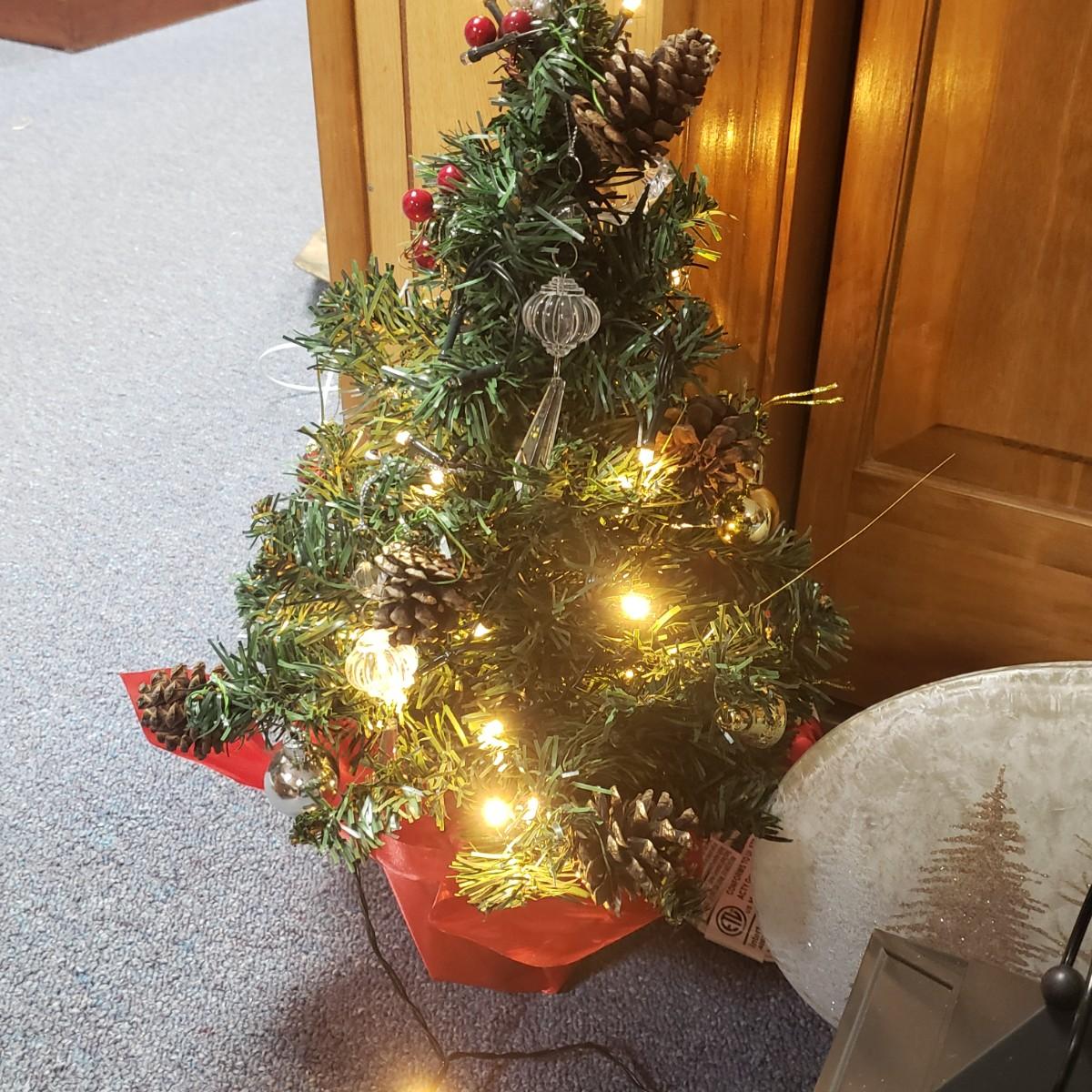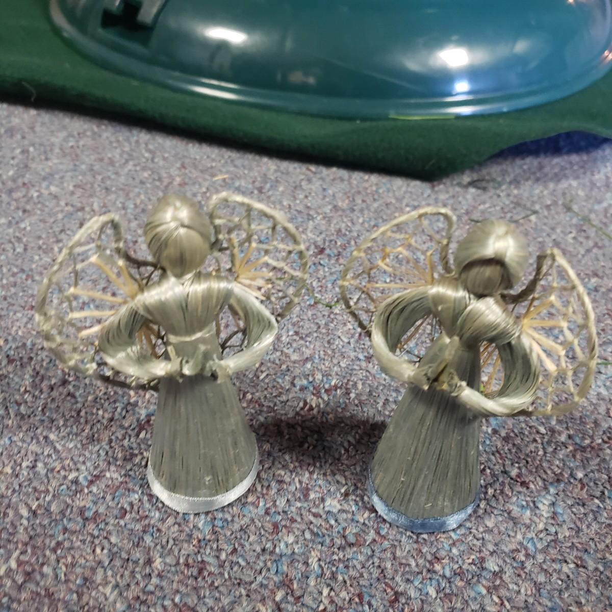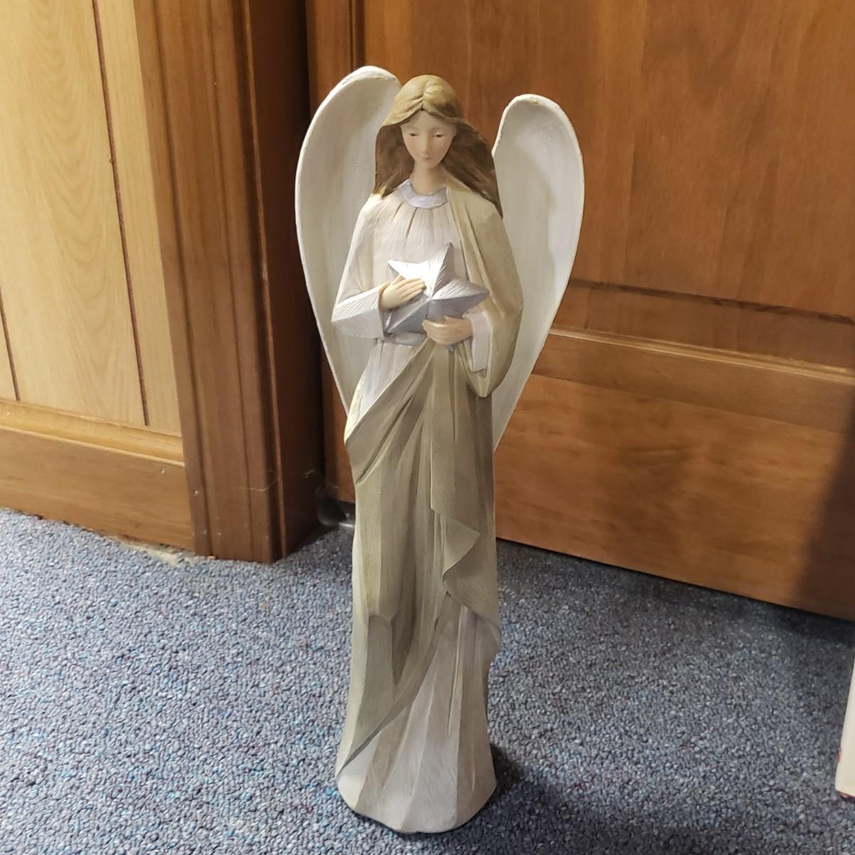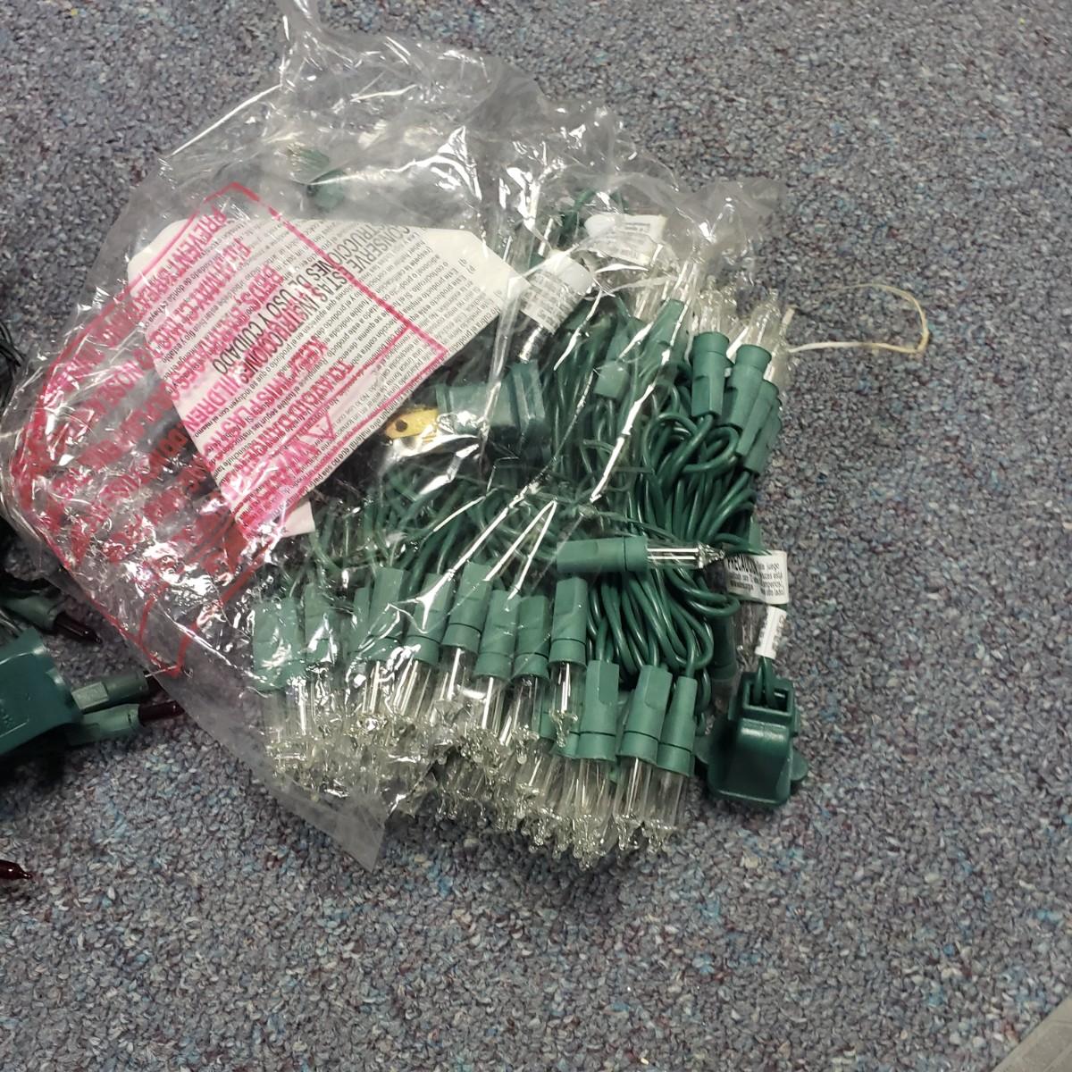 Christmas, just in time! This large Christmas lot features figurines, ornaments, lights, a tree stand and two small trees. All lights power on when plugged in, see pictures. The largest of the two trees measures 20" x 30"H. The tree is already stranded with red lights, plastic popcorn and cranberry garland. The purple coated Santa with children (4" x 8"H) is from the Santa Claus Shoppe and is a working music box. The Thomas Clark figurine is called "Mr. Claus" and measures 3" x 6"H. The tall angel figurine holding a silver star appears to be a resin material. The black metal cardinal snow globe lamp was not able to be tested with batteries, yet is still a beautiful piece to admire. The white frosted glass with winter trees lights up.