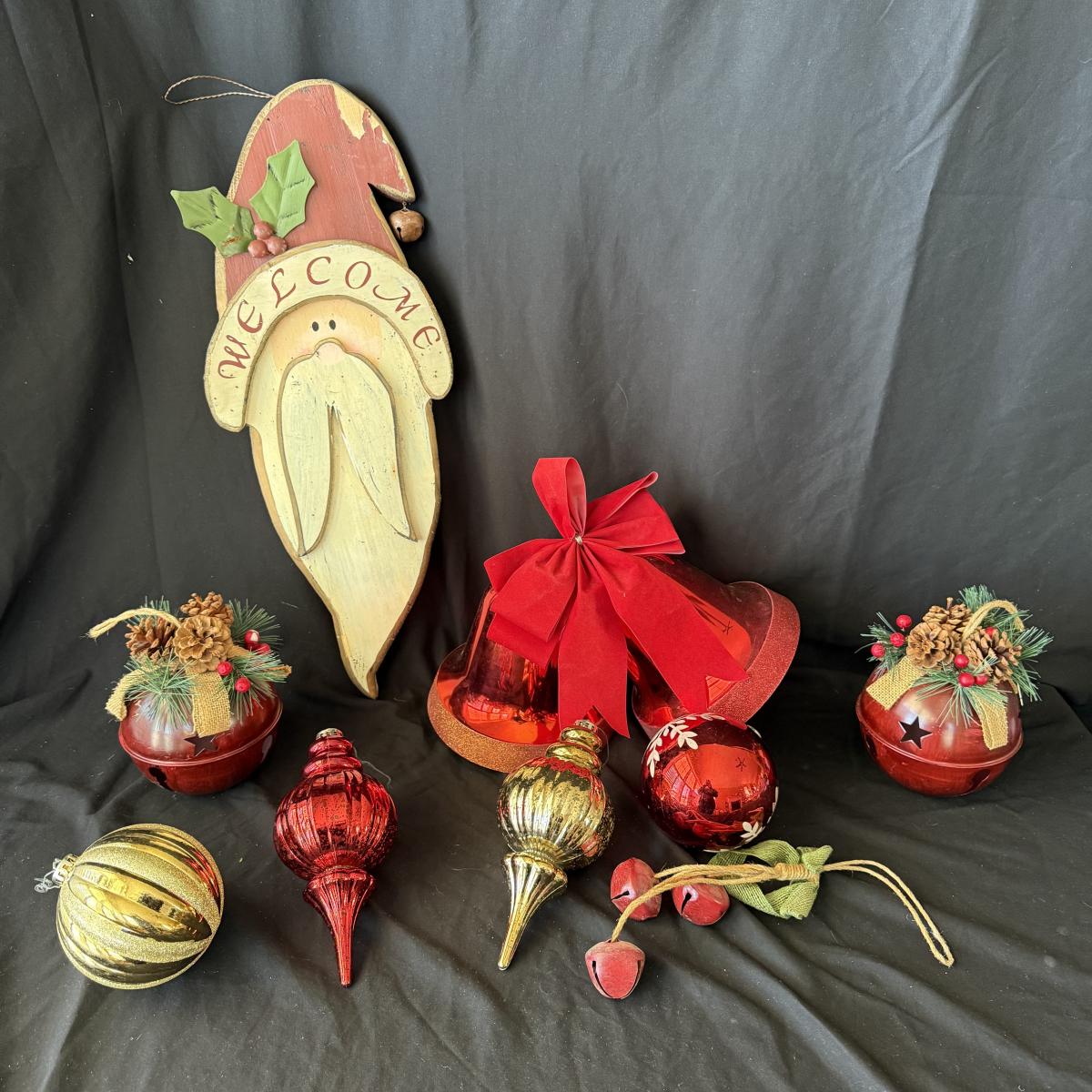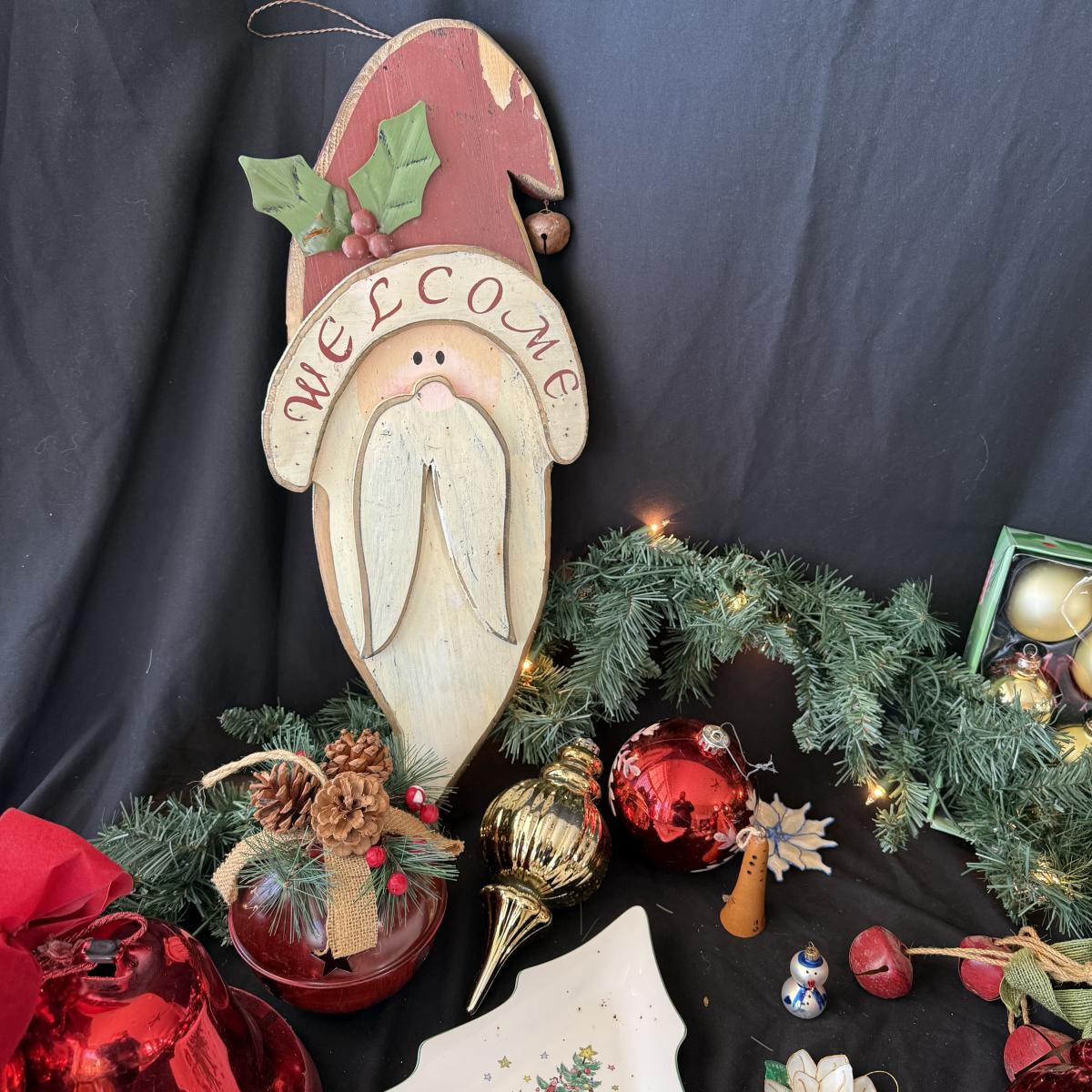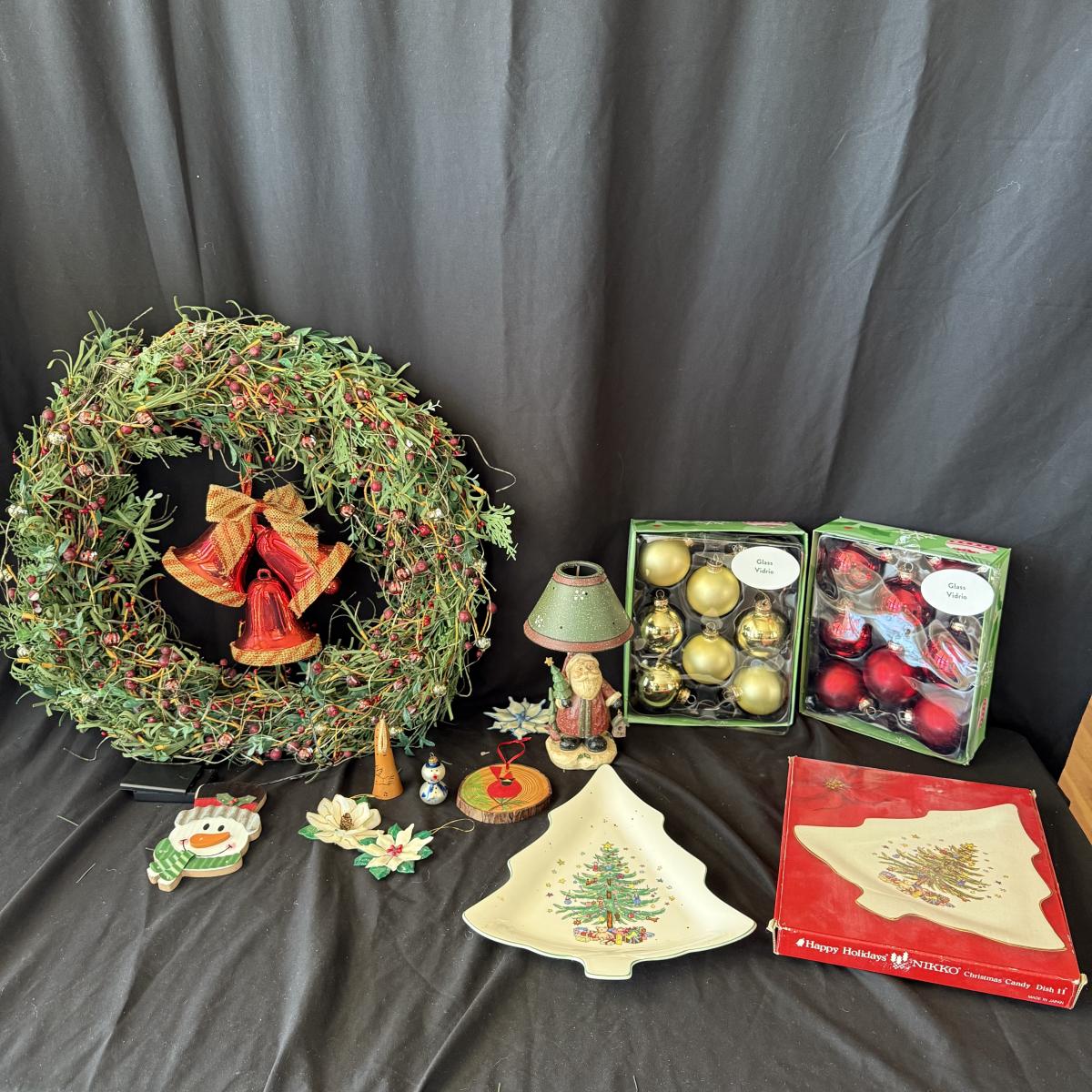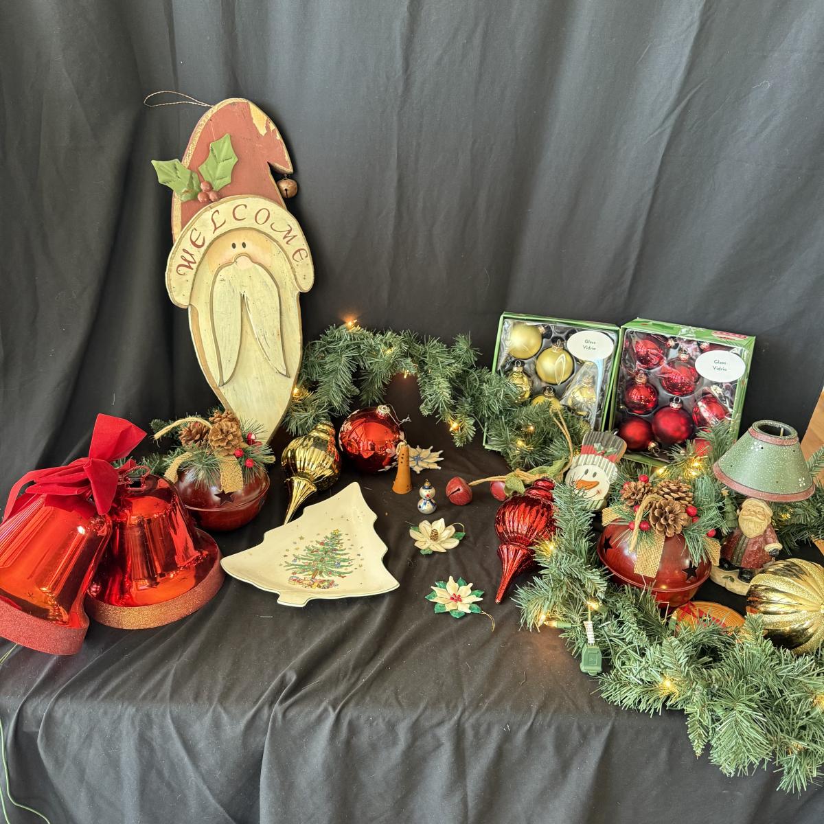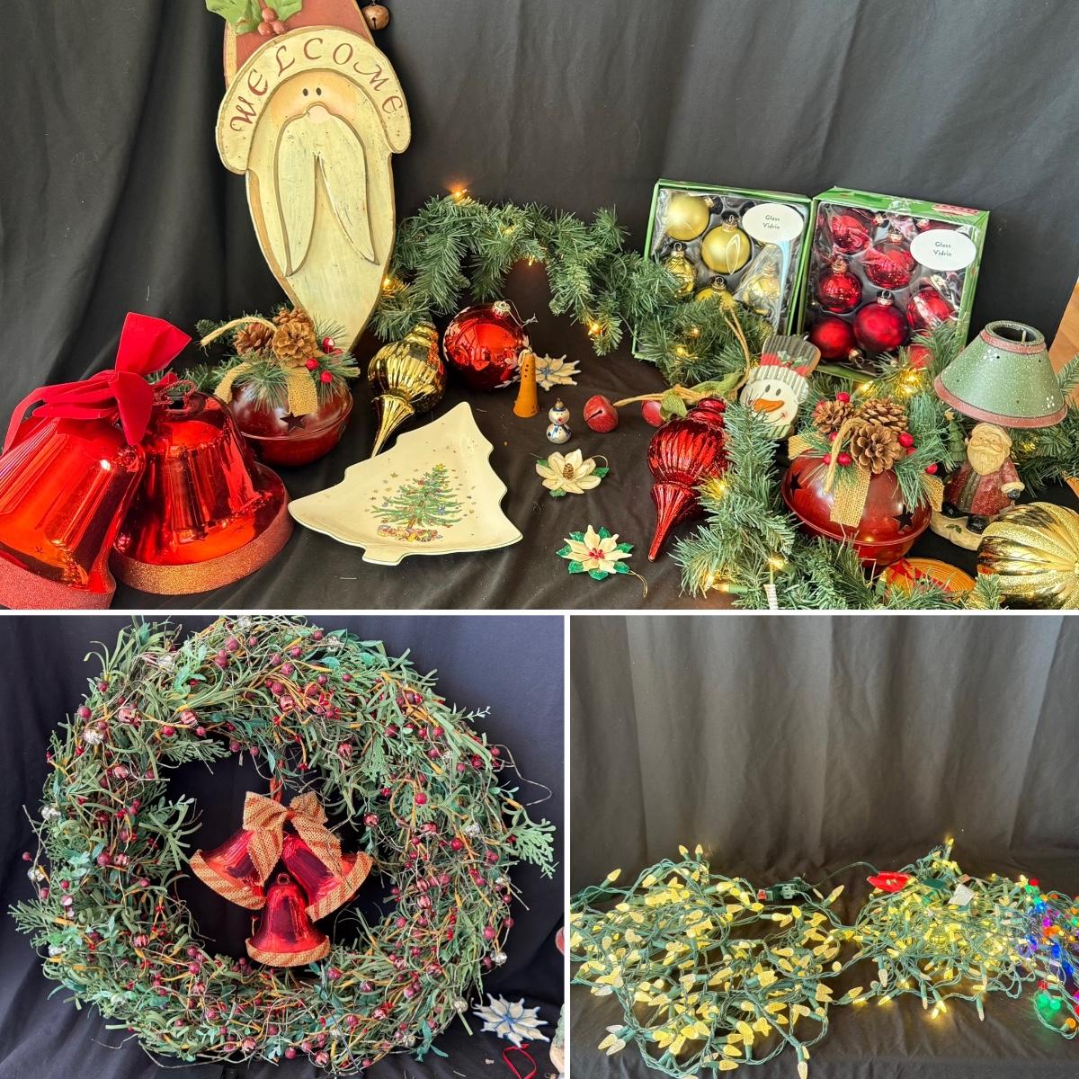 This lot contains all your Christmas needs! Included is some green garland with lights, a Winter Berry Wreath by Wreath Depot, four giant plastic ornaments, two giant plastic decorative bells, two giant metal jingle bells with pinecones, a ‘Welcome’ Santa sign, a Nikko Christmas tree plate, a set of red glass bulb ornaments, a set of gold glass bulb ornaments and seven strands of Christmas lights, including two snowflake Christmas lights. The Winter Berry Wreath measures 20”D x 5”, takes AA batteries, and was not tested. See pictures for full inventory.