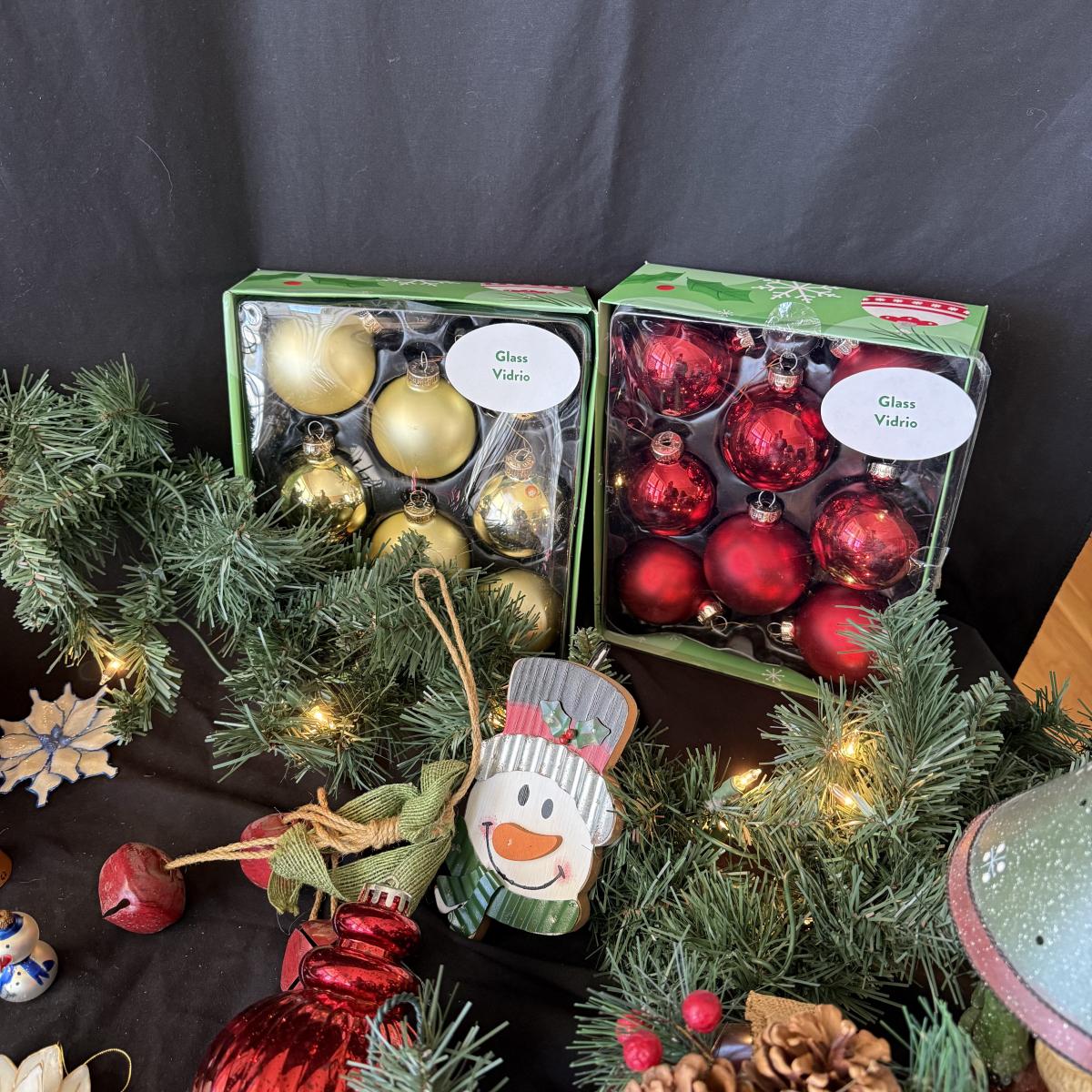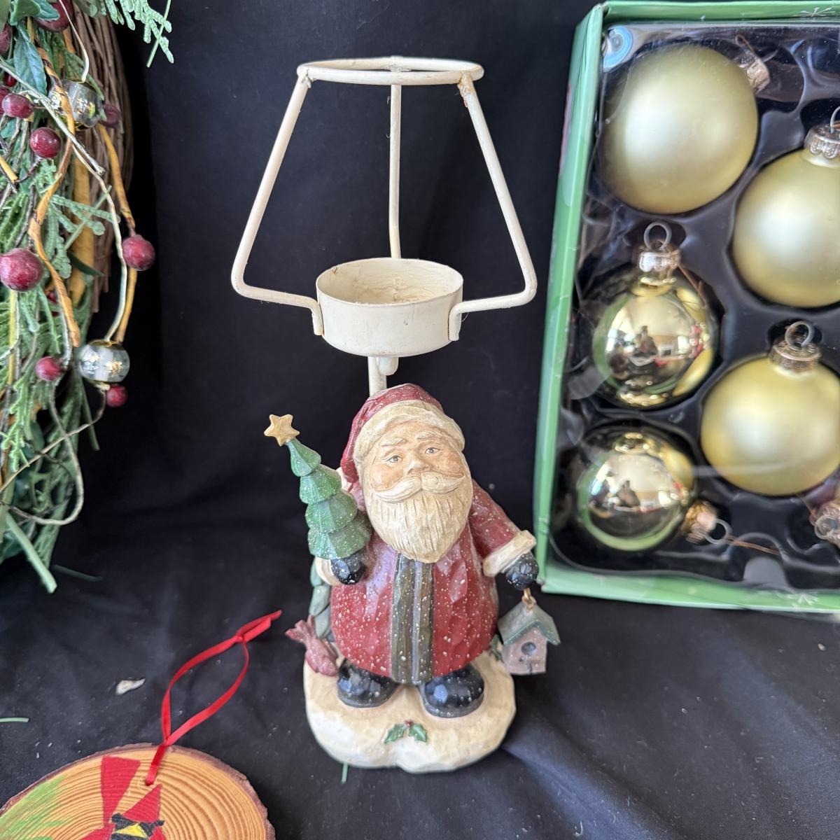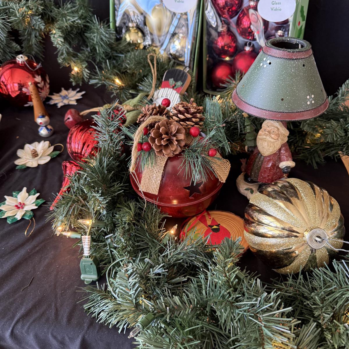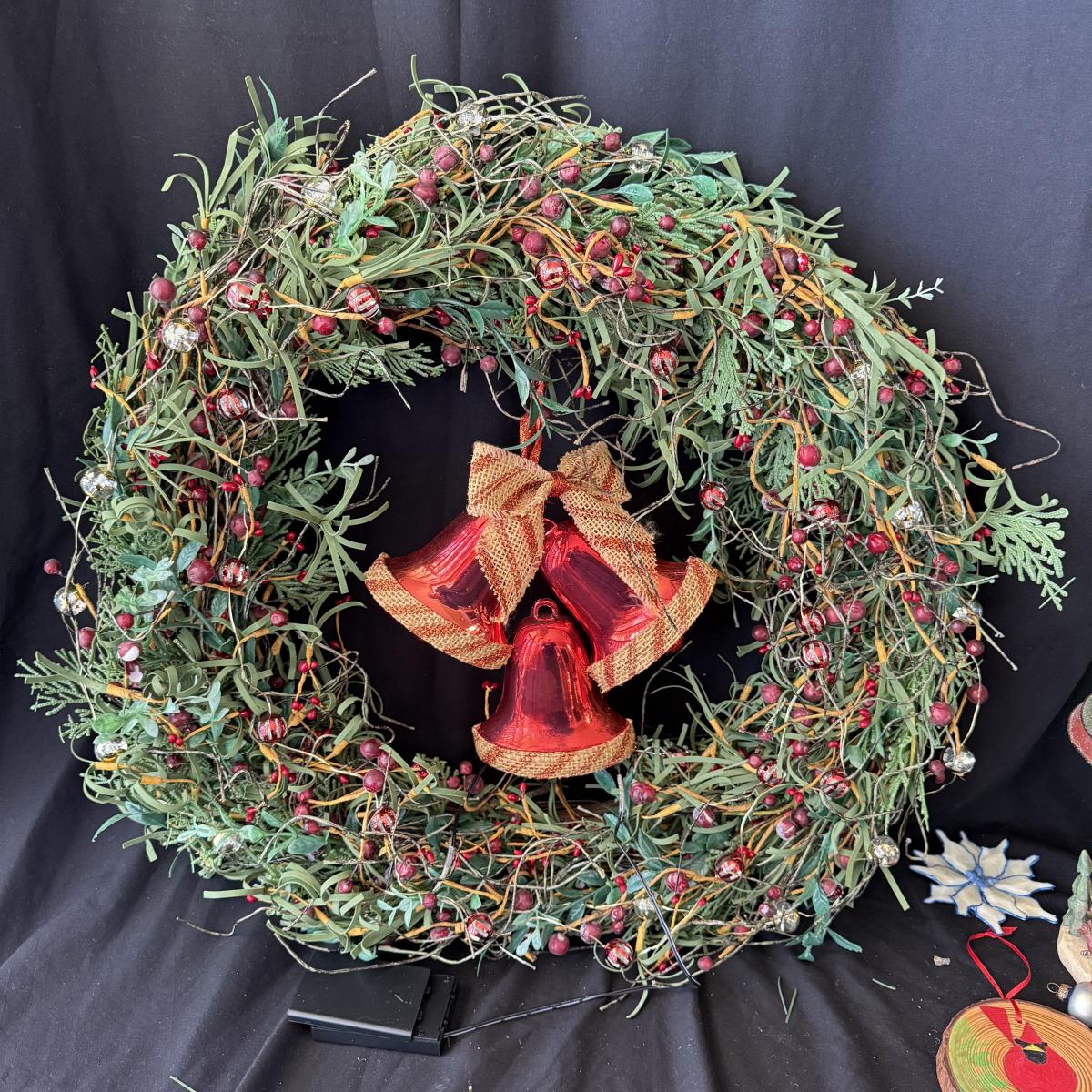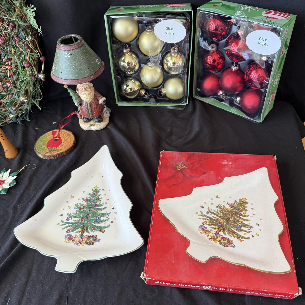 This lot contains all your Christmas needs! Included is some green garland with lights, a Winter Berry Wreath by Wreath Depot, four giant plastic ornaments, two giant plastic decorative bells, two giant metal jingle bells with pinecones, a ‘Welcome’ Santa sign, a Nikko Christmas tree plate, a set of red glass bulb ornaments, a set of gold glass bulb ornaments and seven strands of Christmas lights, including two snowflake Christmas lights. The Winter Berry Wreath measures 20”D x 5”, takes AA batteries, and was not tested. See pictures for full inventory.
