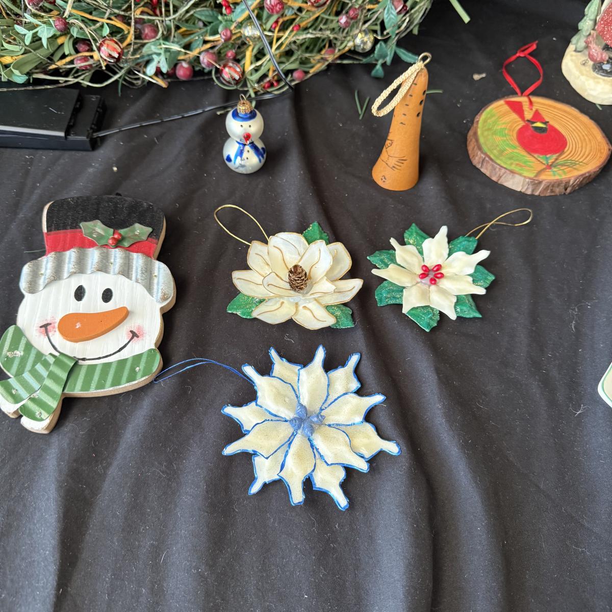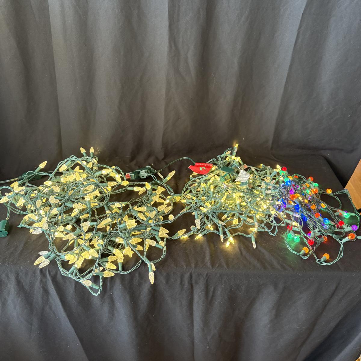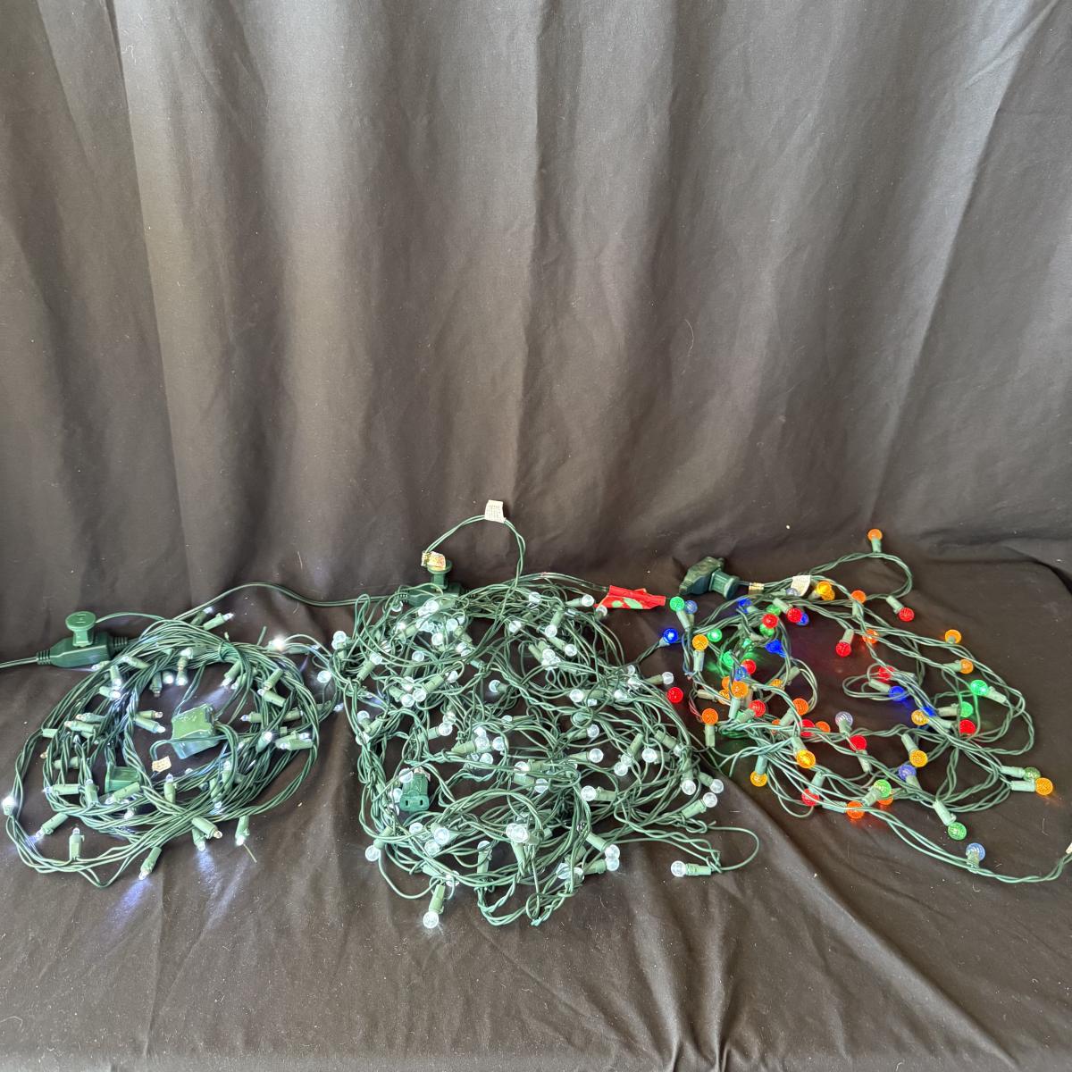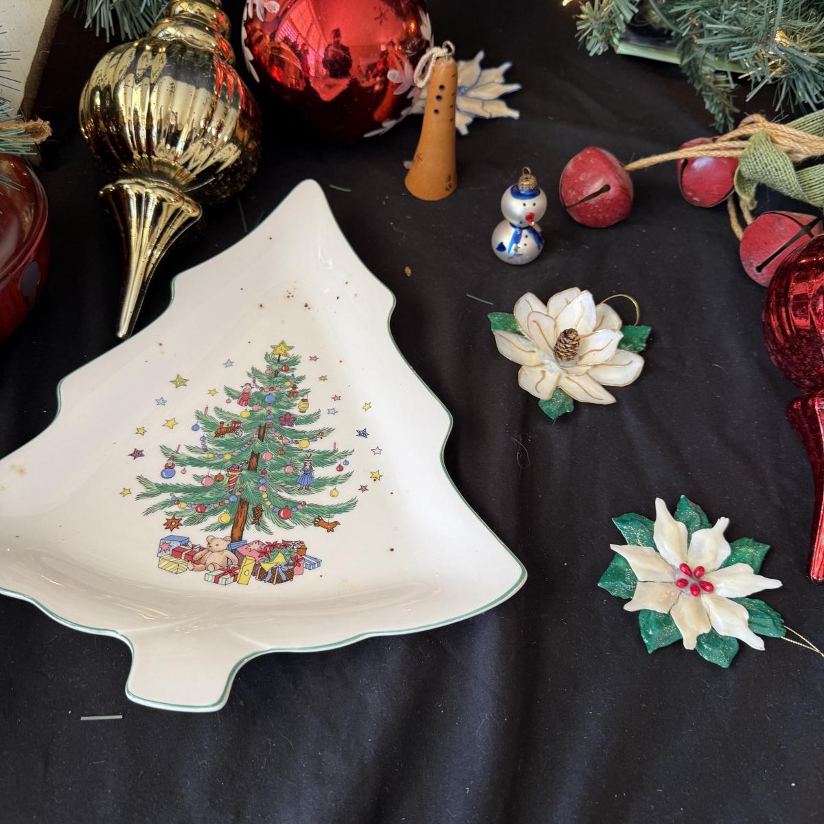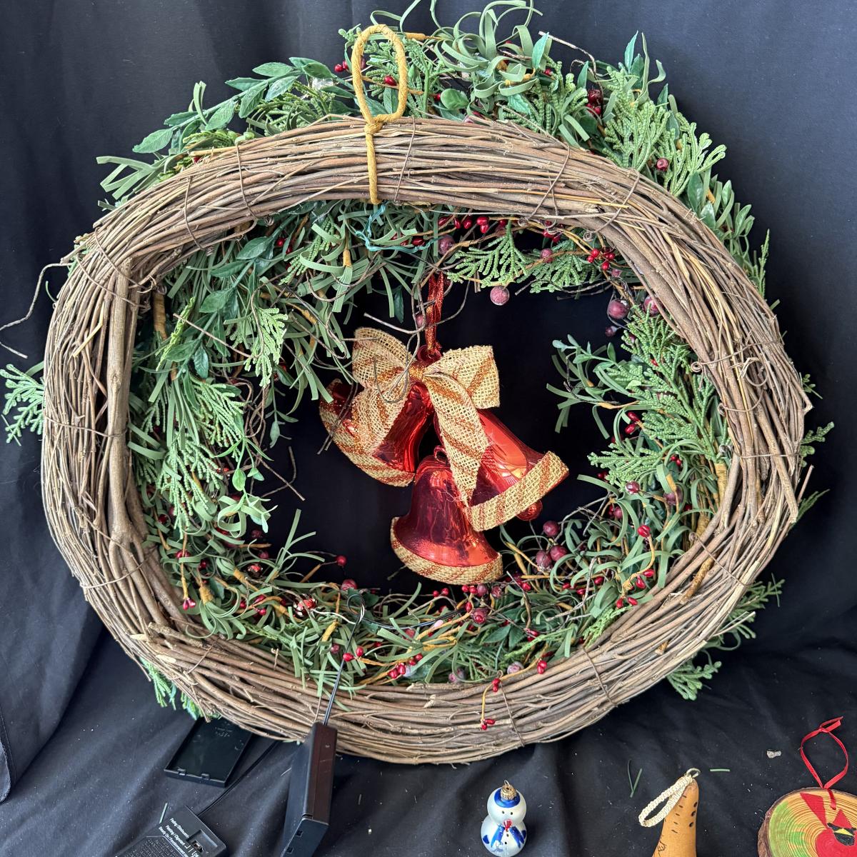 This lot contains all your Christmas needs! Included is some green garland with lights, a Winter Berry Wreath by Wreath Depot, four giant plastic ornaments, two giant plastic decorative bells, two giant metal jingle bells with pinecones, a ‘Welcome’ Santa sign, a Nikko Christmas tree plate, a set of red glass bulb ornaments, a set of gold glass bulb ornaments and seven strands of Christmas lights, including two snowflake Christmas lights. The Winter Berry Wreath measures 20”D x 5”, takes AA batteries, and was not tested. See pictures for full inventory.