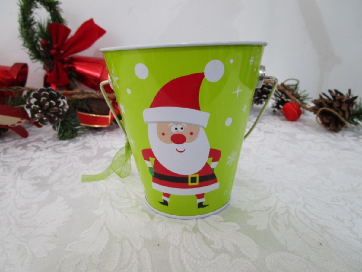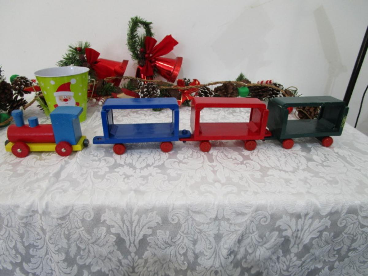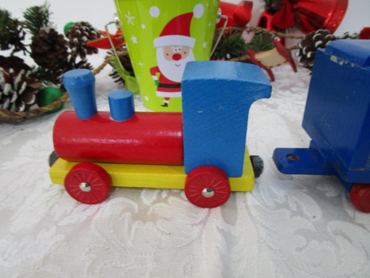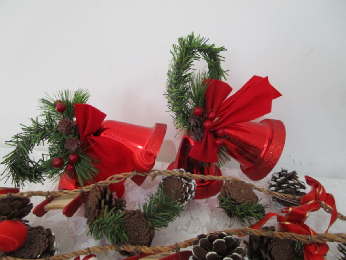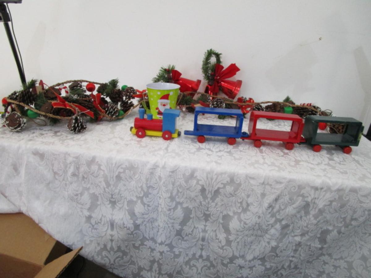 2 garlands are 5-1/2' each, wooden train, metal painted Christmas bucket, 2 sets of red Christmas bells