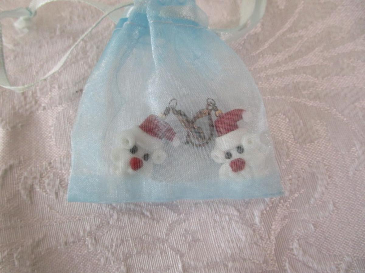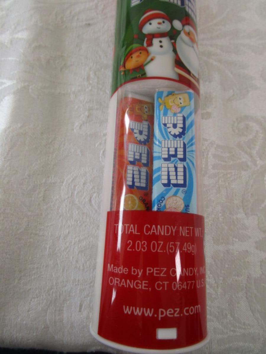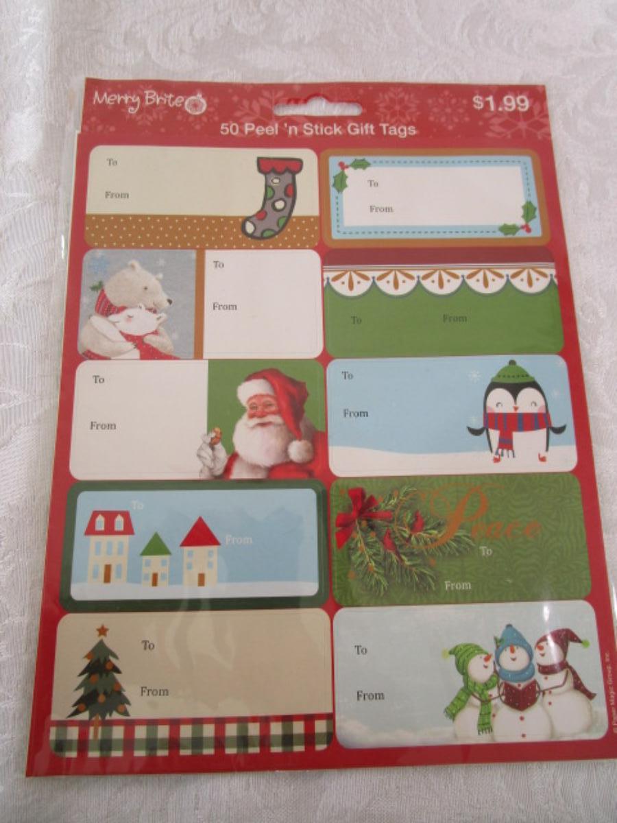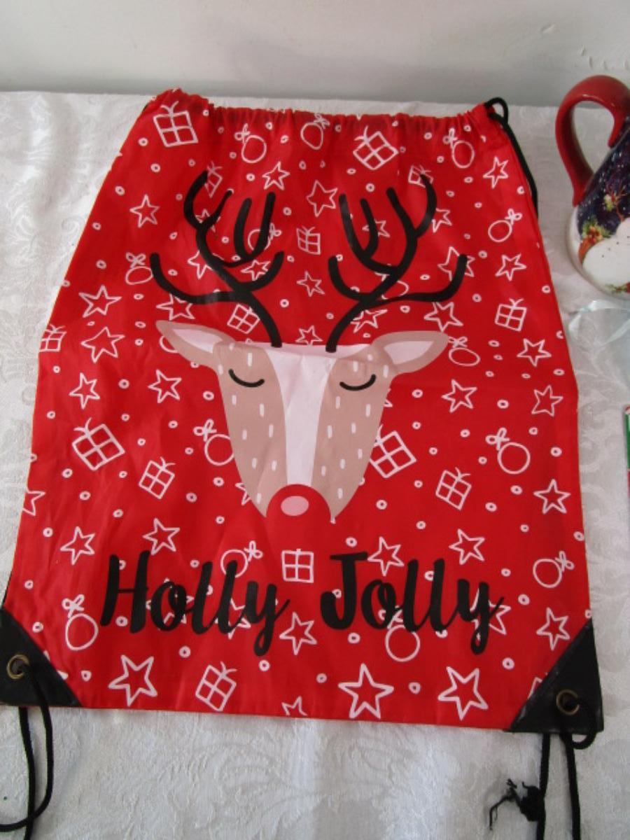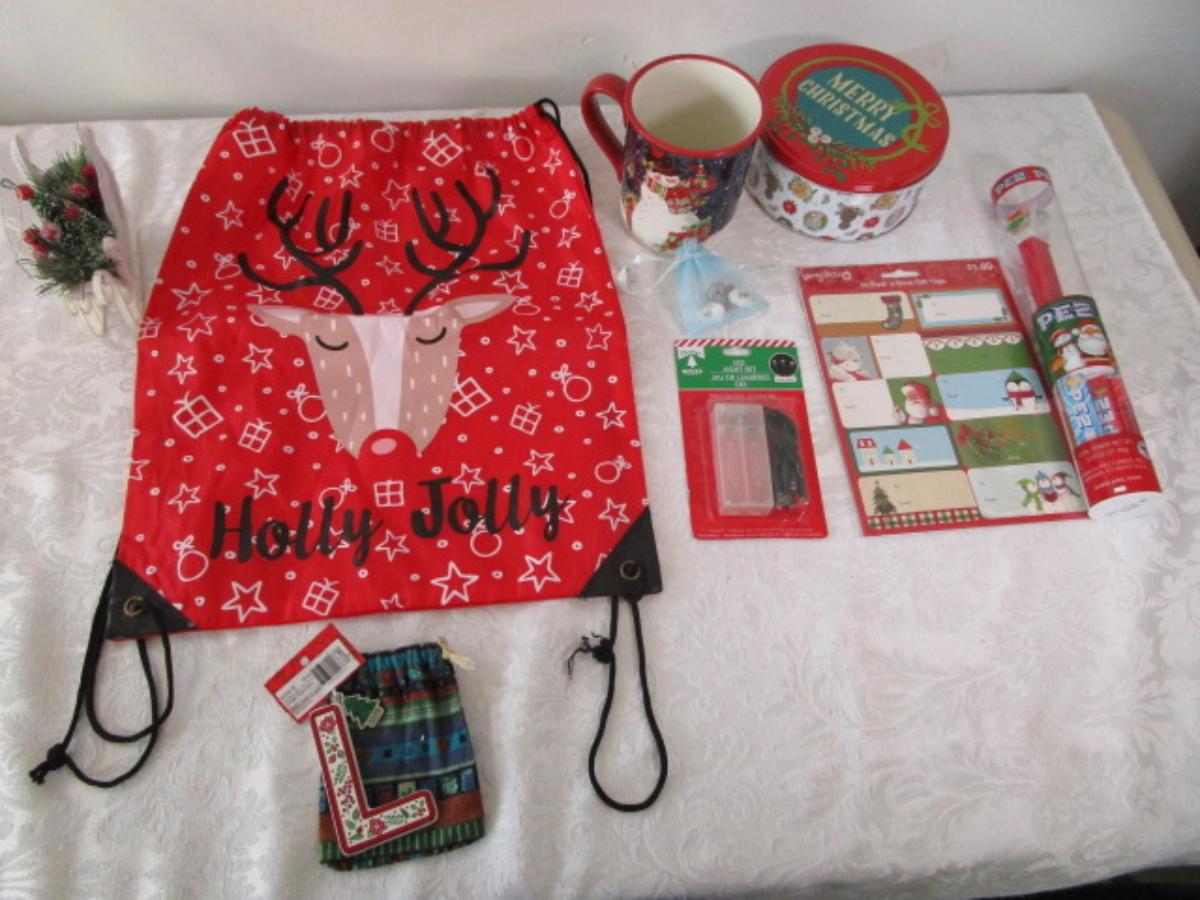 String backpack, mug, Santa earrings, gift labels, new small string of lights (take 2 AA batteries not included), large Pez container, round Christmas tin, 2 ornaments