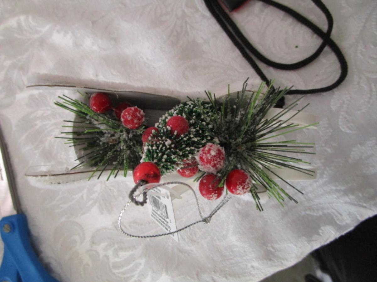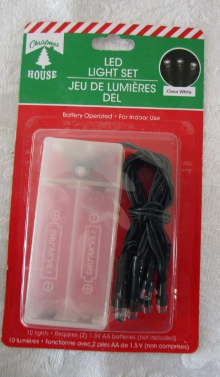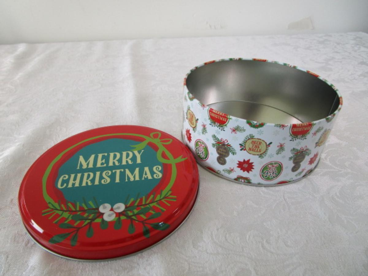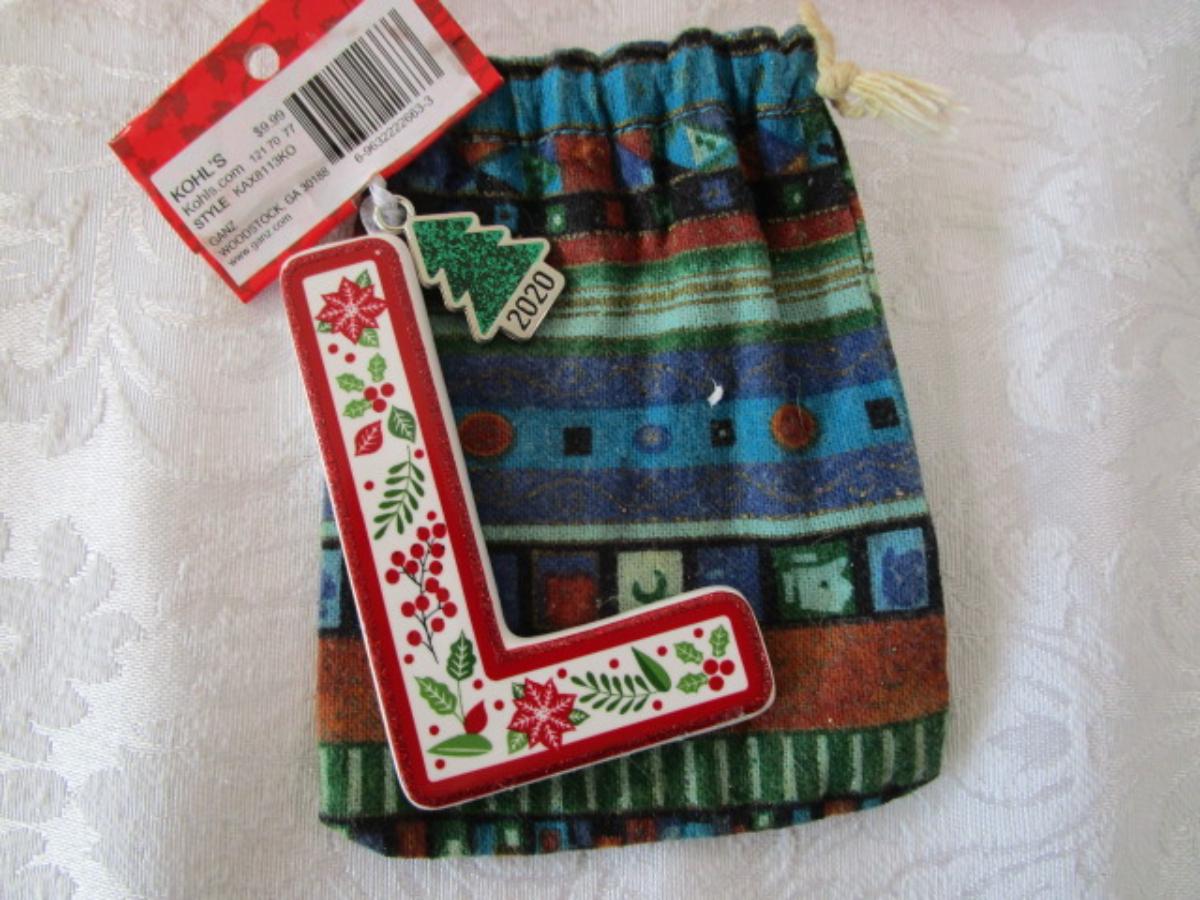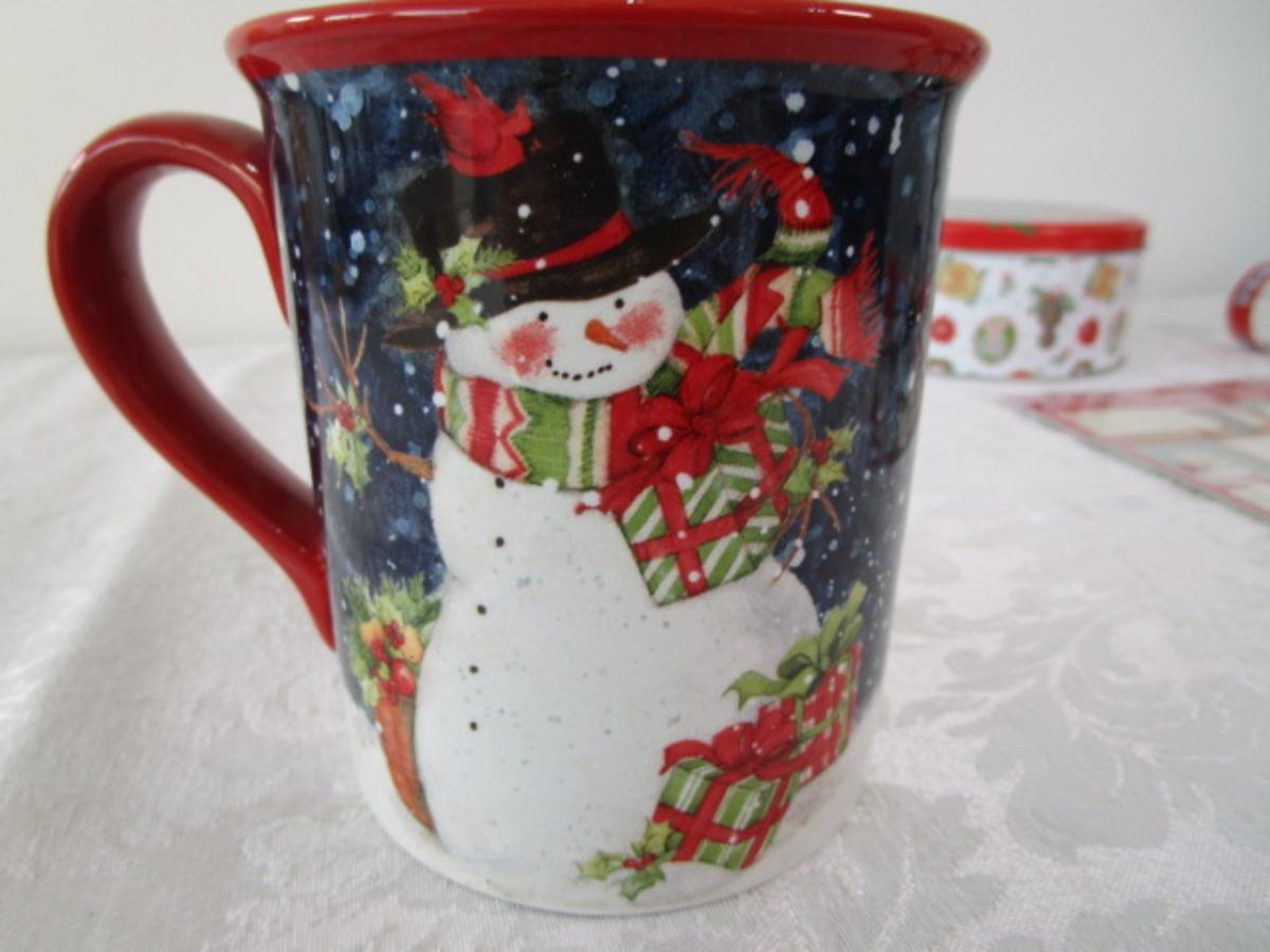 String backpack, mug, Santa earrings, gift labels, new small string of lights (take 2 AA batteries not included), large Pez container, round Christmas tin, 2 ornaments