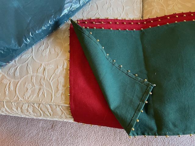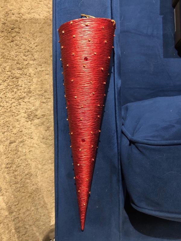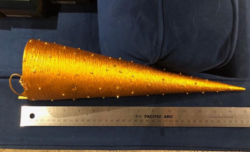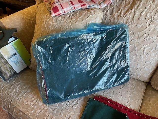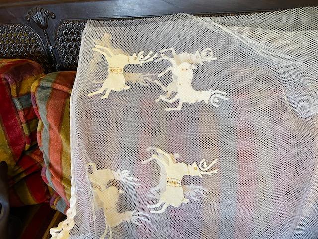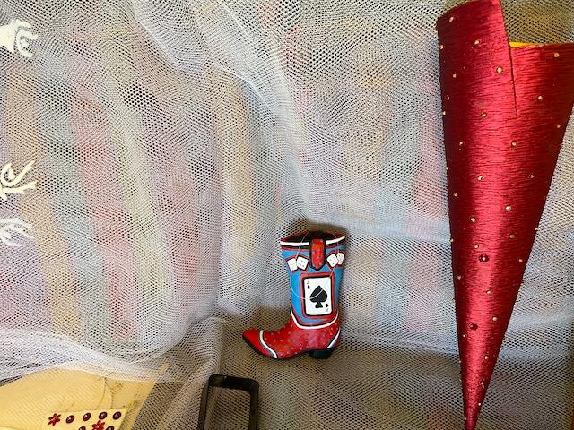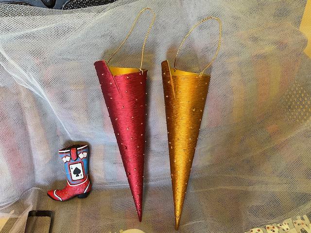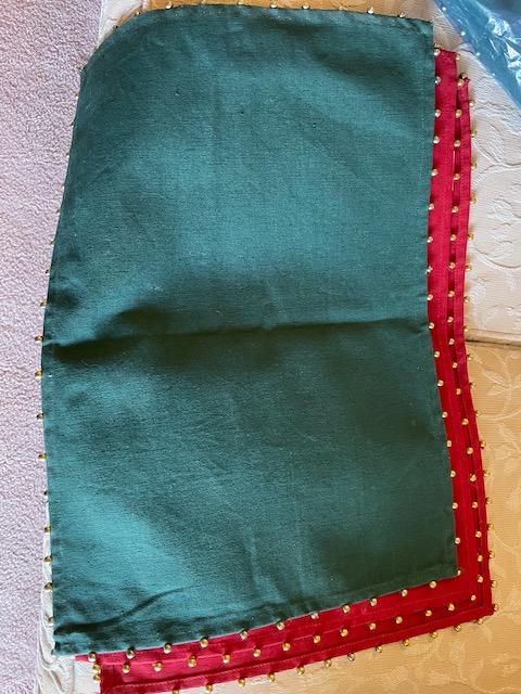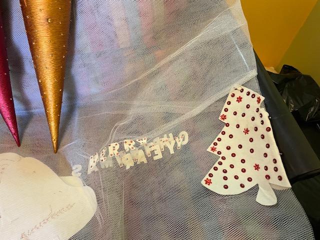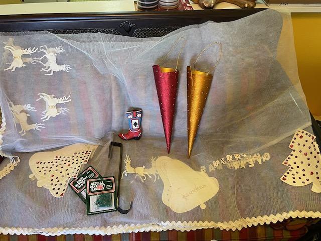 6 Placemats with bells, sheer fabric table overlay, 2 cornucopias, Boot ornament, wreath hanger and ornament hooks