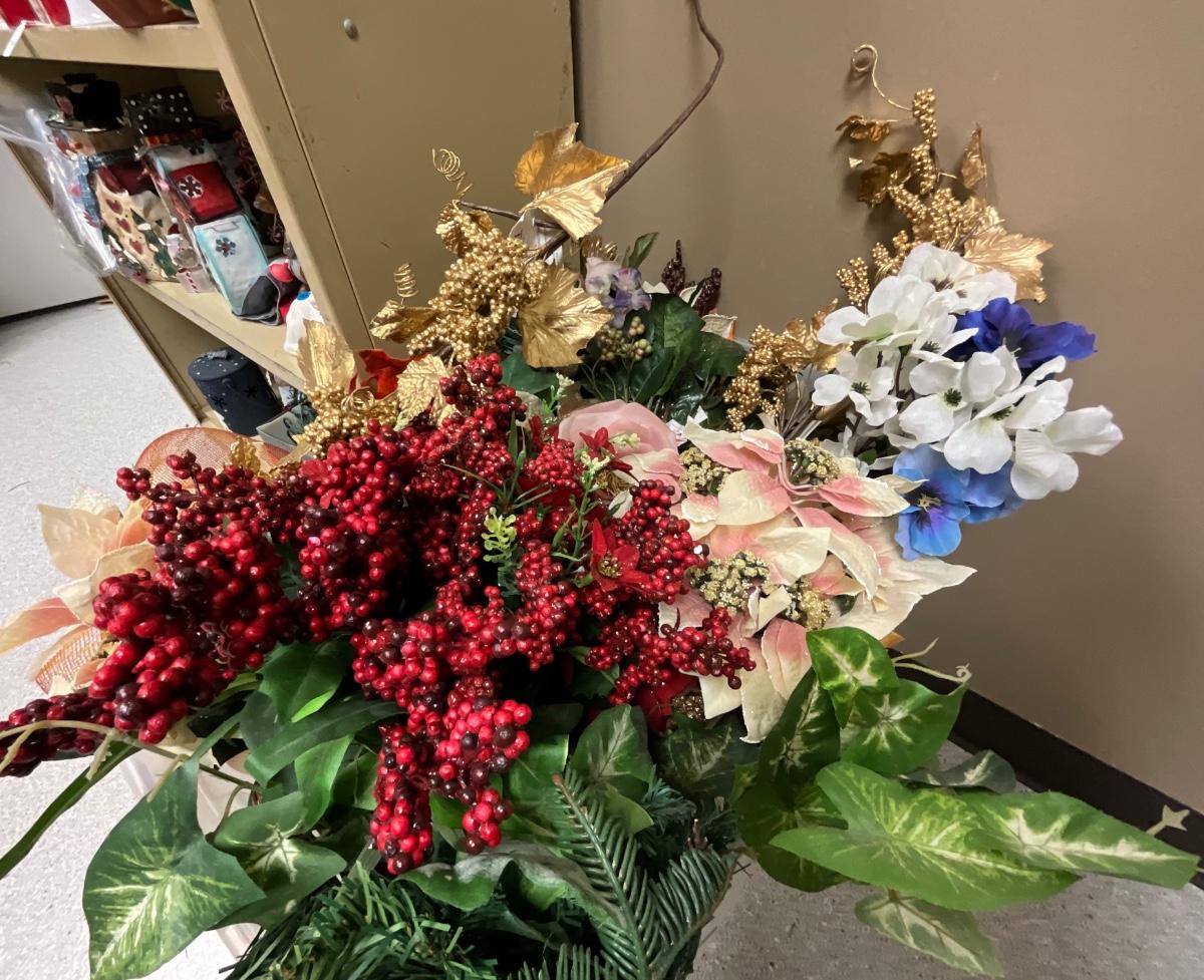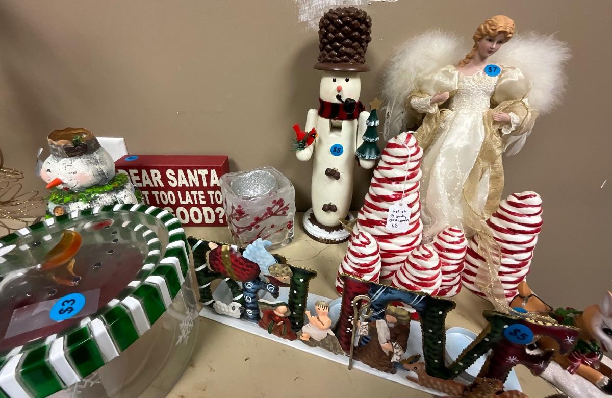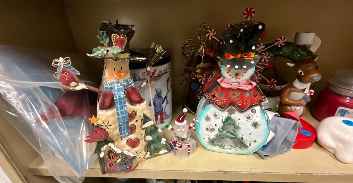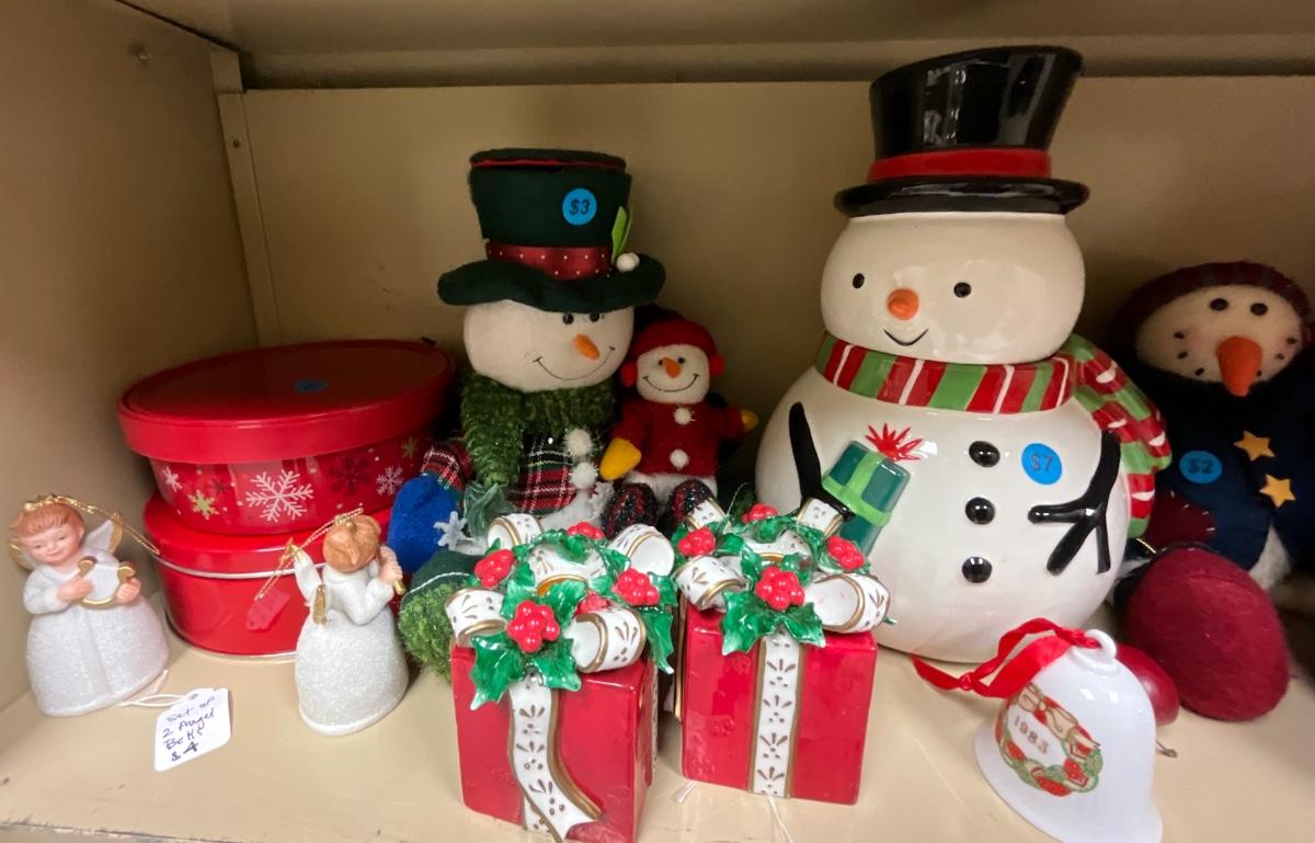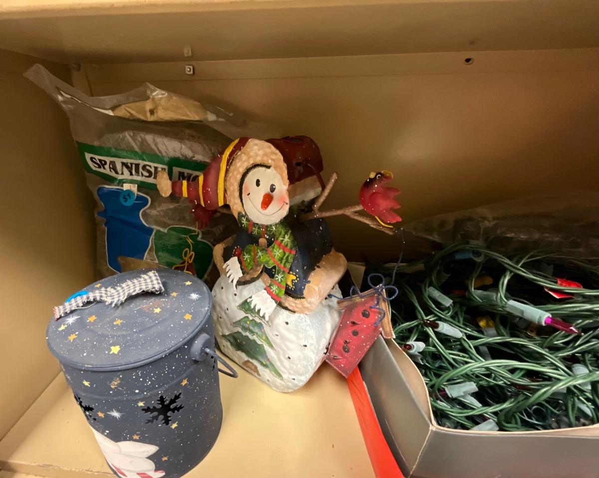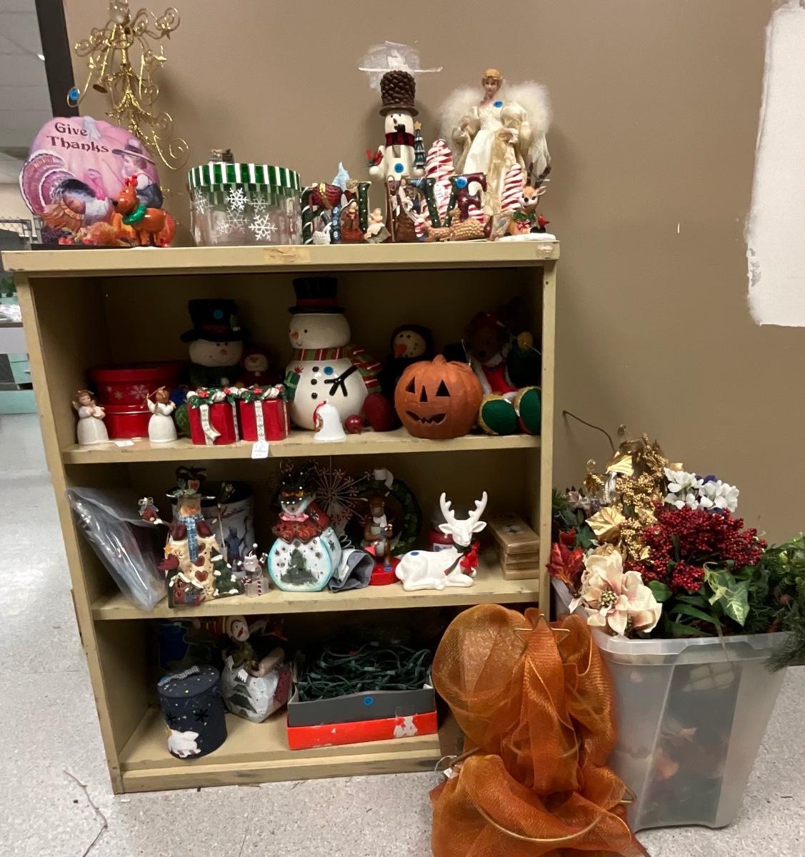 Christmas items with shelving unit
