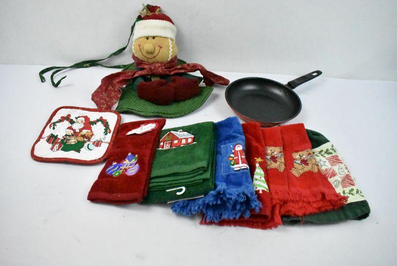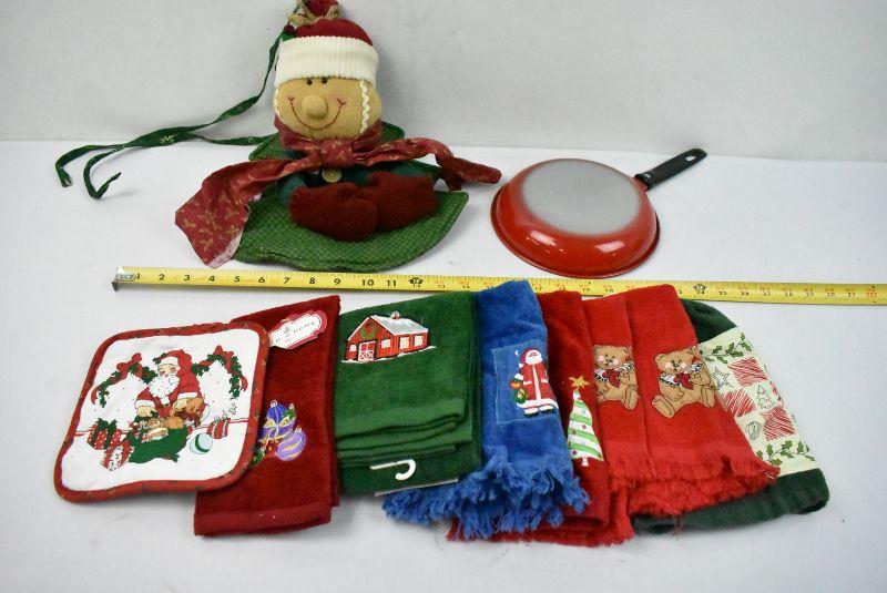 Christmas Kitchen Lot - 7 Hand Towels, Pan, Hot Pads & Decorative Hot Pad