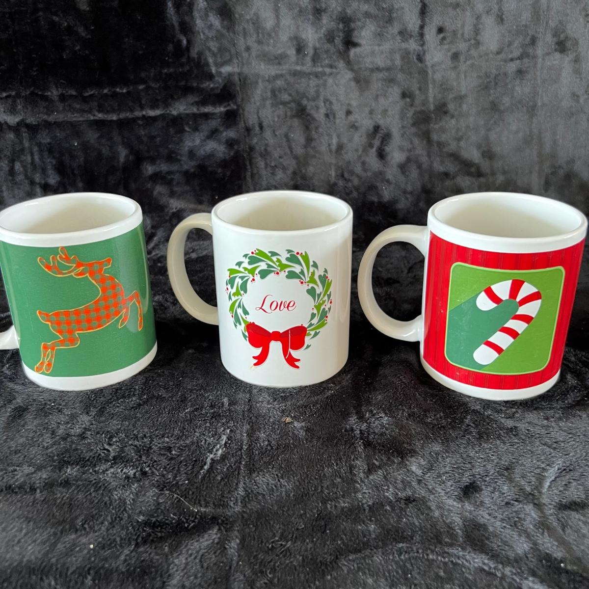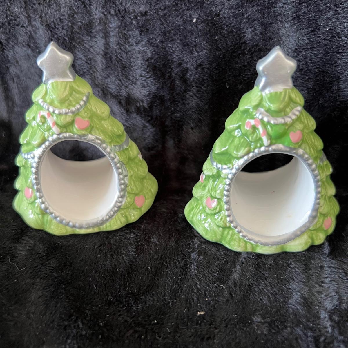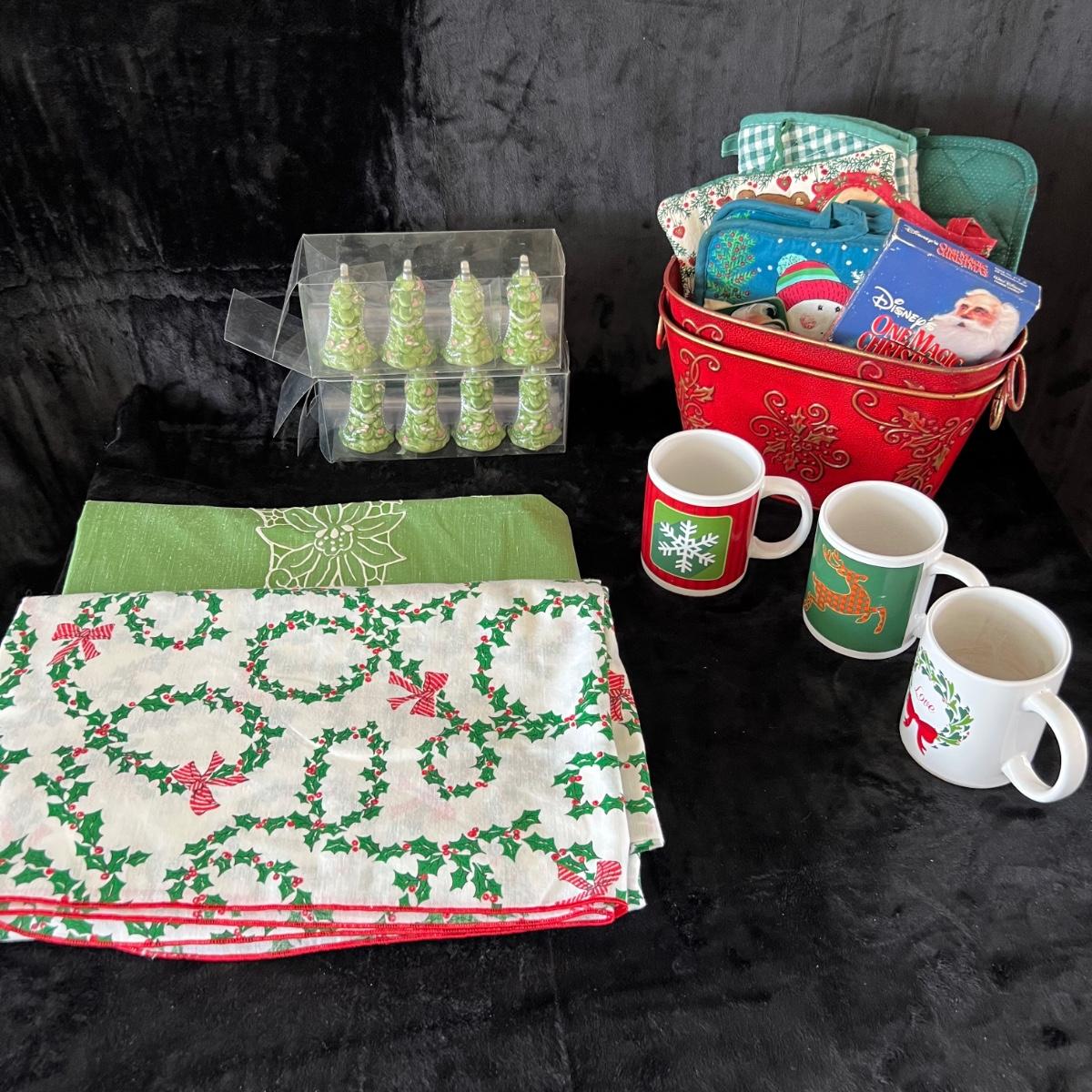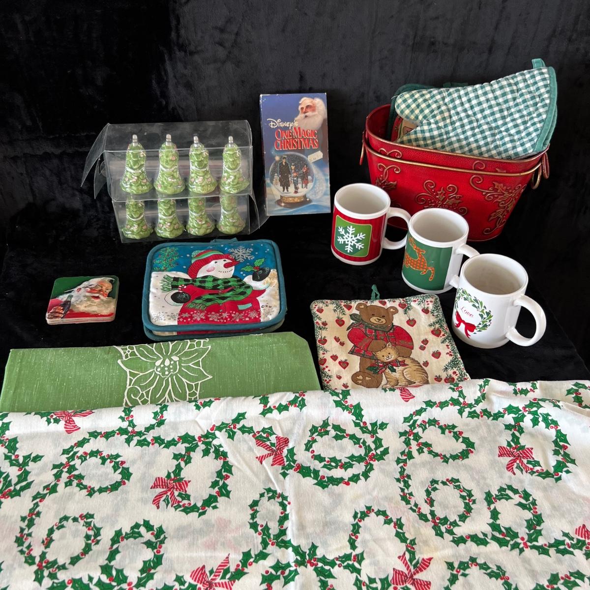 Eight ceramic Christmas Tree Napkin Rings, Two Red Metal Containers, Assortment of Christmas Pot Holders, Coffee Mugs and Santa Coasters.
