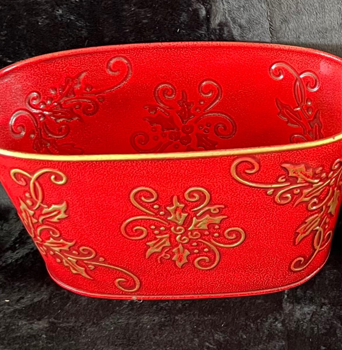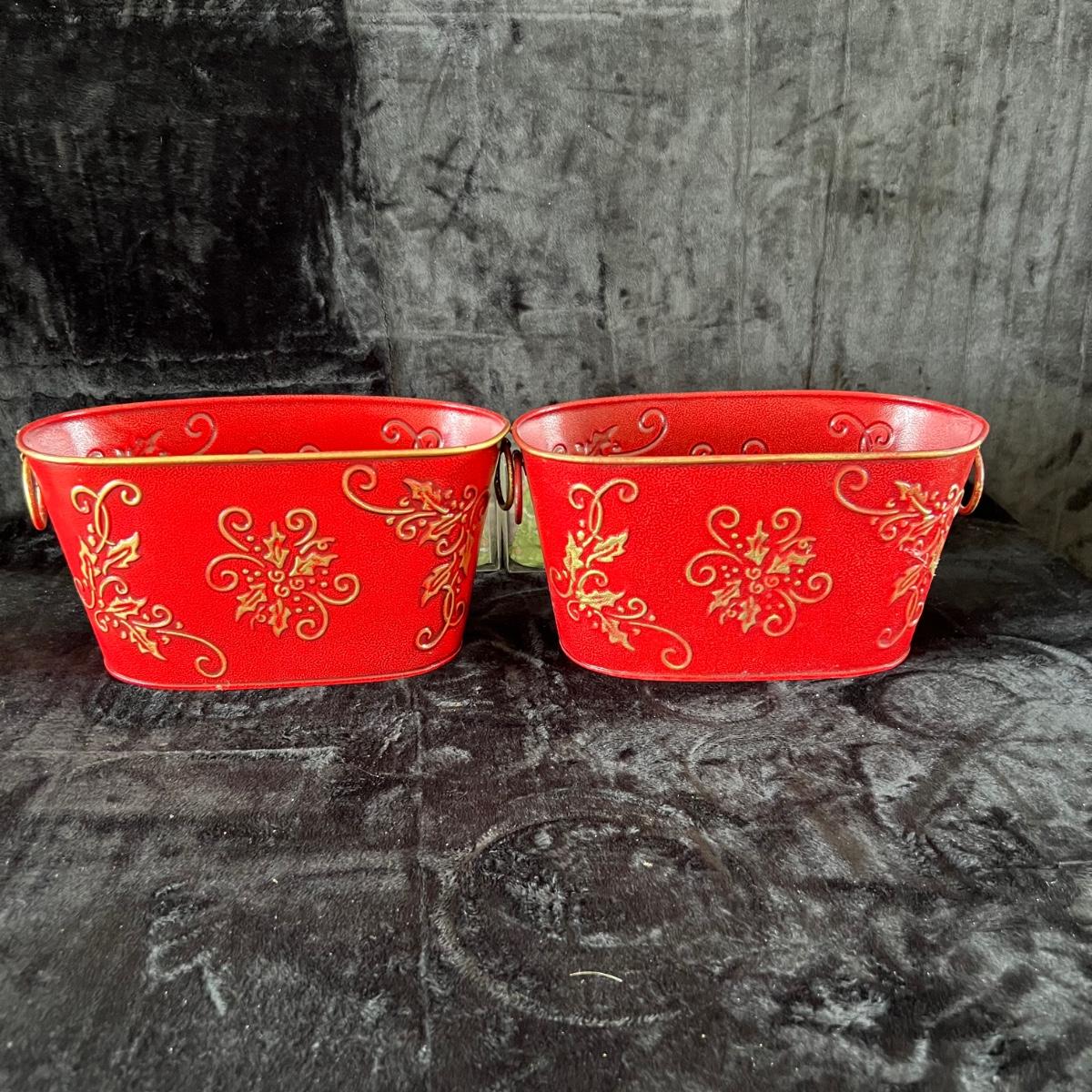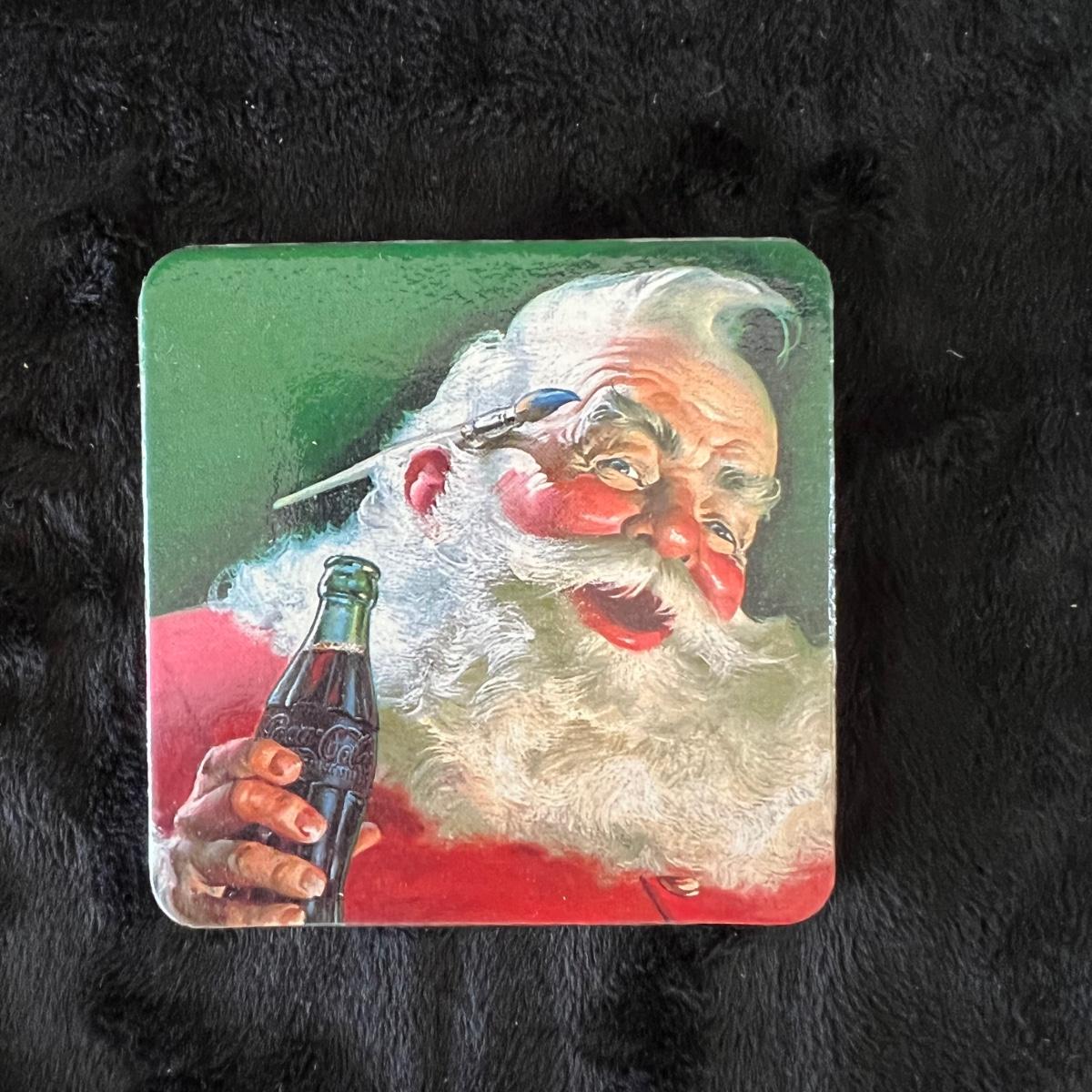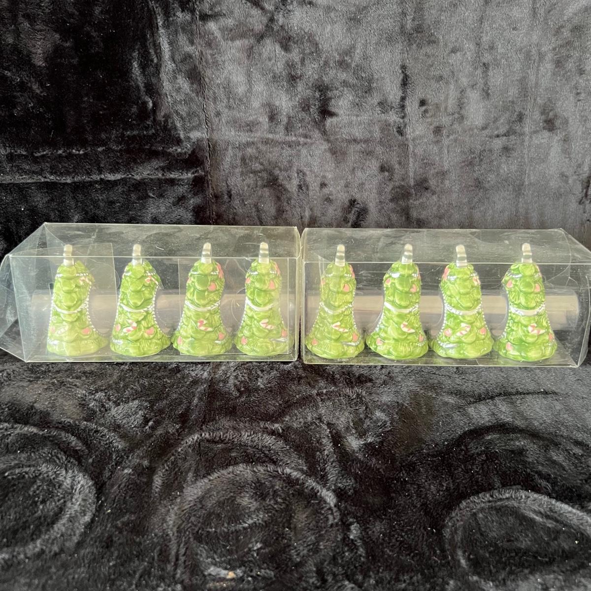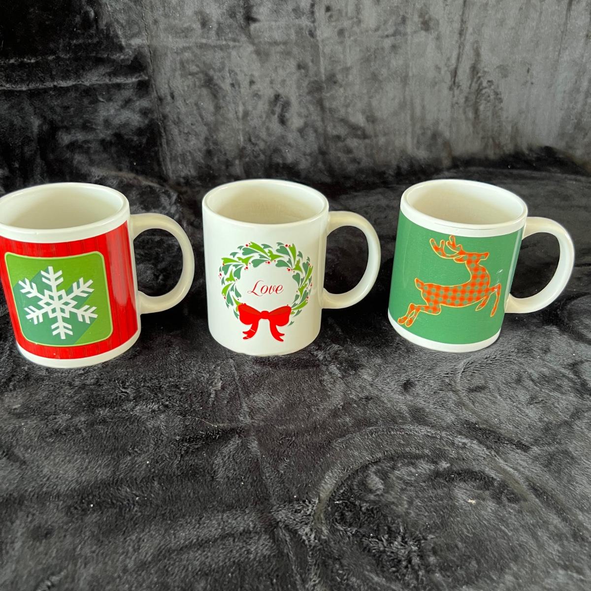 Eight ceramic Christmas Tree Napkin Rings, Two Red Metal Containers, Assortment of Christmas Pot Holders, Coffee Mugs and Santa Coasters.