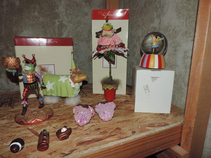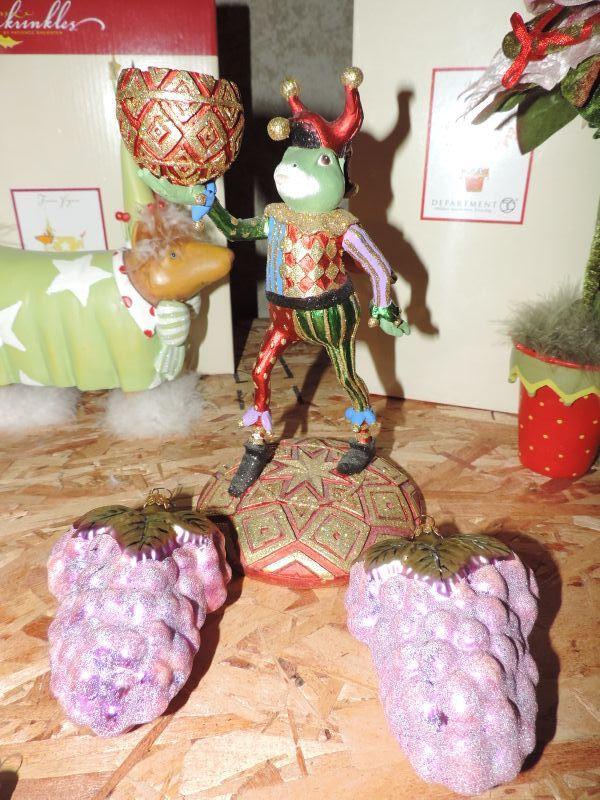 2 FROG KRINKLES. SHEEP KRINKLE, ICE SKATER SNOWGLOBE, GLASS ORNAMENTS-GRAPES AND SPORTS