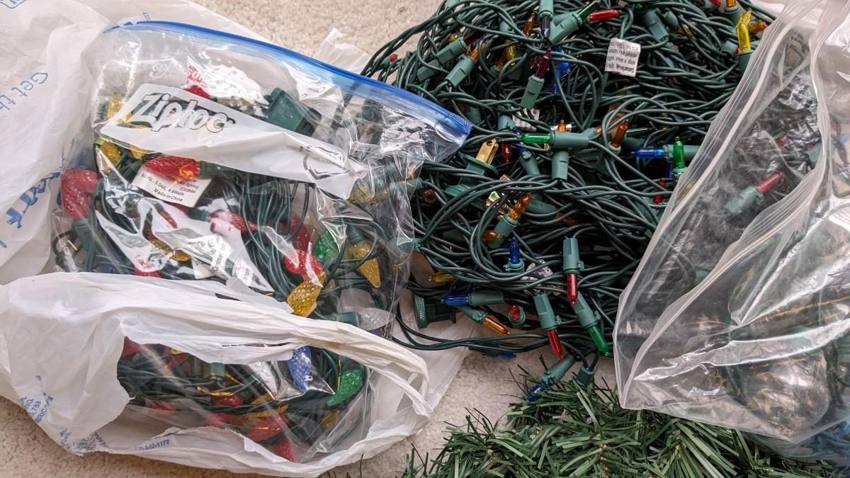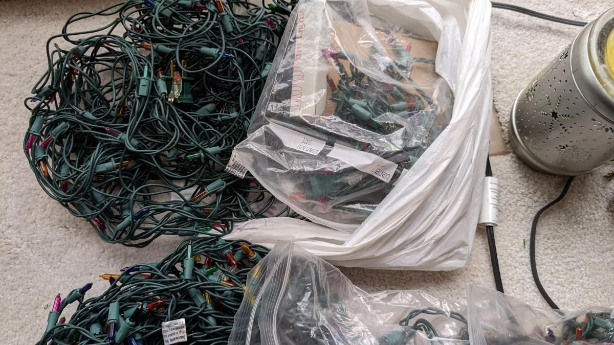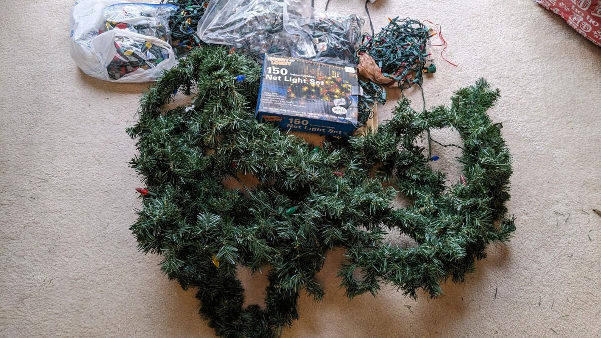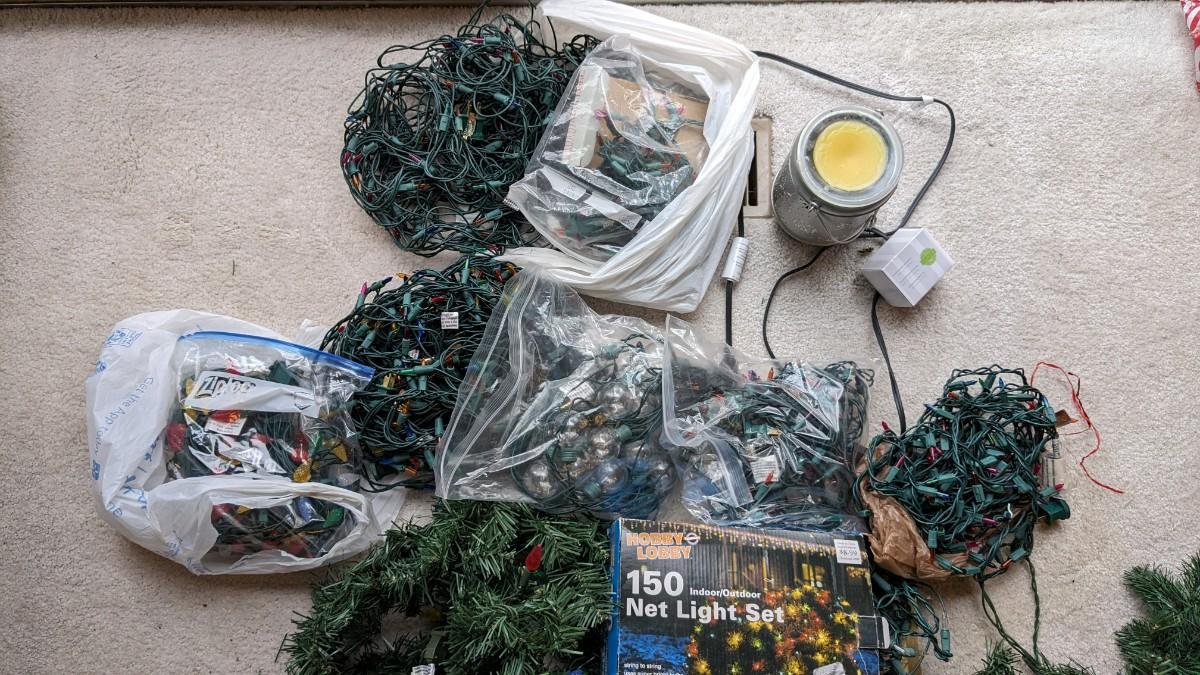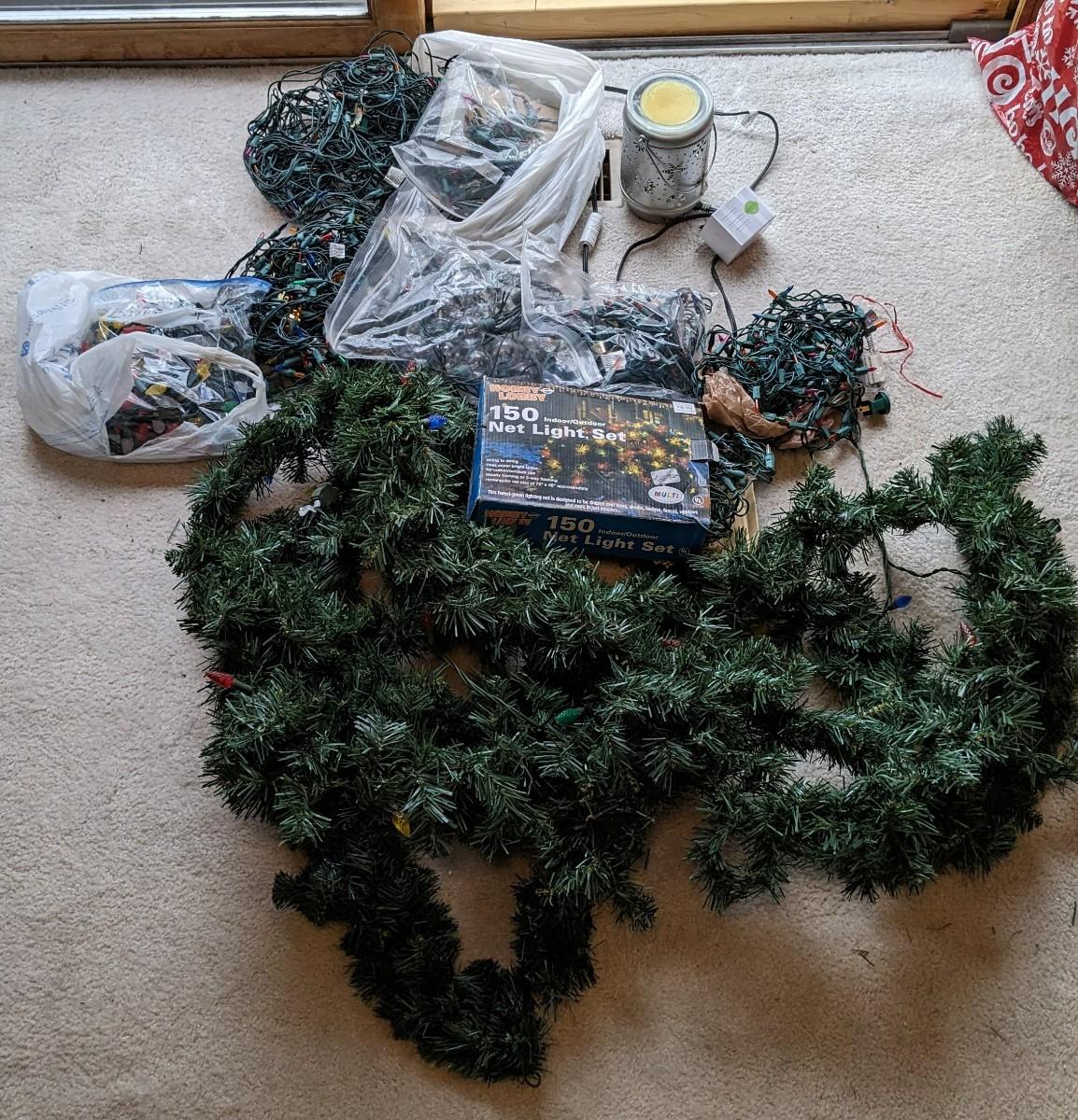 various strings of lights. Scentsy burner with extra bulb, and faux evergreen garland with lights strung inside. This is the only strand tested and operational, all lights are in good cosmetic condition. No shipping.