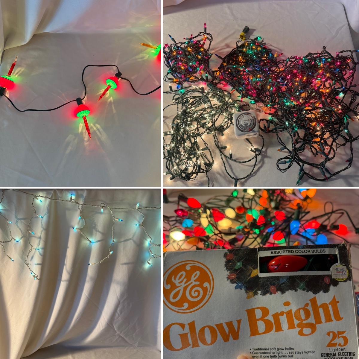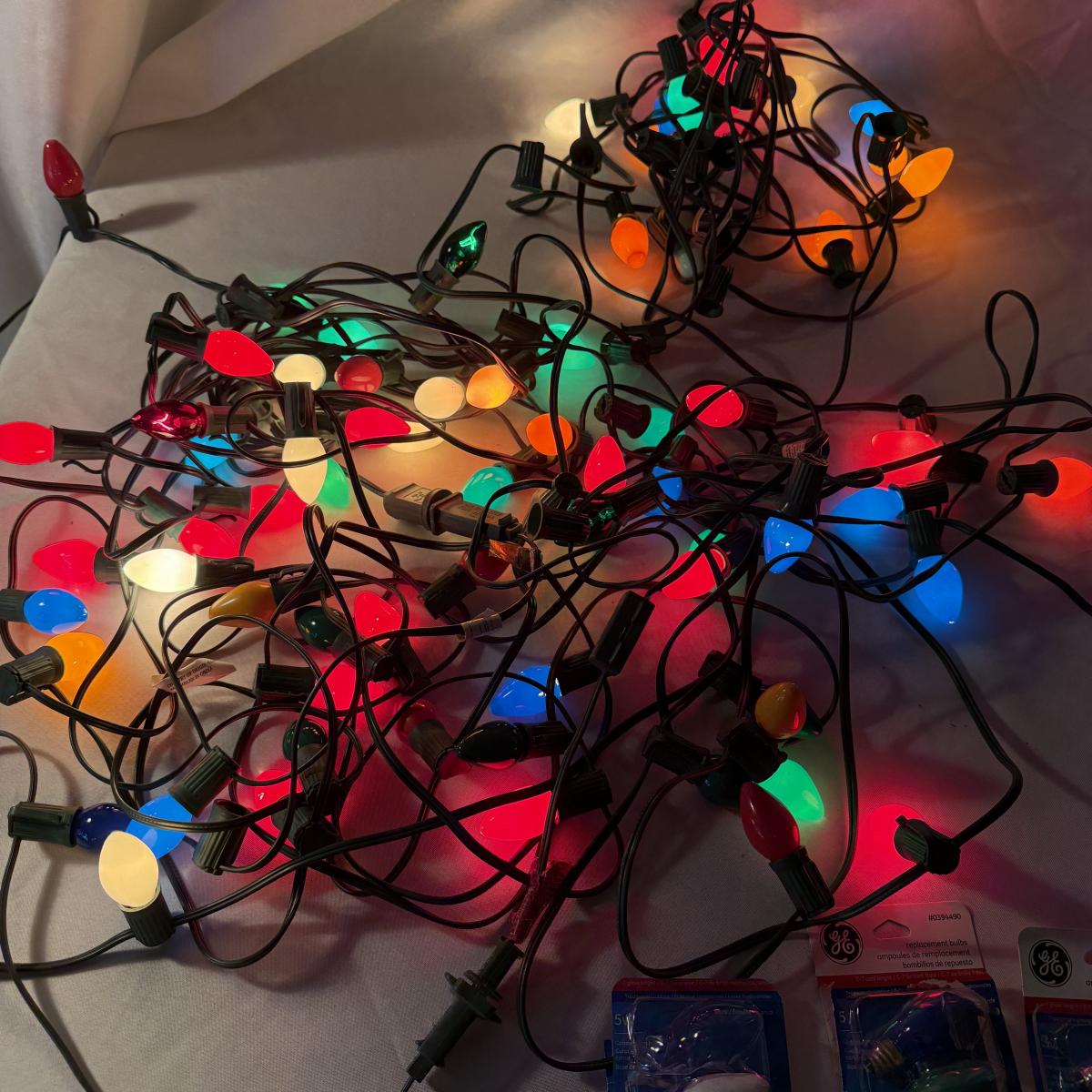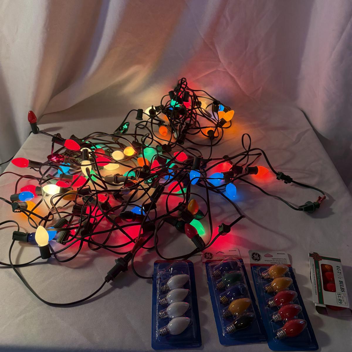 This lot contains a variety of Christmas lights, all lights featured powered on when plugged in. The first is a 7’ string of bubble lights. These lights are slightly finicky, and the “bubble” feature only seemed to work on some. Next is a box of Better Homes and Gardens 26’ LED battery operated fairy lights, a strand of green garland lights, and several strands of multicolored Christmas lights as well as a strand of white lights and a timer. Lot also holds bulb replacements. While the strands all powered on not all the bulbs did. See pictures for details. Shipping available.