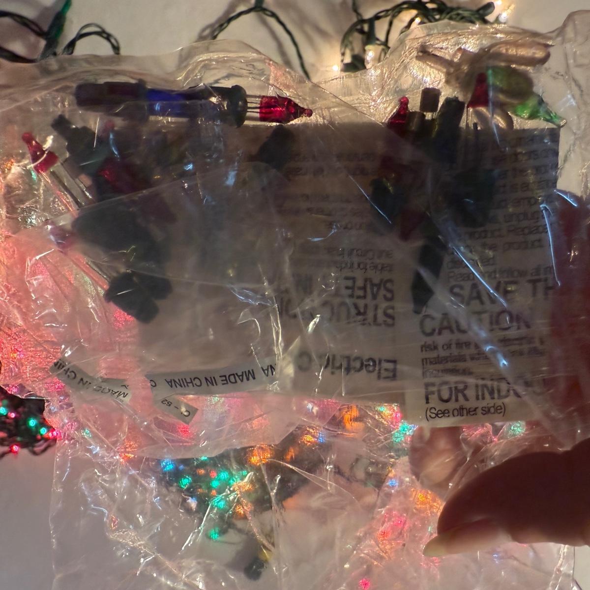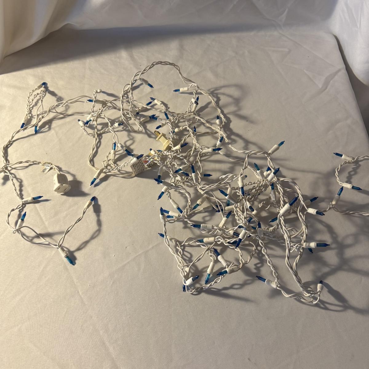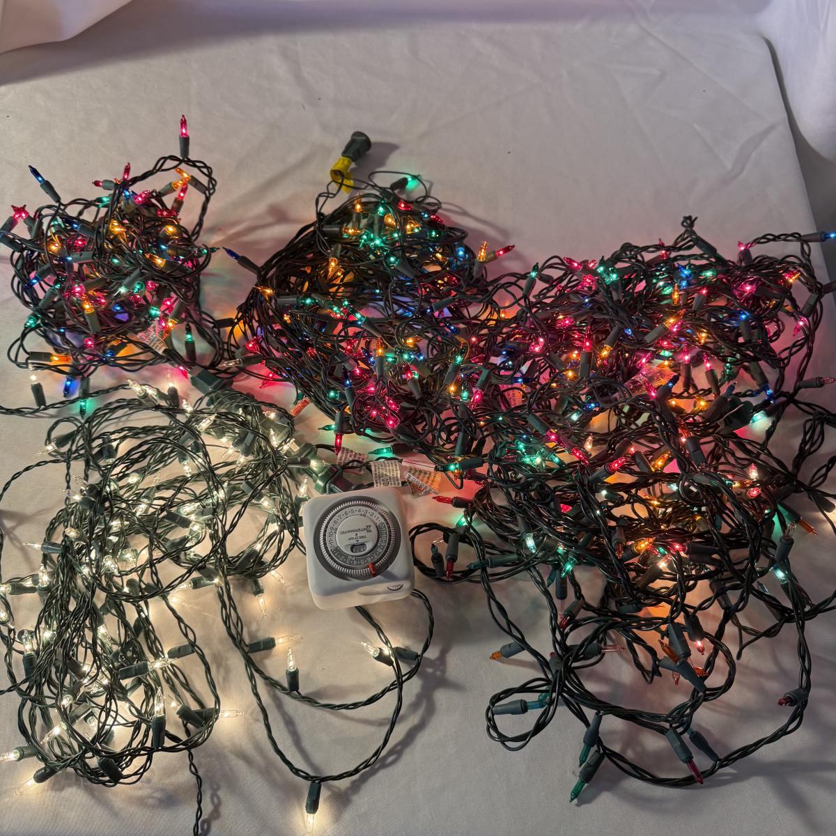 This lot contains a variety of Christmas lights, all lights featured powered on when plugged in. The first is a 7’ string of bubble lights. These lights are slightly finicky, and the “bubble” feature only seemed to work on some. Next is a box of Better Homes and Gardens 26’ LED battery operated fairy lights, a strand of green garland lights, and several strands of multicolored Christmas lights as well as a strand of white lights and a timer. Lot also holds bulb replacements. While the strands all powered on not all the bulbs did. See pictures for details. Shipping available.