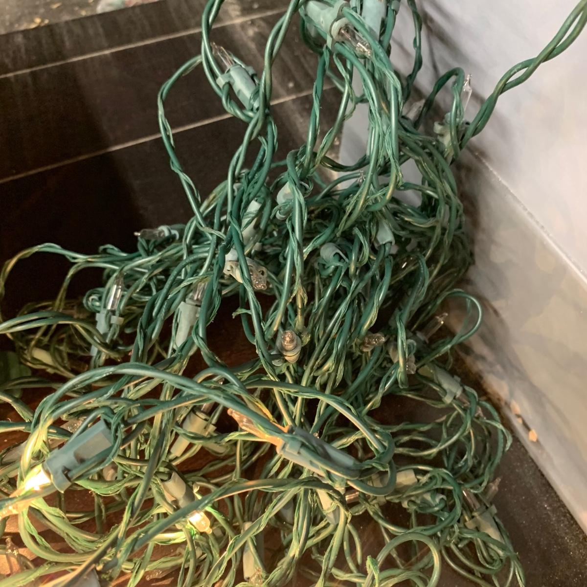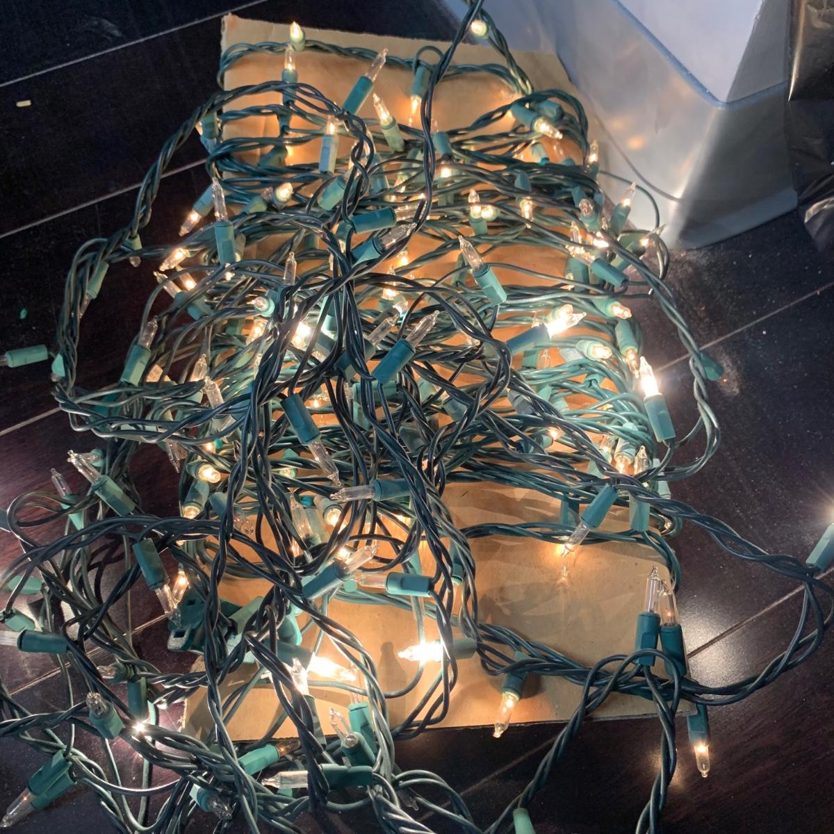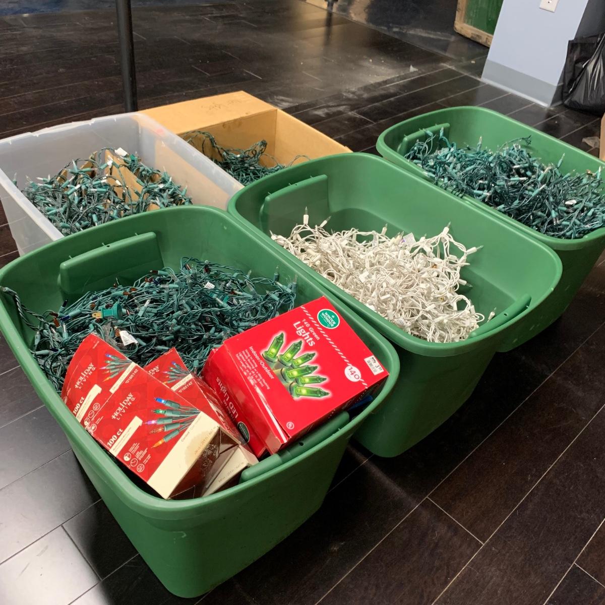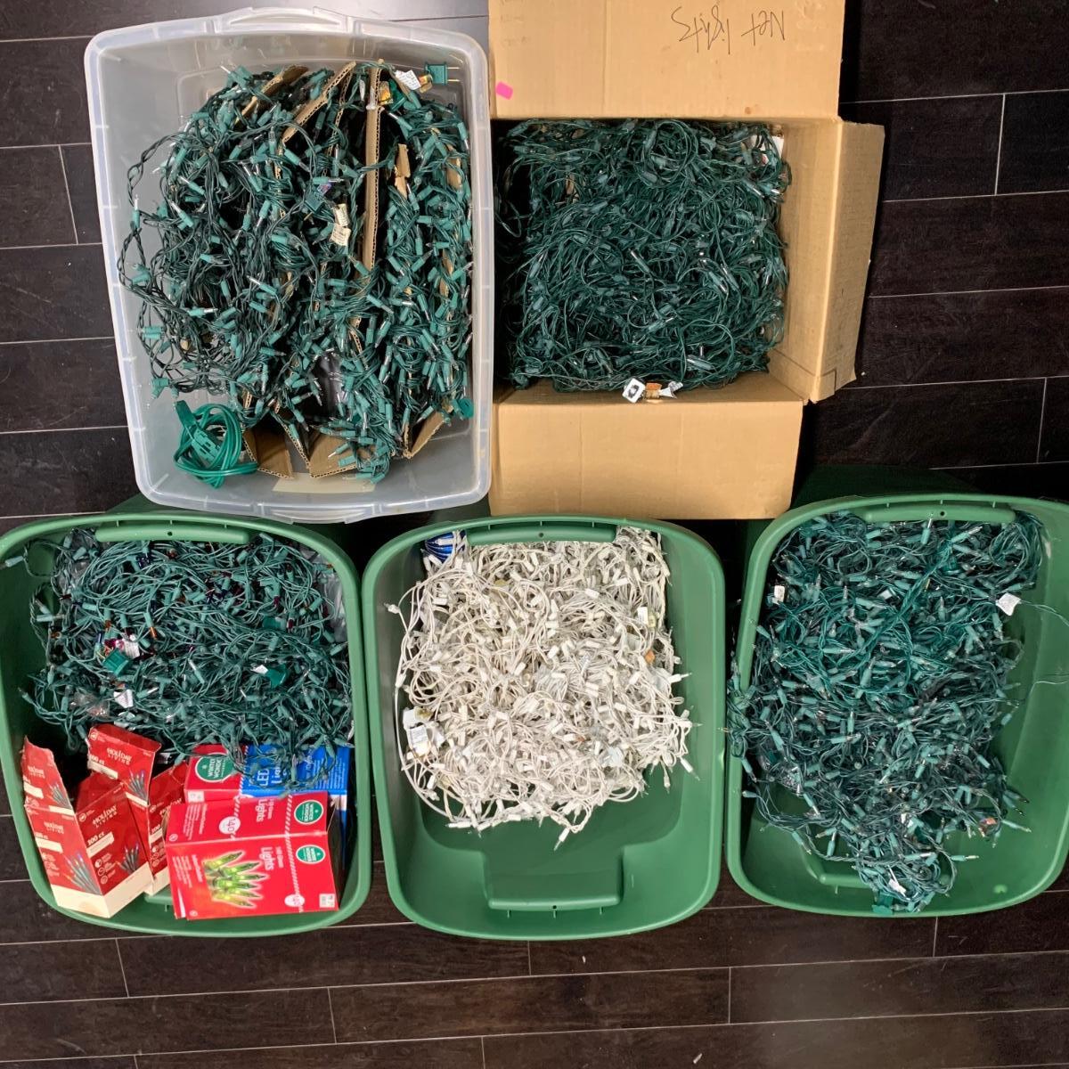 Many Christmas lights! There are five bins/boxes full of different types and lengths of lights. Some clear, some multi-colored, some green, some red. There are a couple sets of net lights and one large Christmas tree light structure. There are probably 40+ strands of lights. All lights functioned when tested. Bins (no lids) are included. Local pickup only.
