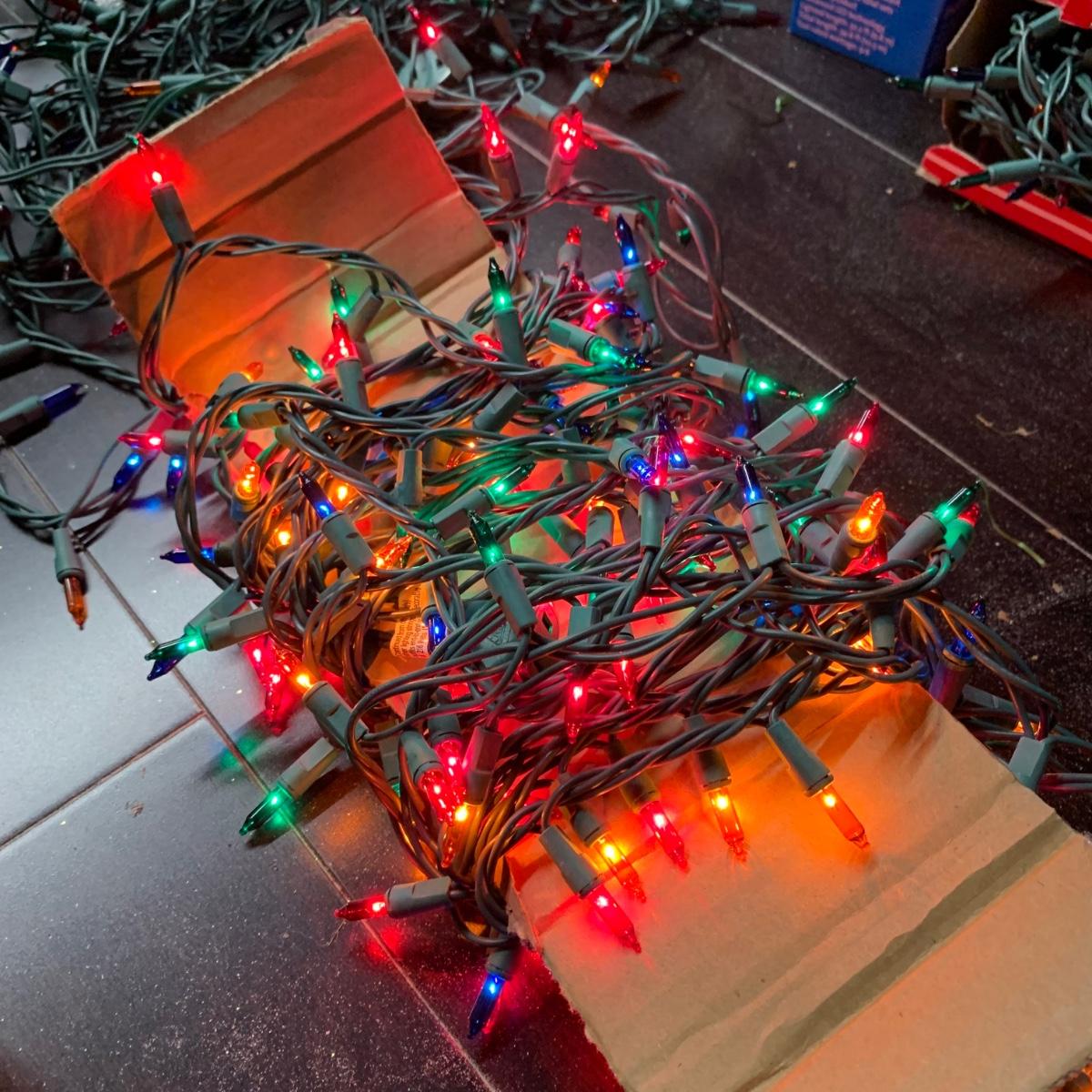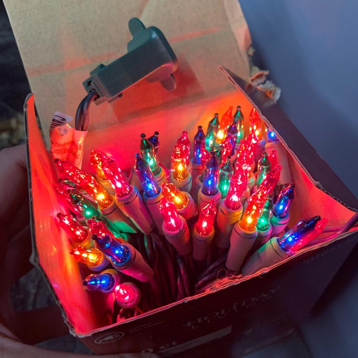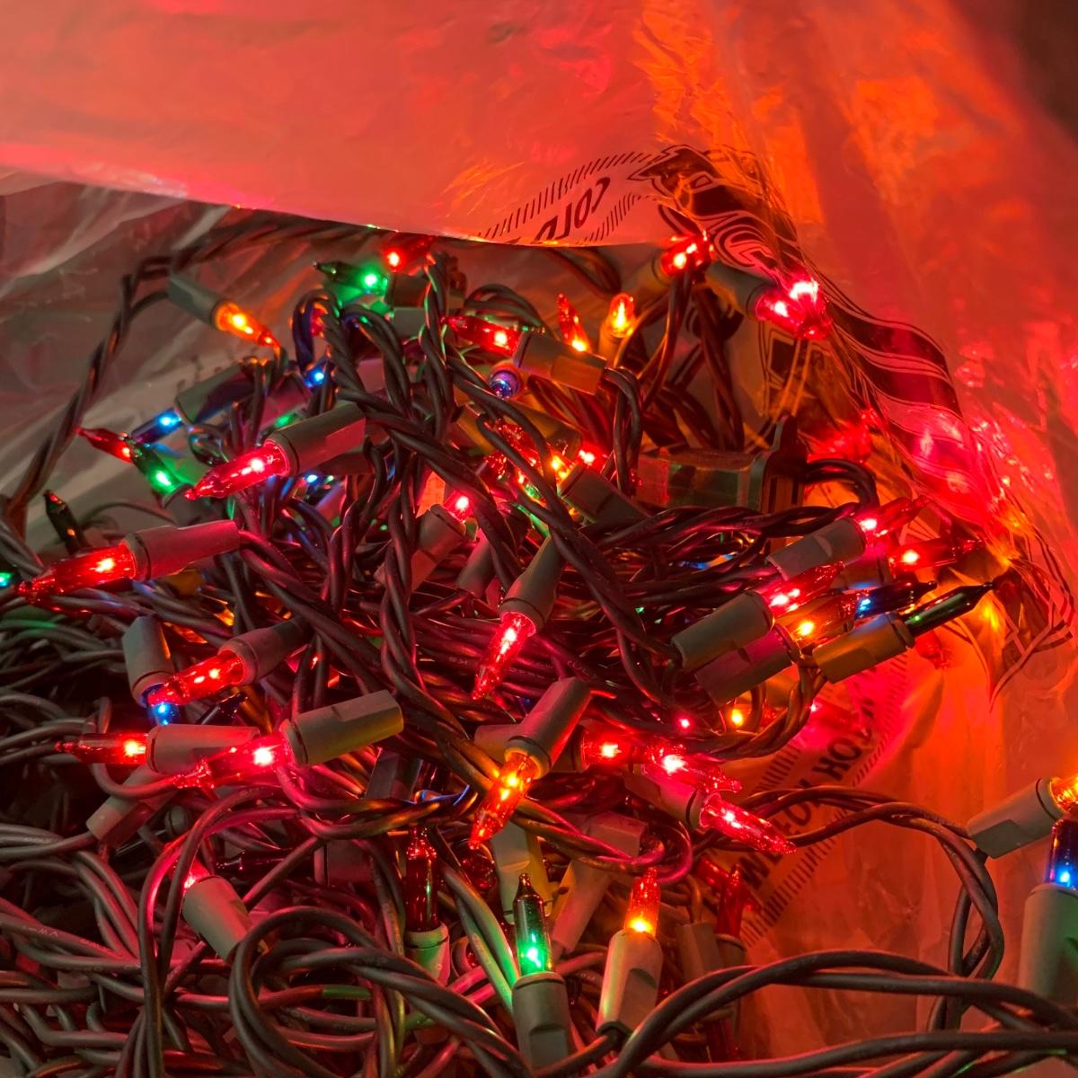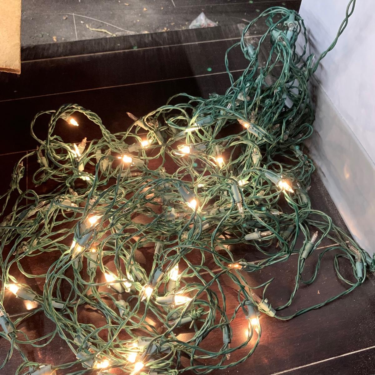 Many Christmas lights! There are five bins/boxes full of different types and lengths of lights. Some clear, some multi-colored, some green, some red. There are a couple sets of net lights and one large Christmas tree light structure. There are probably 40+ strands of lights. All lights functioned when tested. Bins (no lids) are included. Local pickup only.