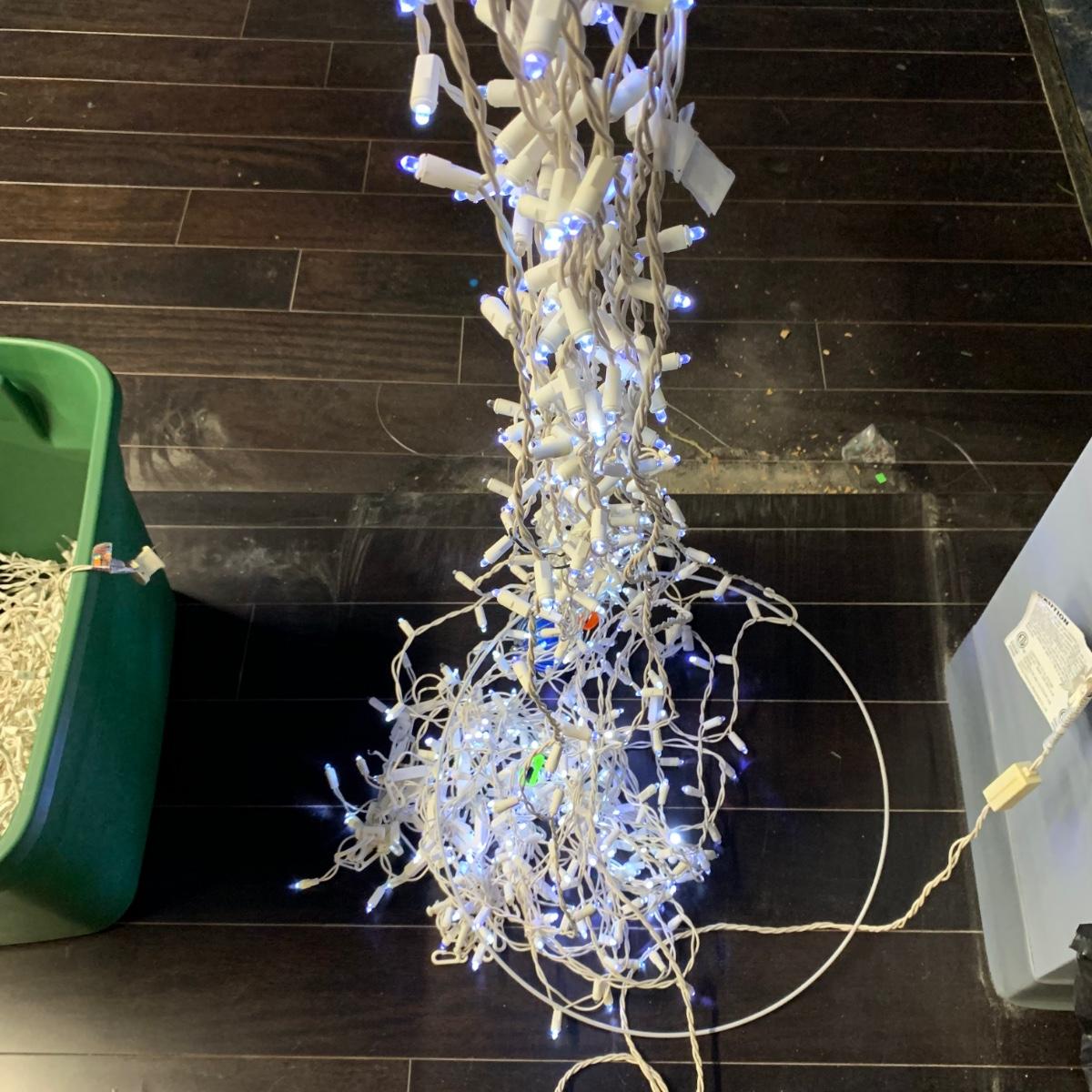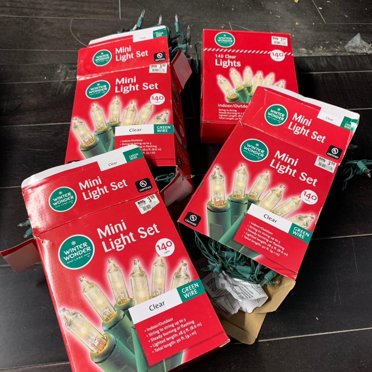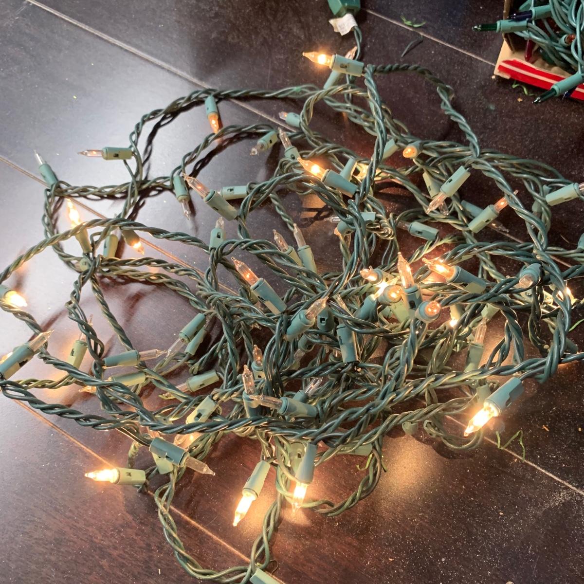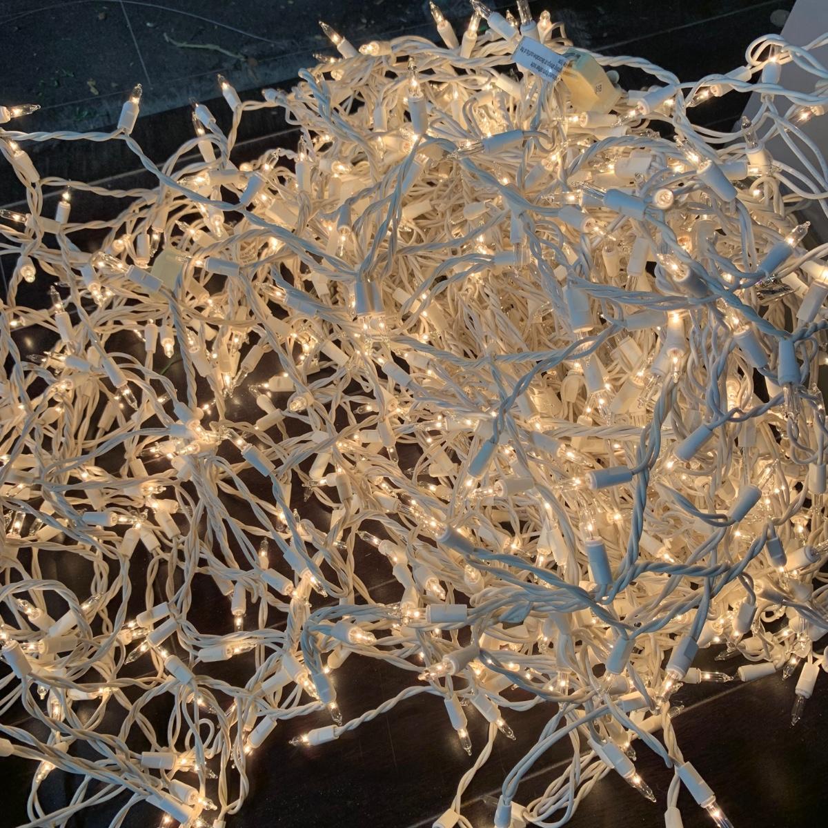 Many Christmas lights! There are five bins/boxes full of different types and lengths of lights. Some clear, some multi-colored, some green, some red. There are a couple sets of net lights and one large Christmas tree light structure. There are probably 40+ strands of lights. All lights functioned when tested. Bins (no lids) are included. Local pickup only.