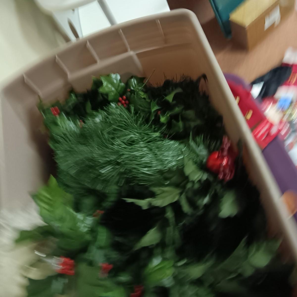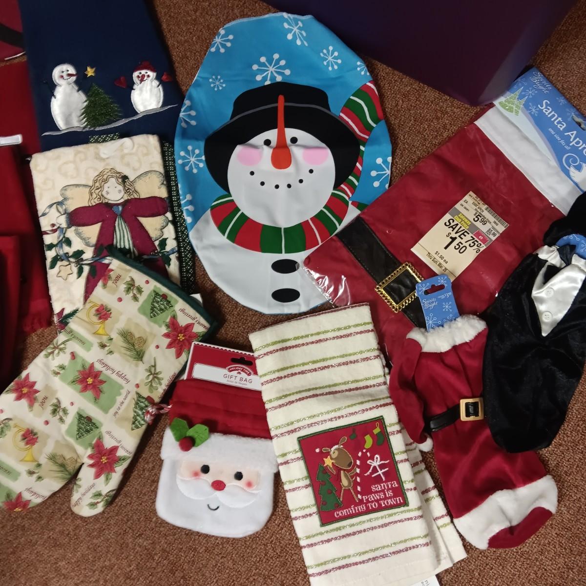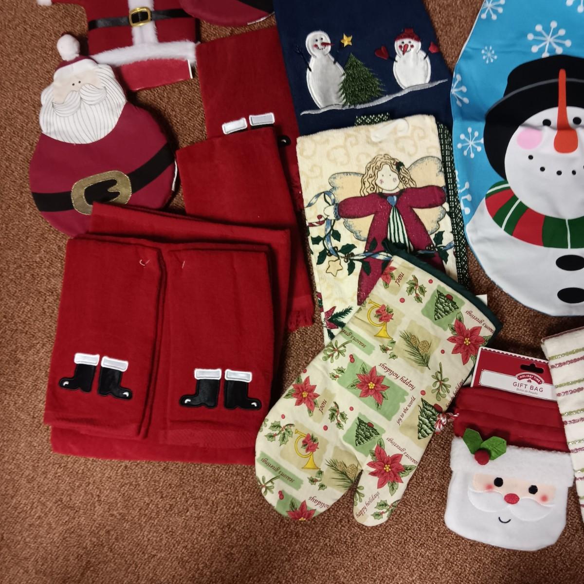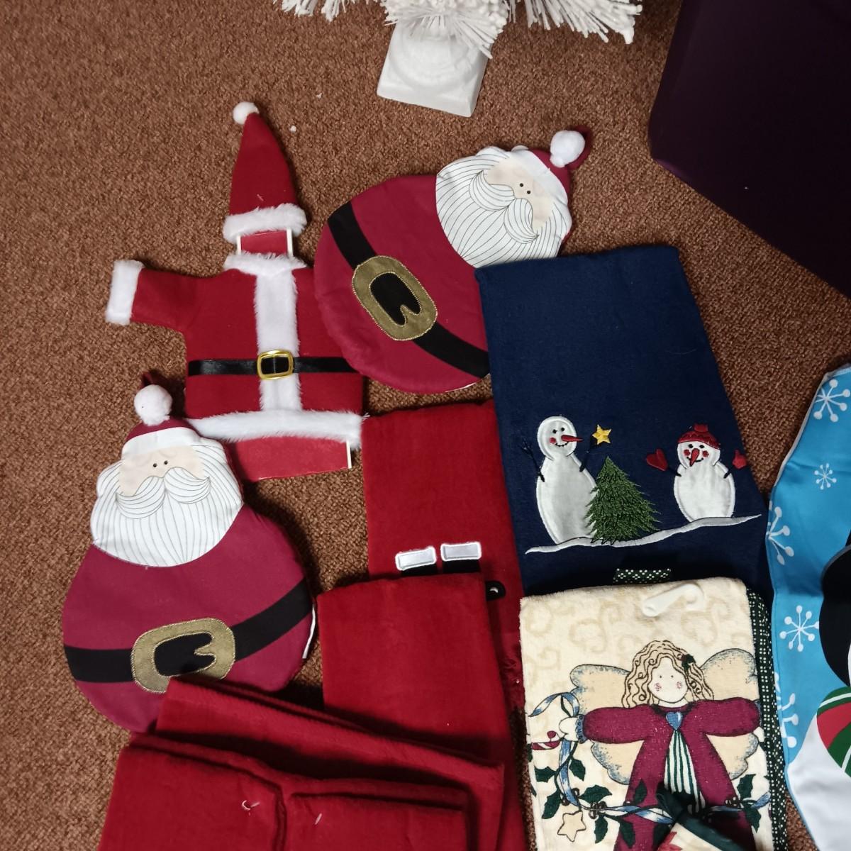 CHRISTMAS LINENS, FAUX GARLAND AND A SMALL FLOCKED TREE