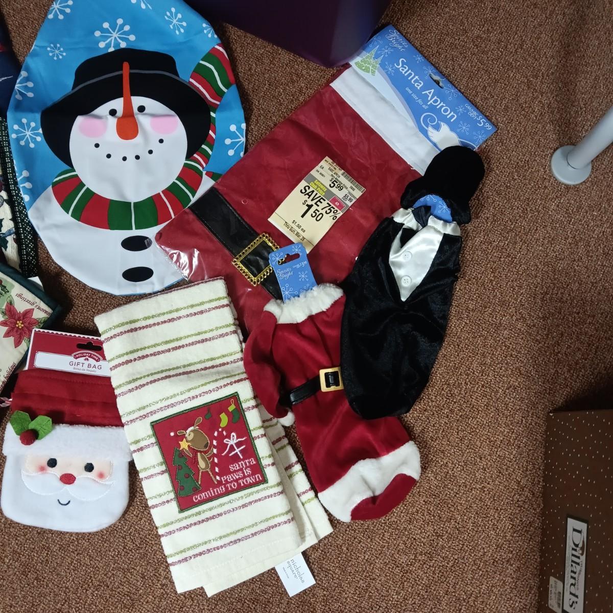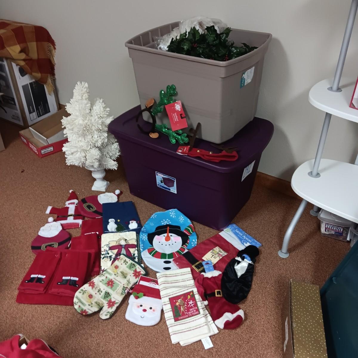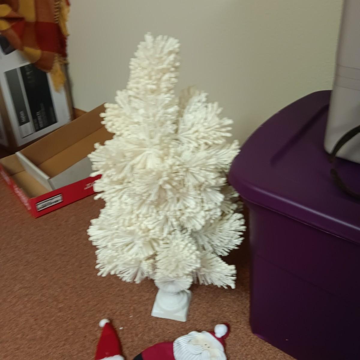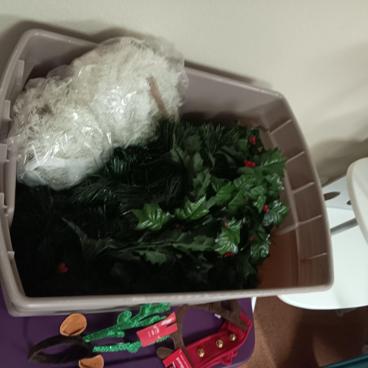 CHRISTMAS LINENS, FAUX GARLAND AND A SMALL FLOCKED TREE