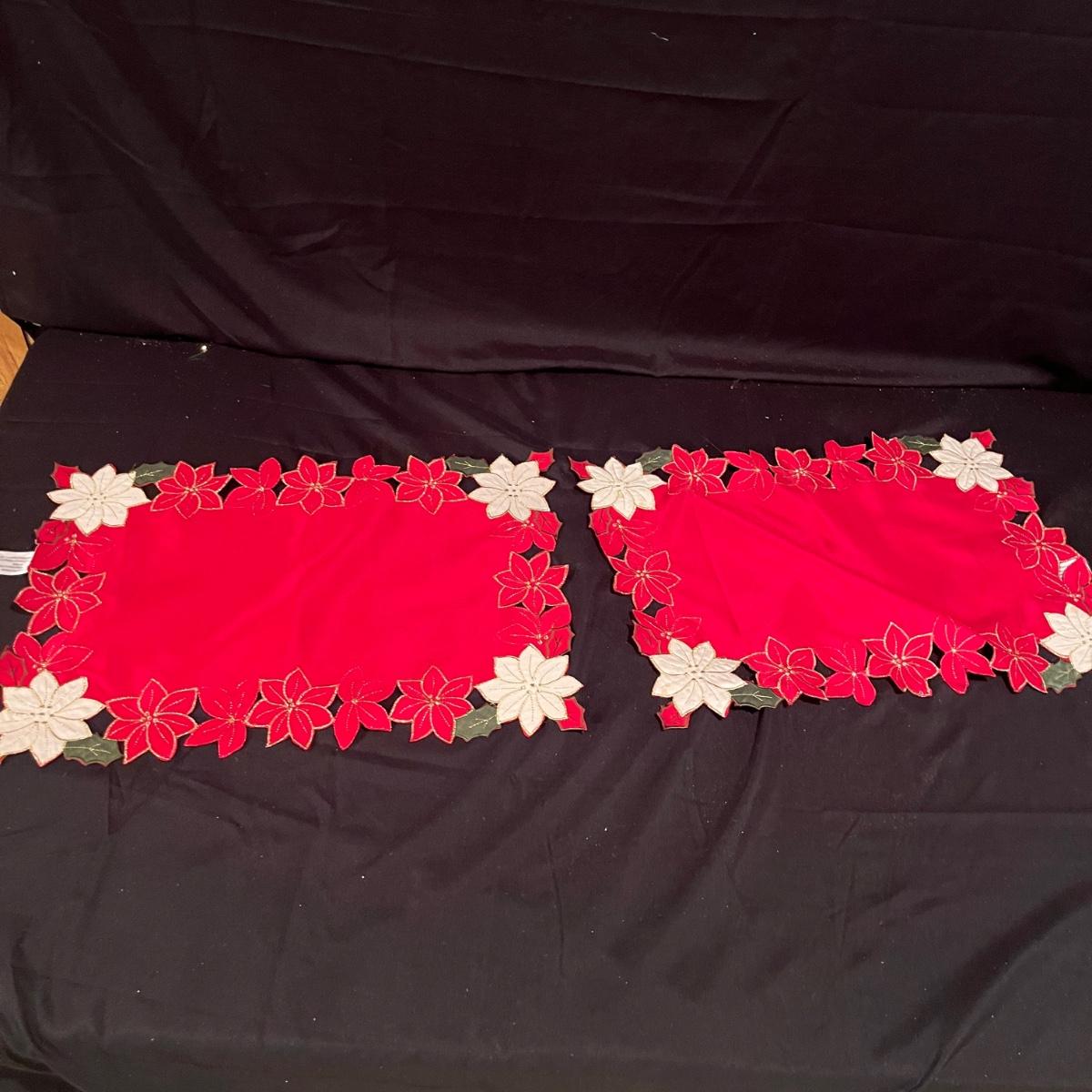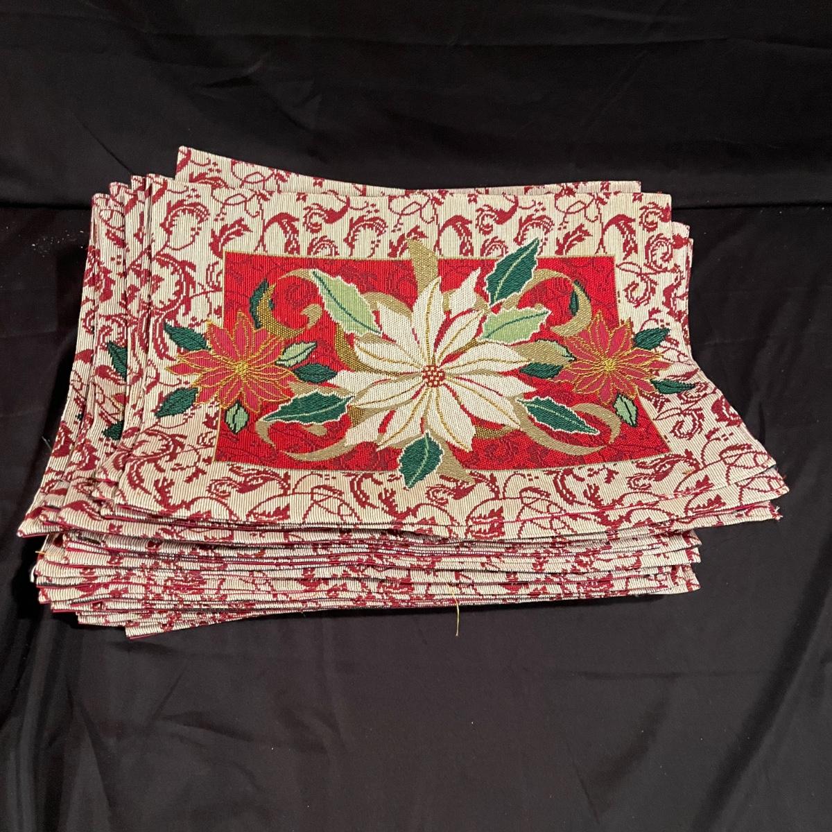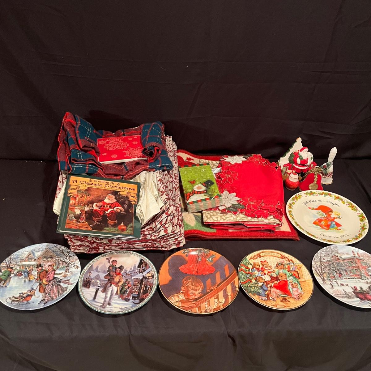 This Christmas linens lot includes 38 placemats, 16 napkins, table runners, two floor mats, six Christmas plates, Bell, Music bell by Reuge, napkin holder, table cloth and more. Tablecloth measures 57” x 75” and the largest plate measures 10”D.