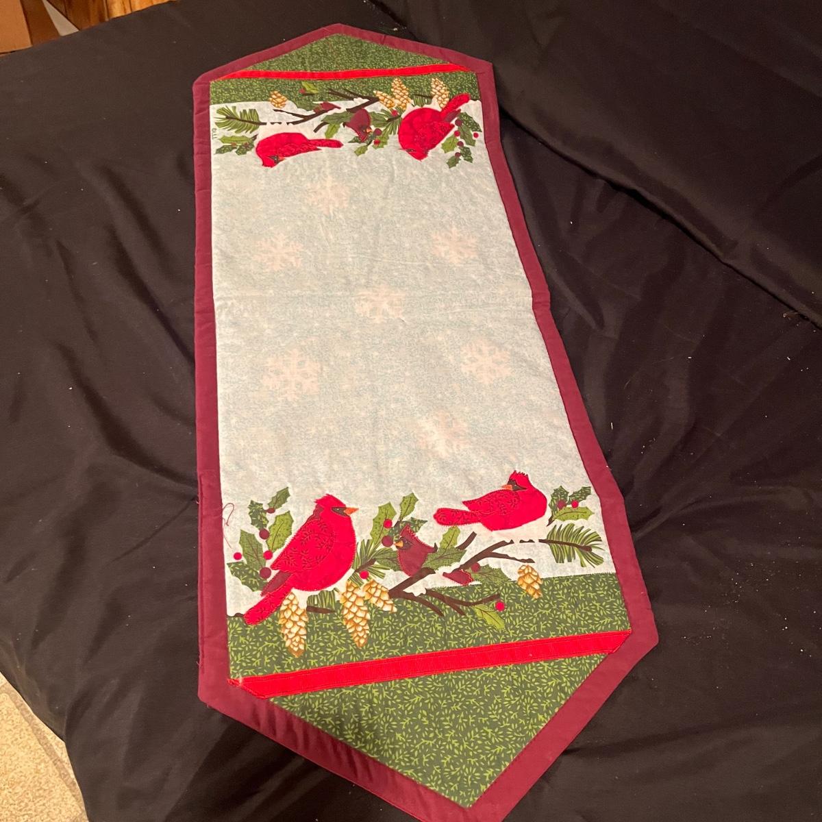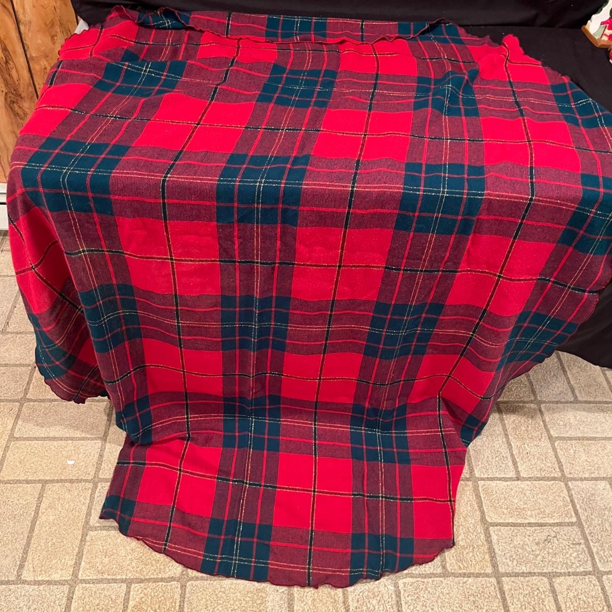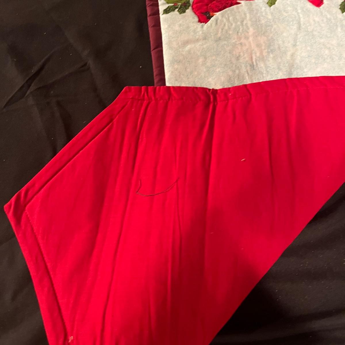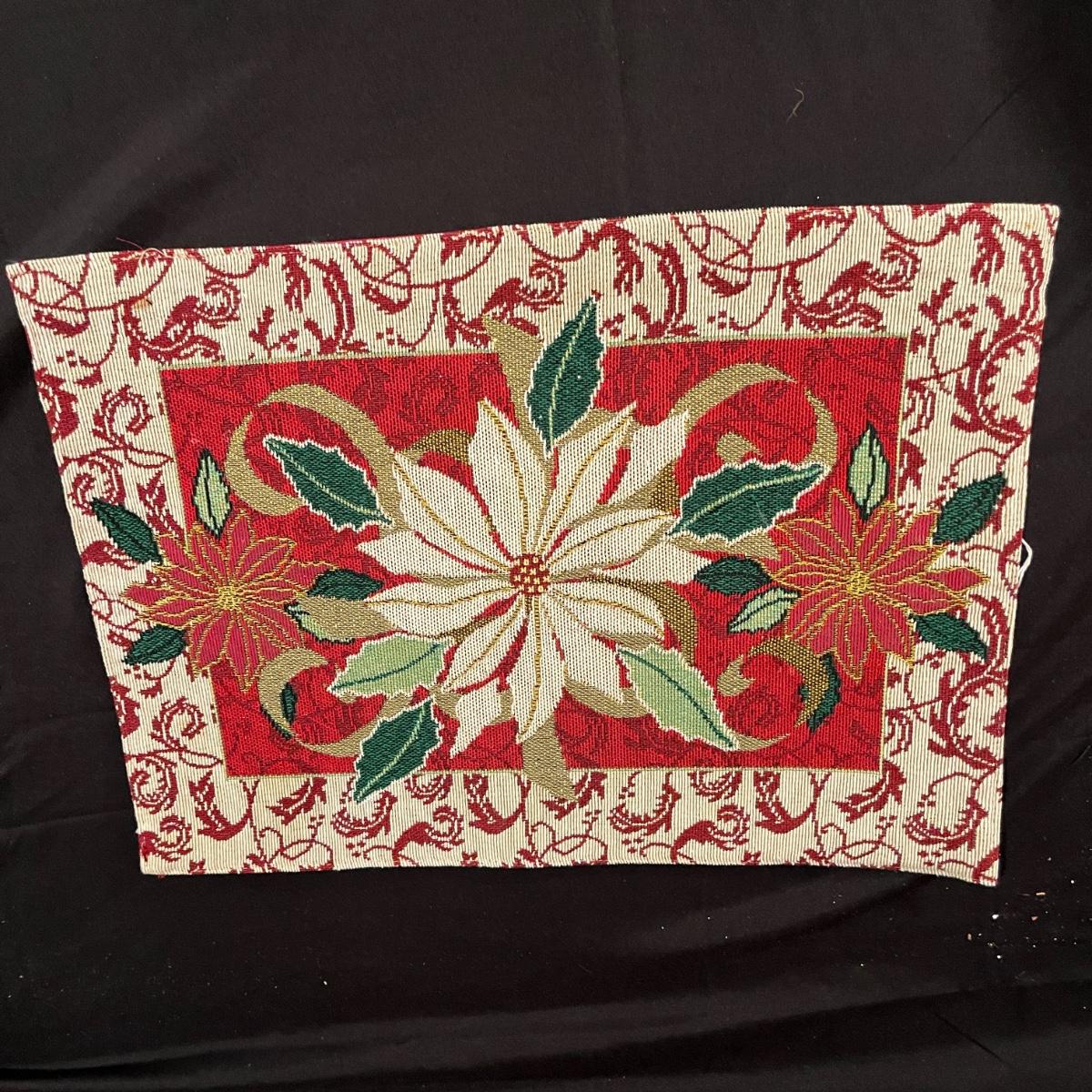 This Christmas linens lot includes 38 placemats, 16 napkins, table runners, two floor mats, six Christmas plates, Bell, Music bell by Reuge, napkin holder, table cloth and more. Tablecloth measures 57” x 75” and the largest plate measures 10”D.
