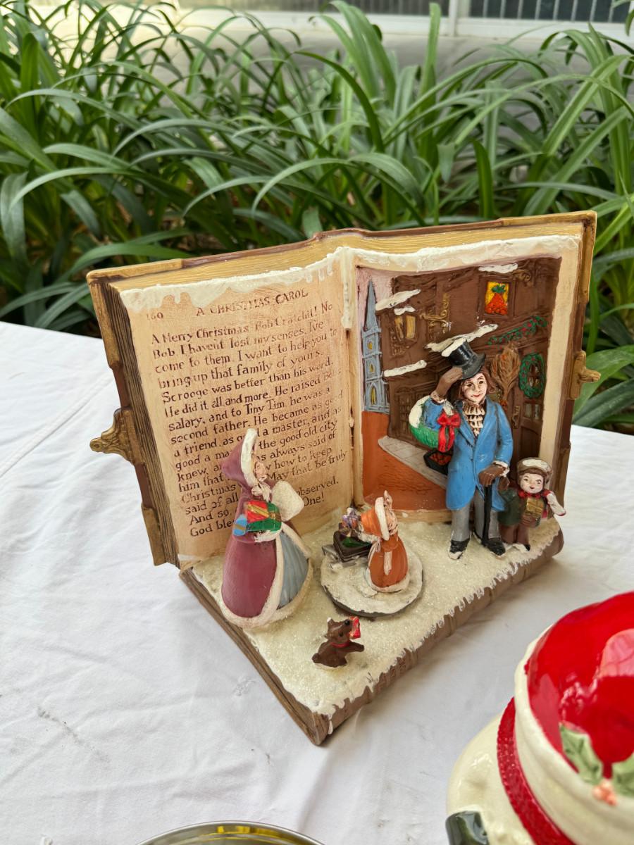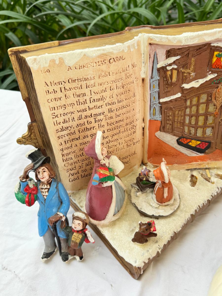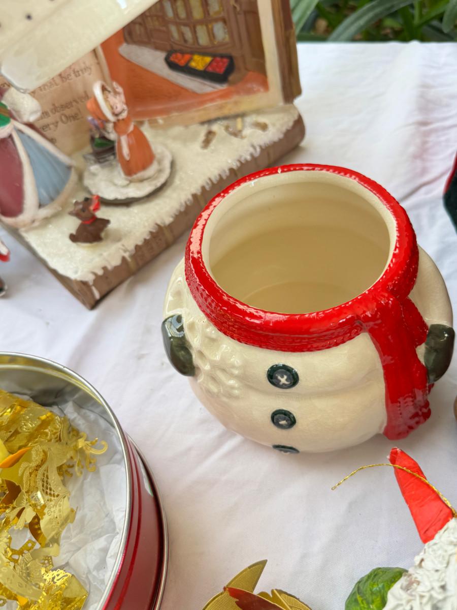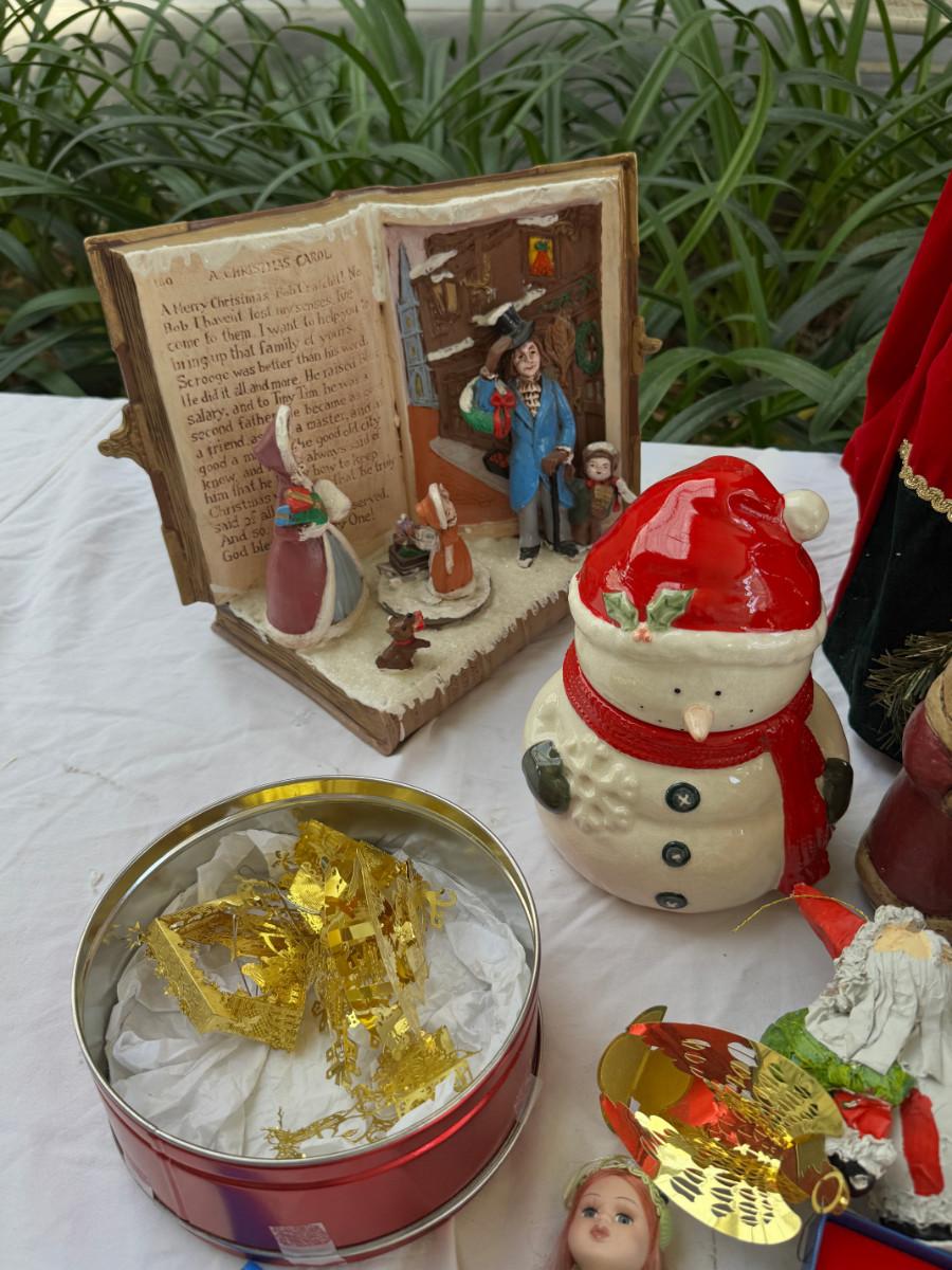 Figurines, ornaments, Candle holder, plates, Nut cracker figurine, stuffed music boxes, snow globe music box, roll of snow, Dickens open book, figures need to be re-glued, Snowman cookie jar, metal ornaments, etched white house ornament.