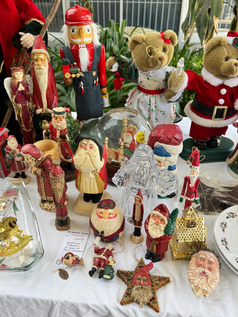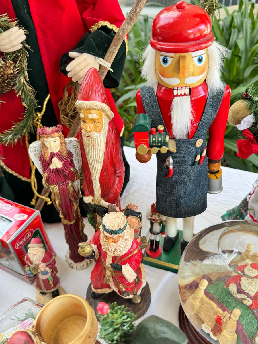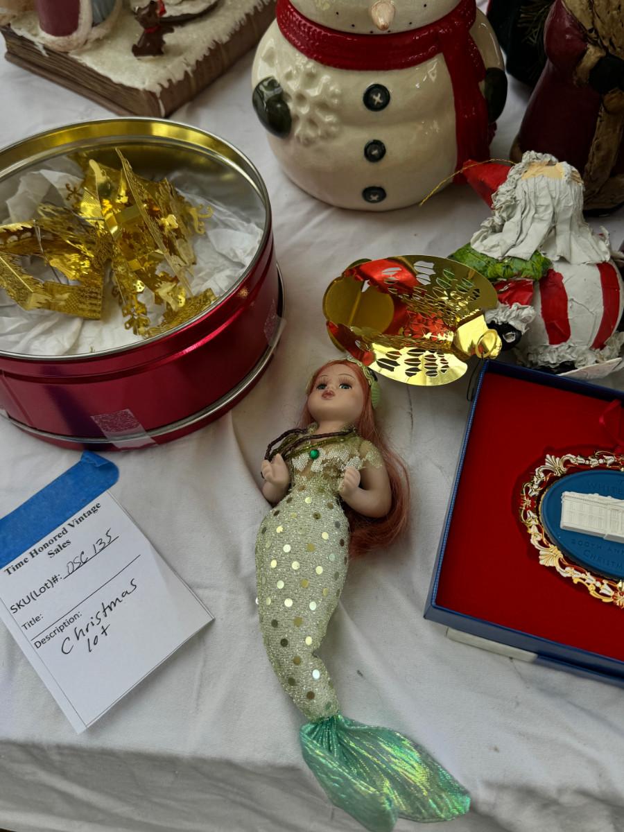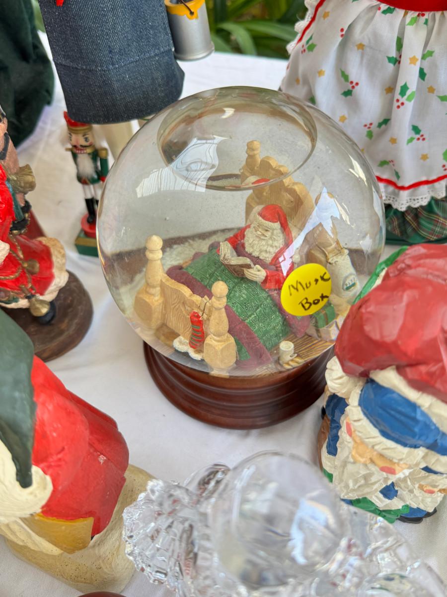 Figurines, ornaments, Candle holder, plates, Nut cracker figurine, stuffed music boxes, snow globe music box, roll of snow, Dickens open book, figures need to be re-glued, Snowman cookie jar, metal ornaments, etched white house ornament.