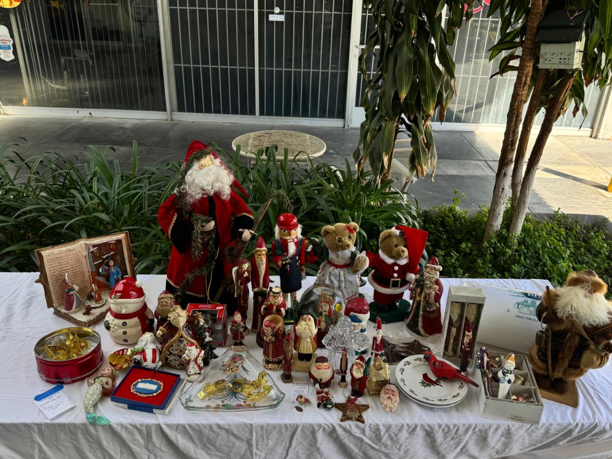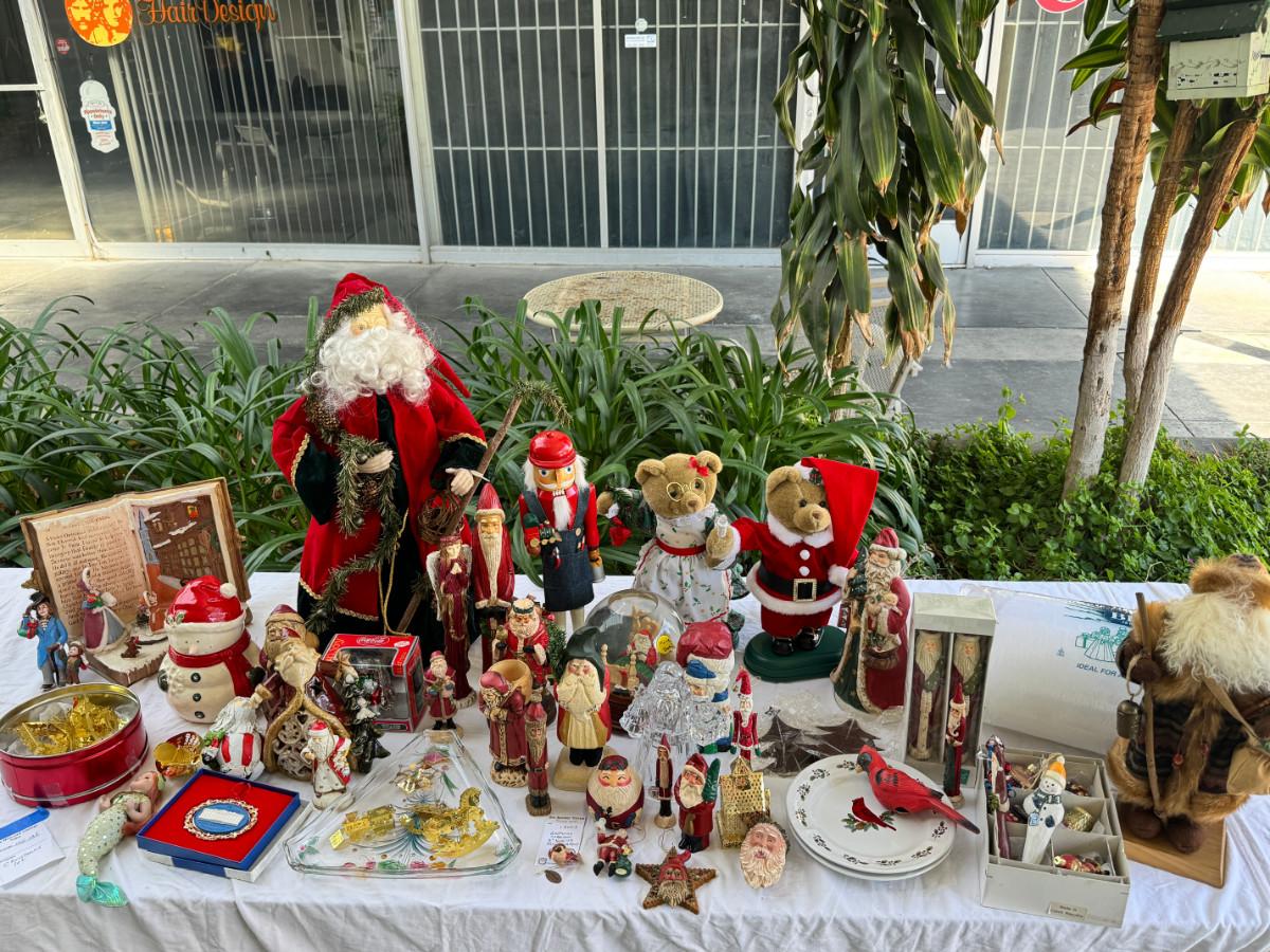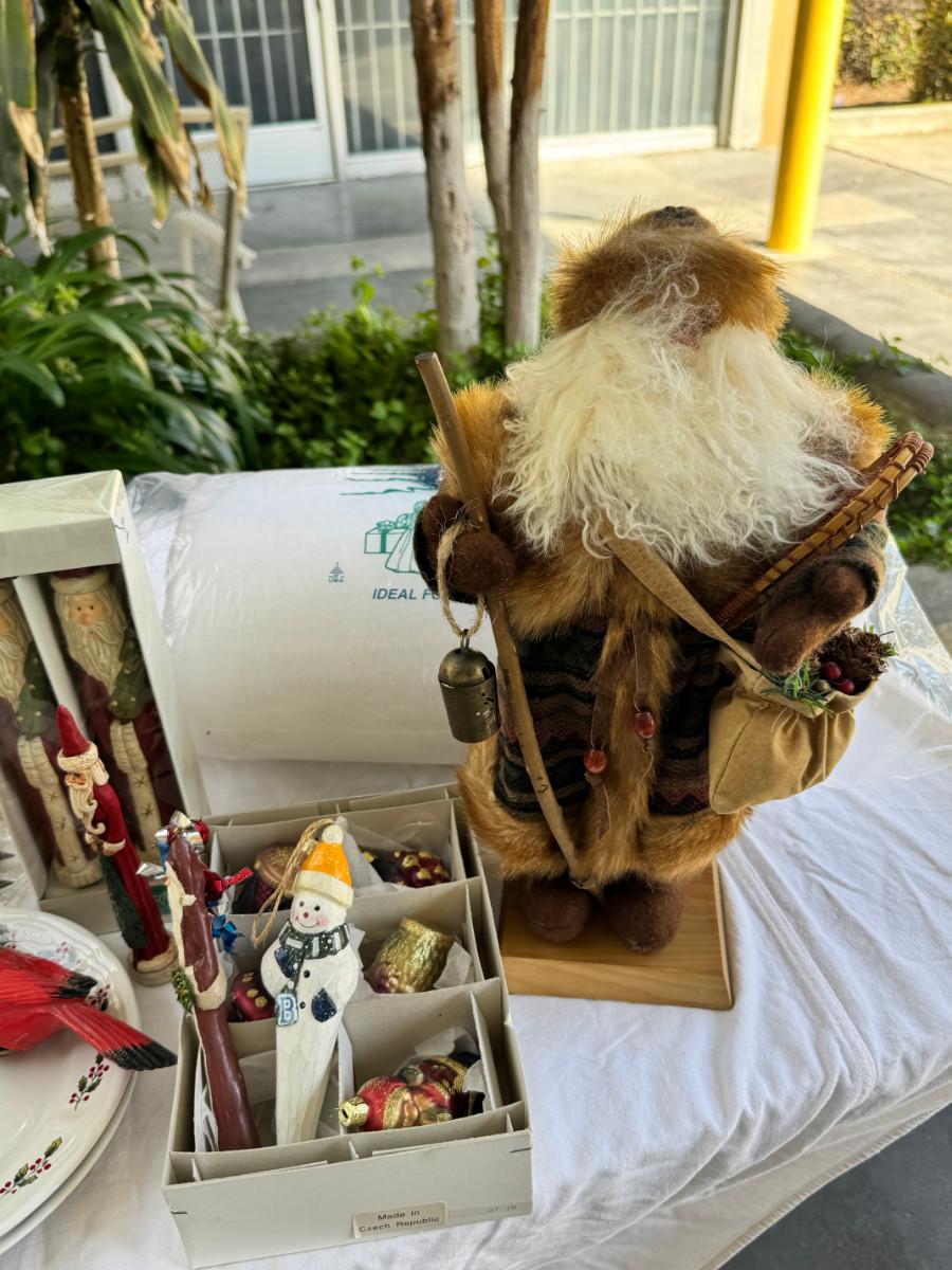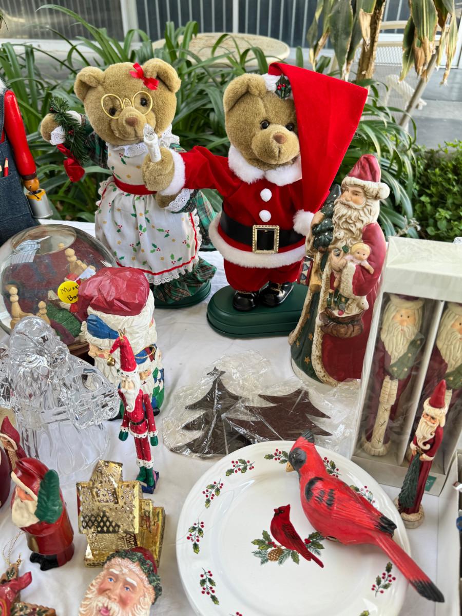 Figurines, ornaments, Candle holder, plates, Nut cracker figurine, stuffed music boxes, snow globe music box, roll of snow, Dickens open book, figures need to be re-glued, Snowman cookie jar, metal ornaments, etched white house ornament.