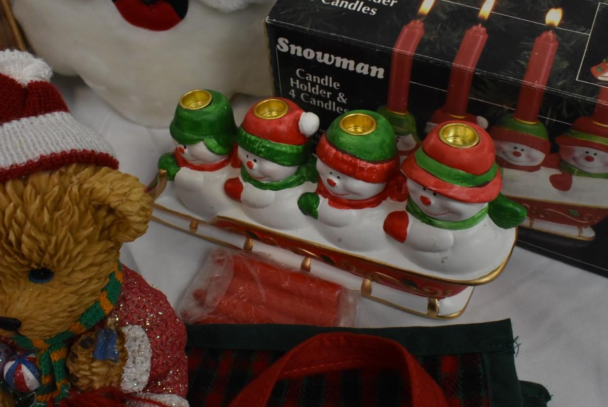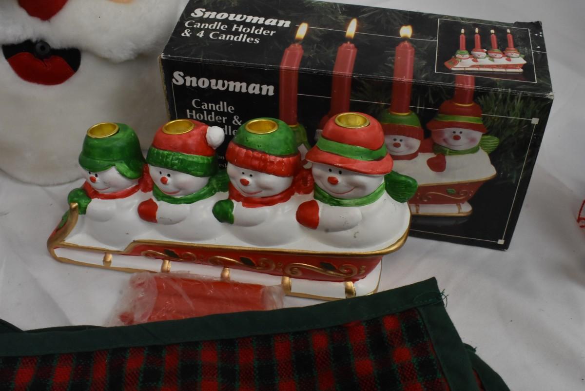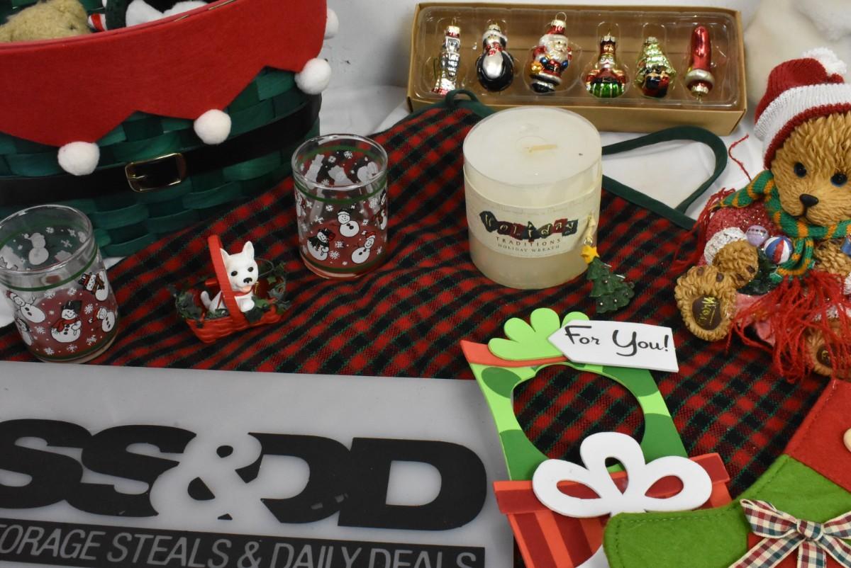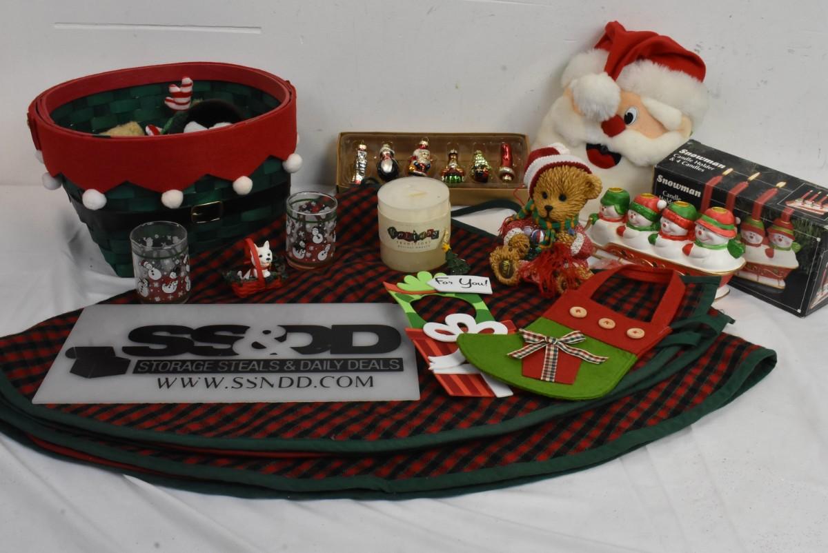Christmas lot 12+pcs: blown glass orn., tree skrt, figurines, wicker basket, candles, candle holders