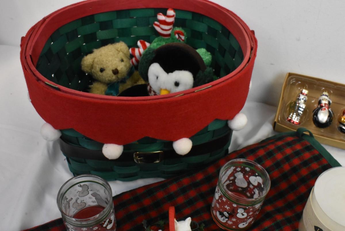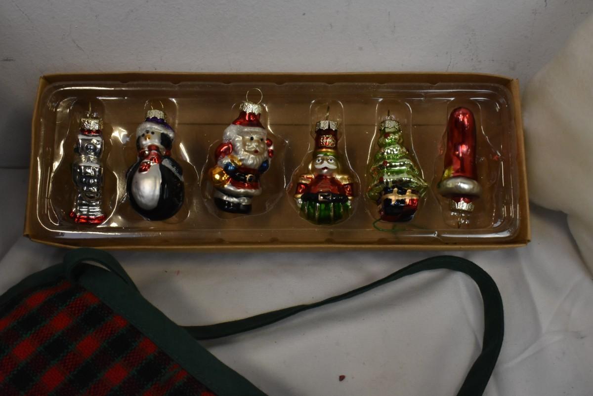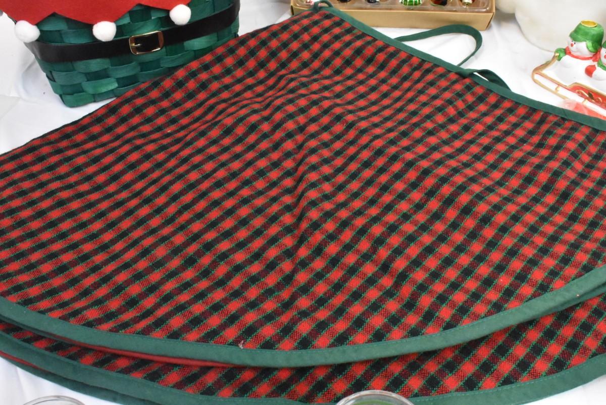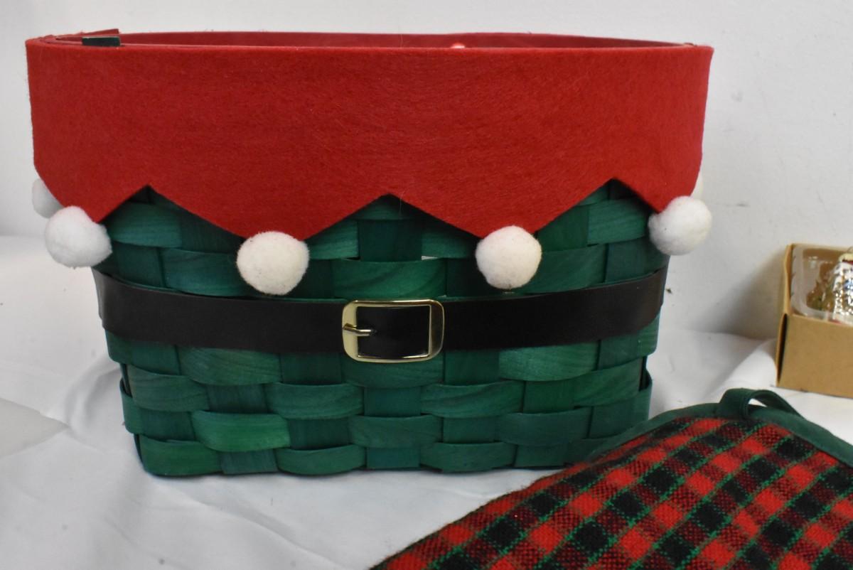 Christmas lot 12+ pc: blown glass ornaments, tree skirt, figurines, wicker basket