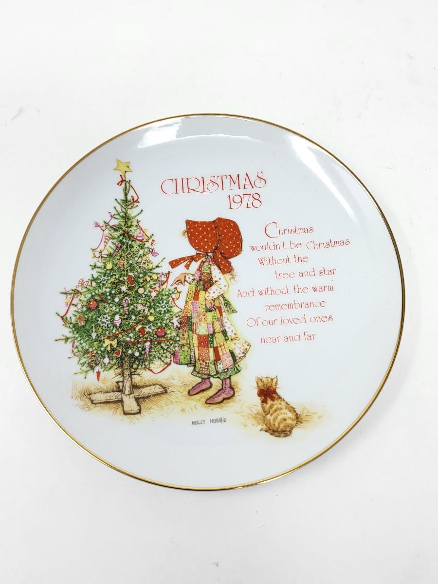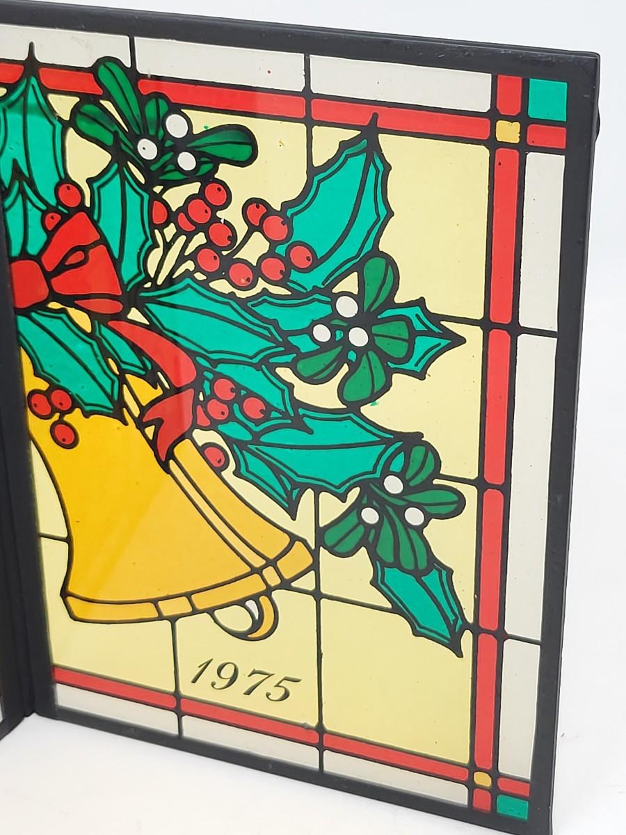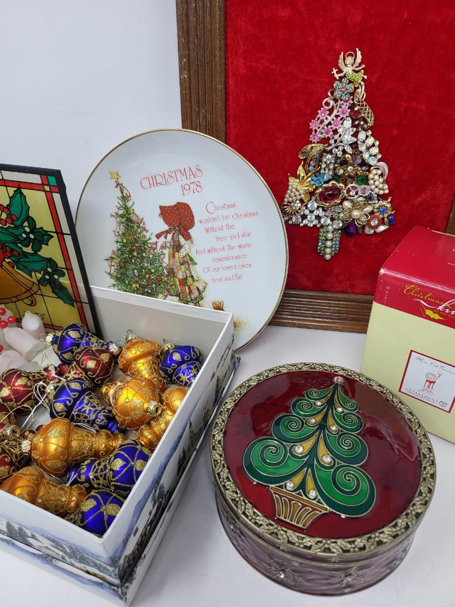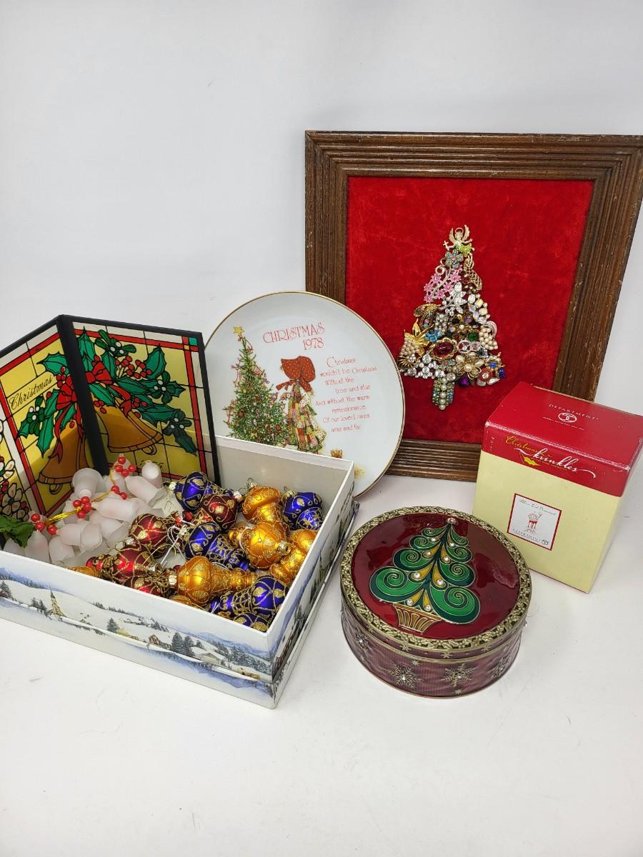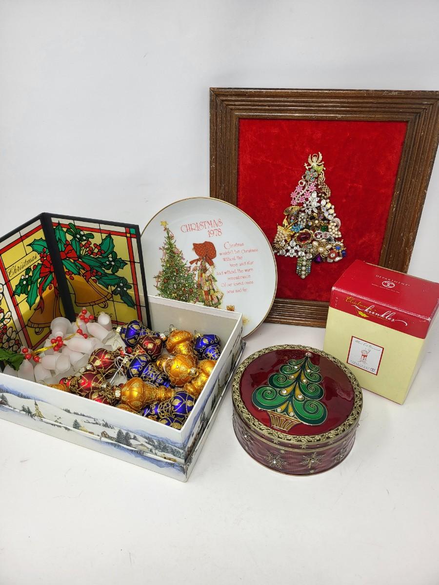 5.5" round x 2" tall enameled hinged box. 9" Vintage 1978 Christmas Holly Hobbie plate. 10" x 12" framed jeweled art tree. Dept 56 cat ornament. 1975 folding stained glass decor, 10" x 7". (14) glittery glass ornaments, 3". Vintage frosted glass bells 8".