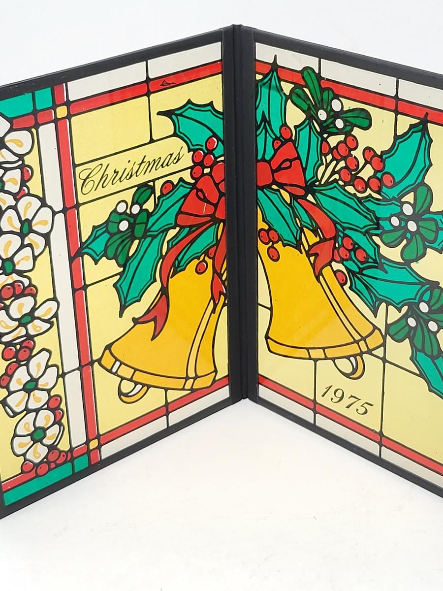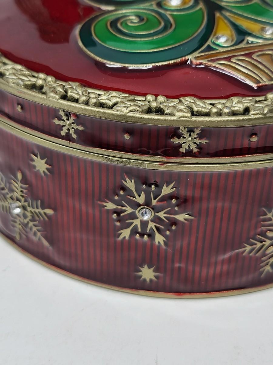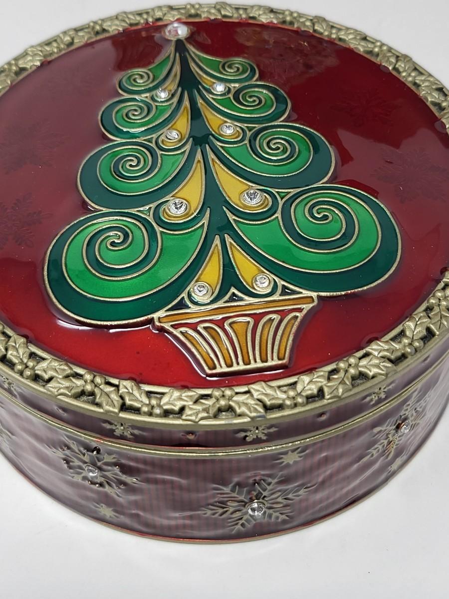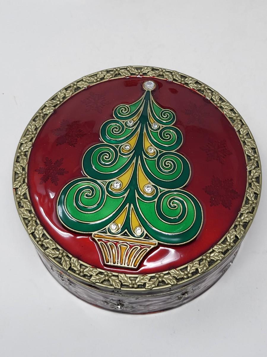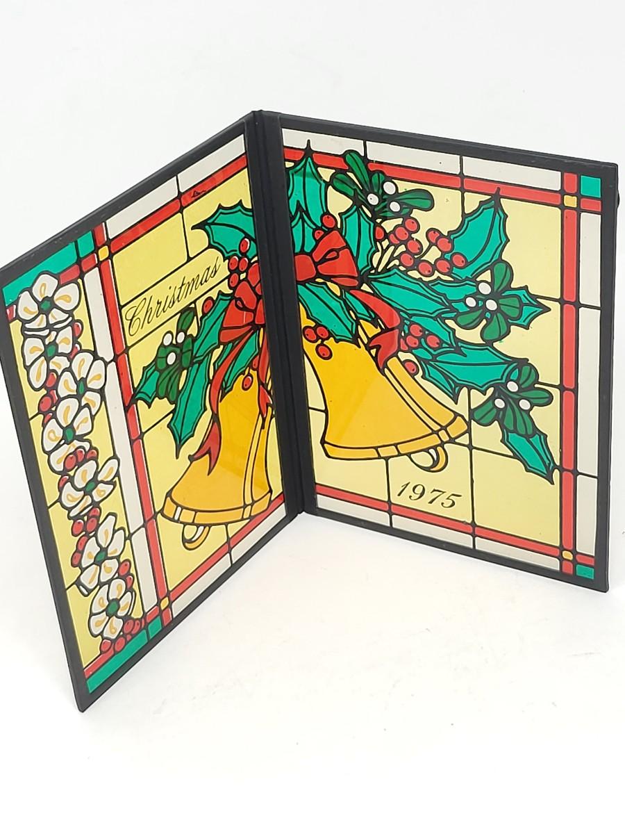 5.5" round x 2" tall enameled hinged box. 9" Vintage 1978 Christmas Holly Hobbie plate. 10" x 12" framed jeweled art tree. Dept 56 cat ornament. 1975 folding stained glass decor, 10" x 7". (14) glittery glass ornaments, 3". Vintage frosted glass bells 8".
