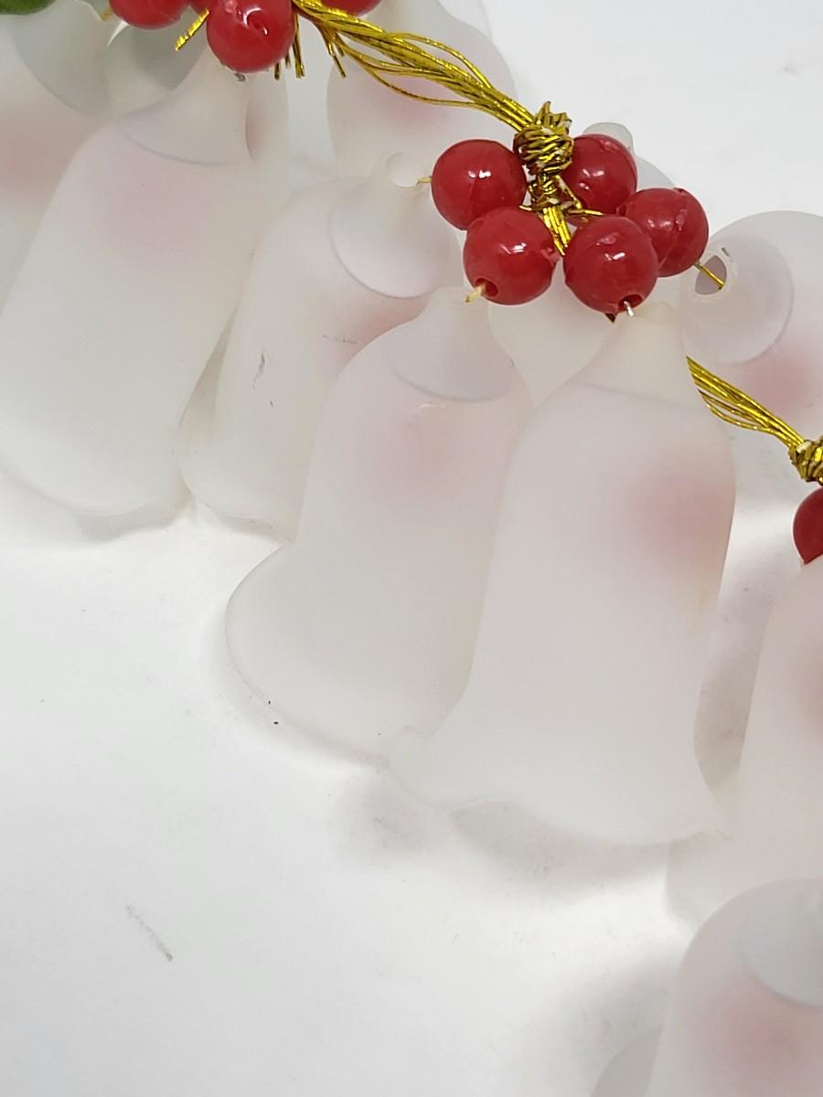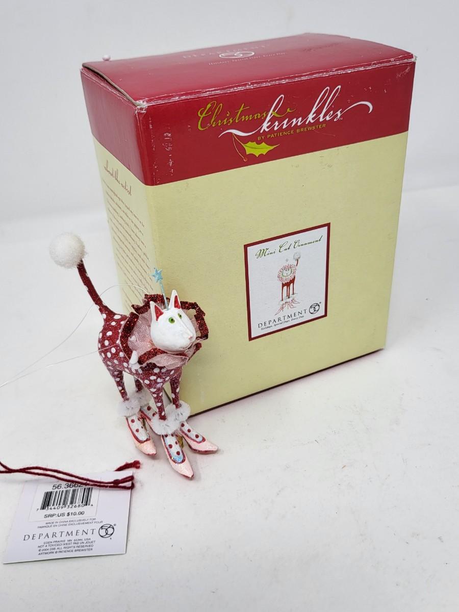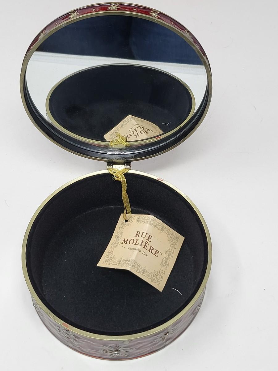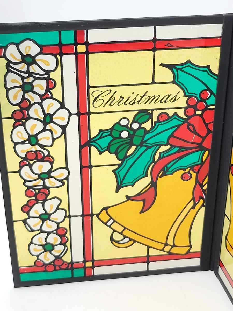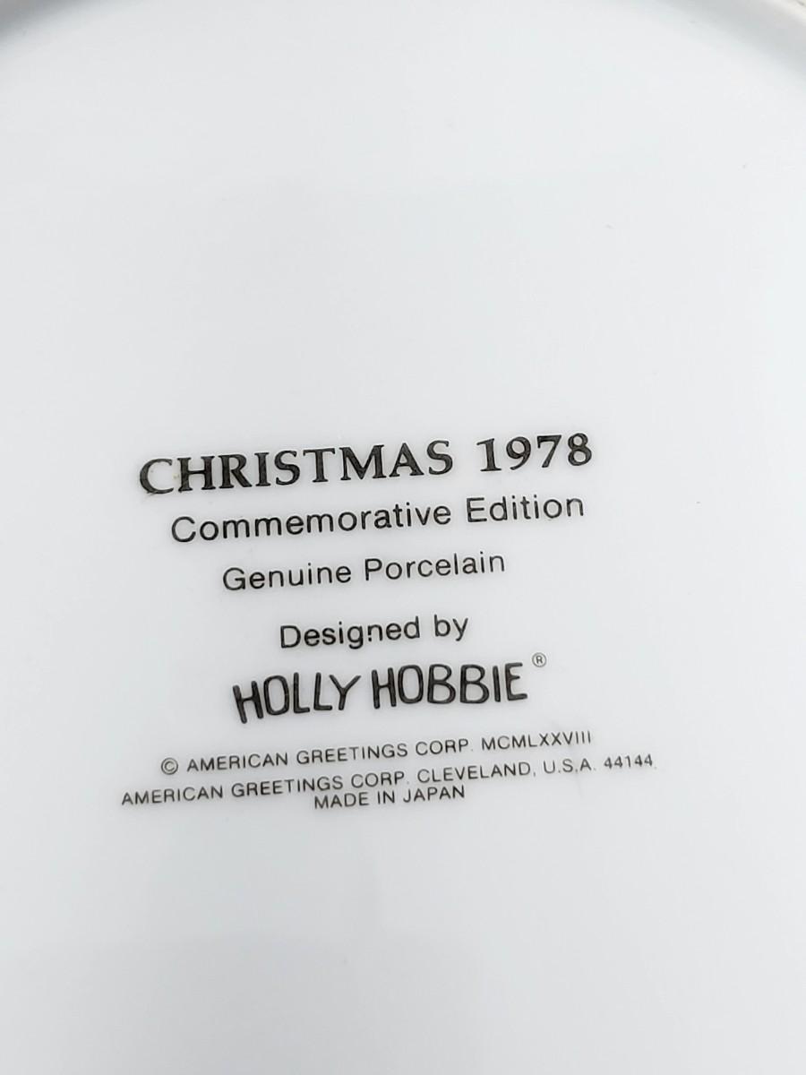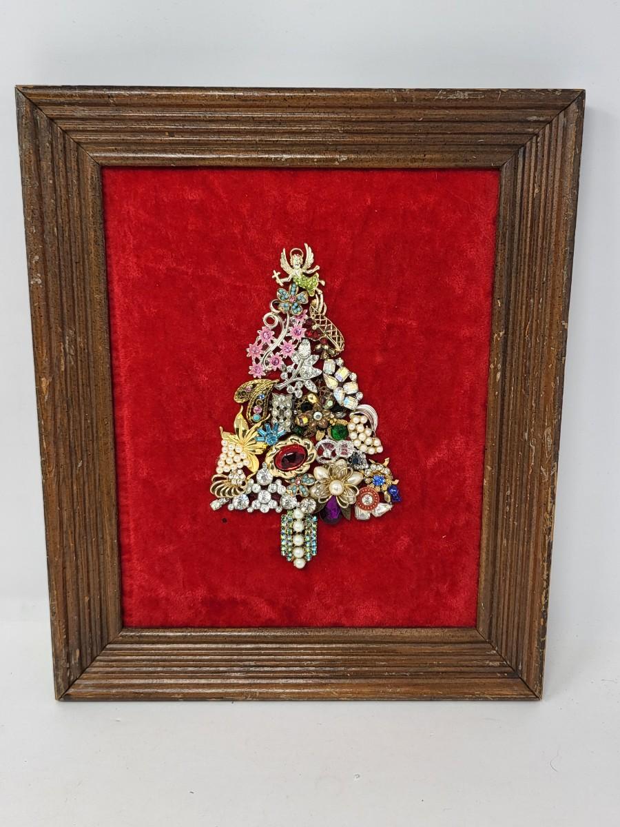 5.5" round x 2" tall enameled hinged box. 9" Vintage 1978 Christmas Holly Hobbie plate. 10" x 12" framed jeweled art tree. Dept 56 cat ornament. 1975 folding stained glass decor, 10" x 7". (14) glittery glass ornaments, 3". Vintage frosted glass bells 8".