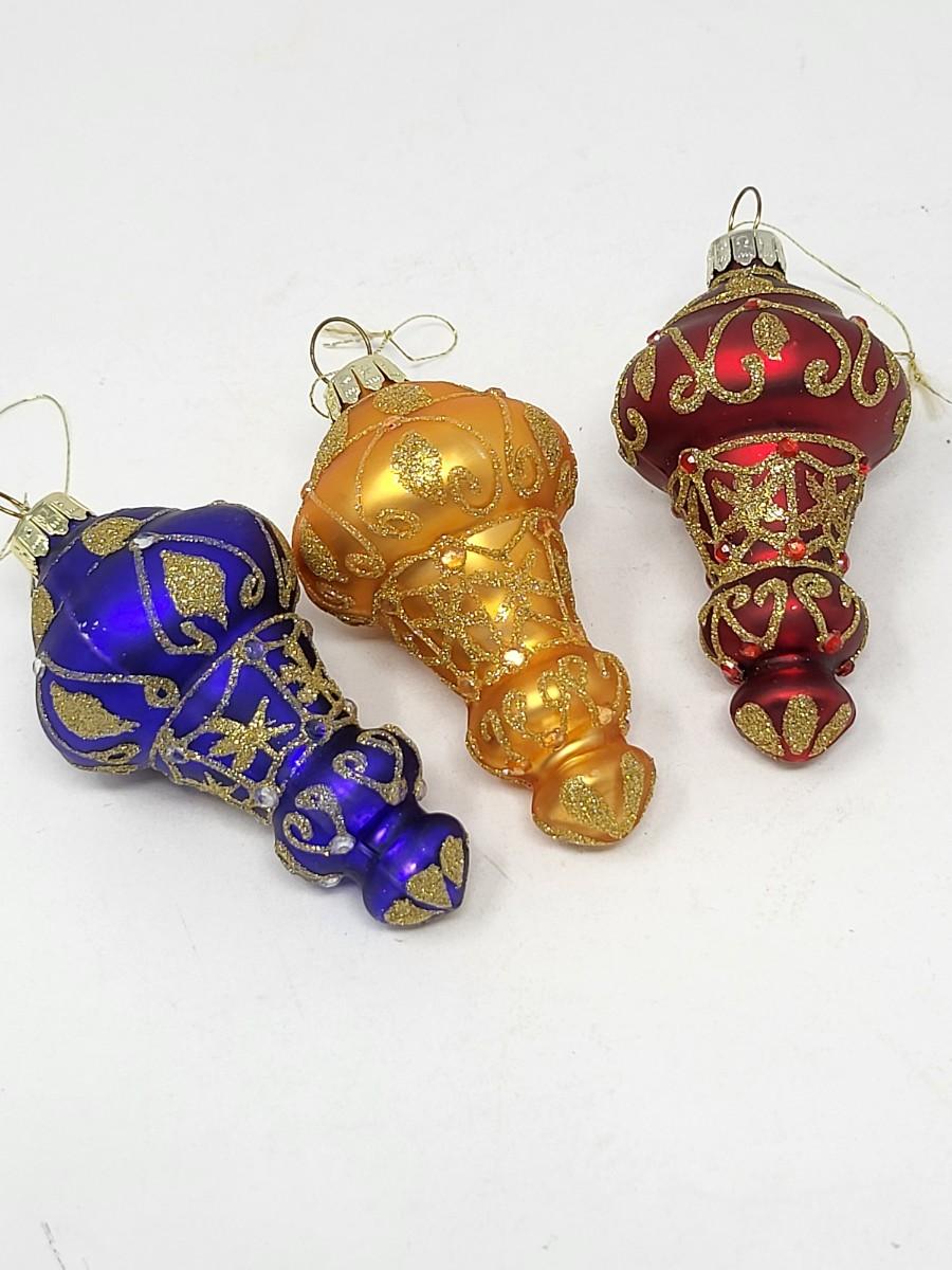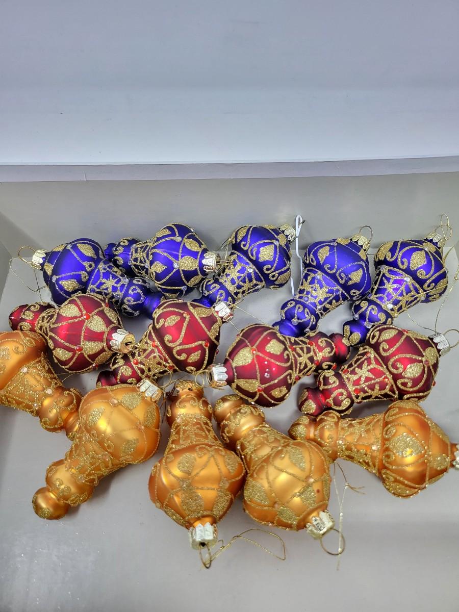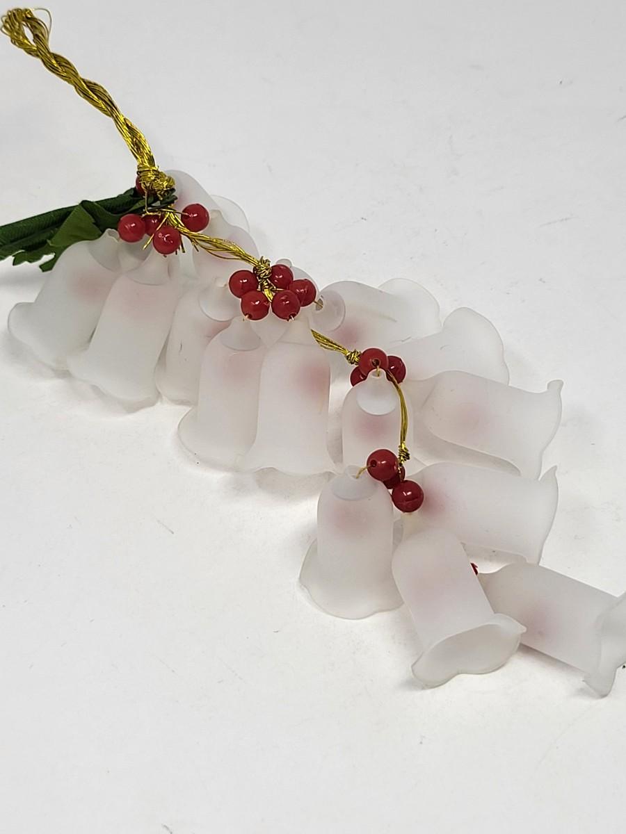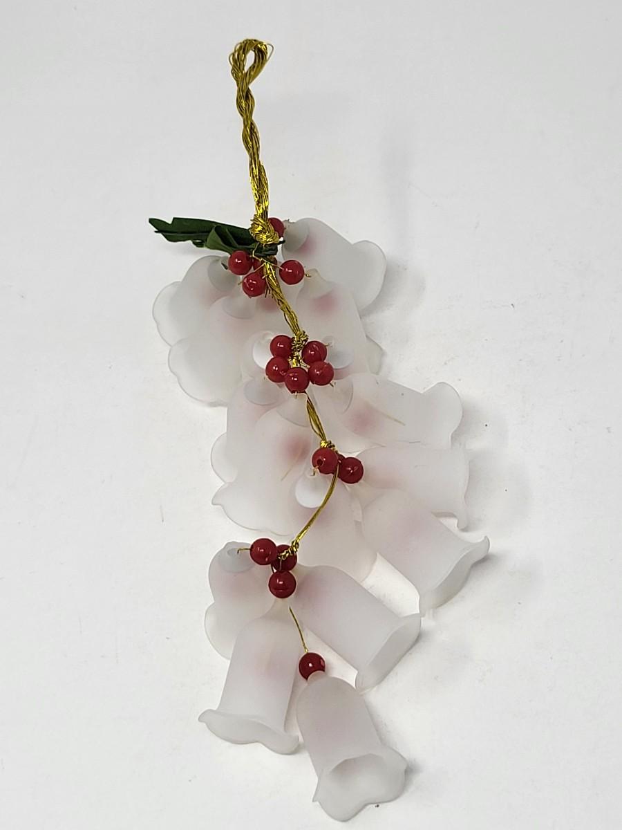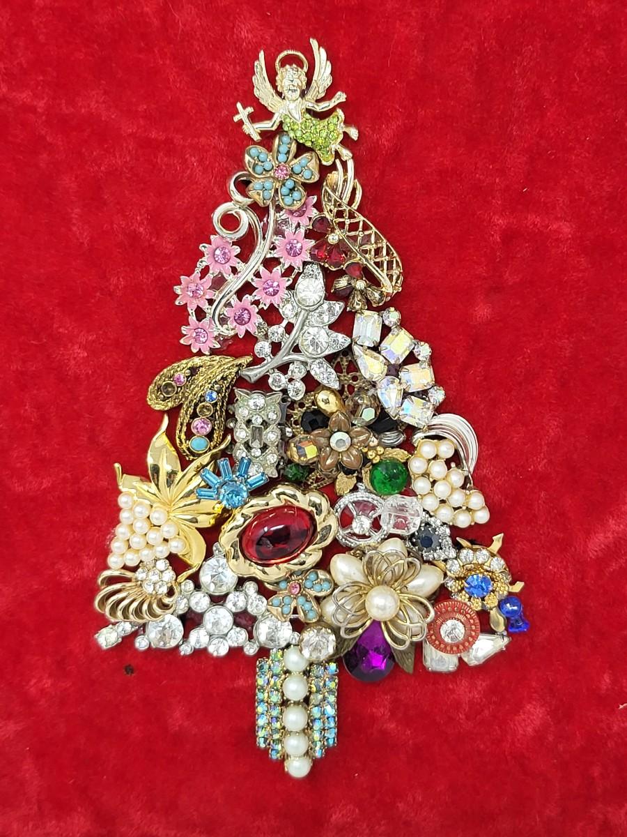 5.5" round x 2" tall enameled hinged box. 9" Vintage 1978 Christmas Holly Hobbie plate. 10" x 12" framed jeweled art tree. Dept 56 cat ornament. 1975 folding stained glass decor, 10" x 7". (14) glittery glass ornaments, 3". Vintage frosted glass bells 8".
