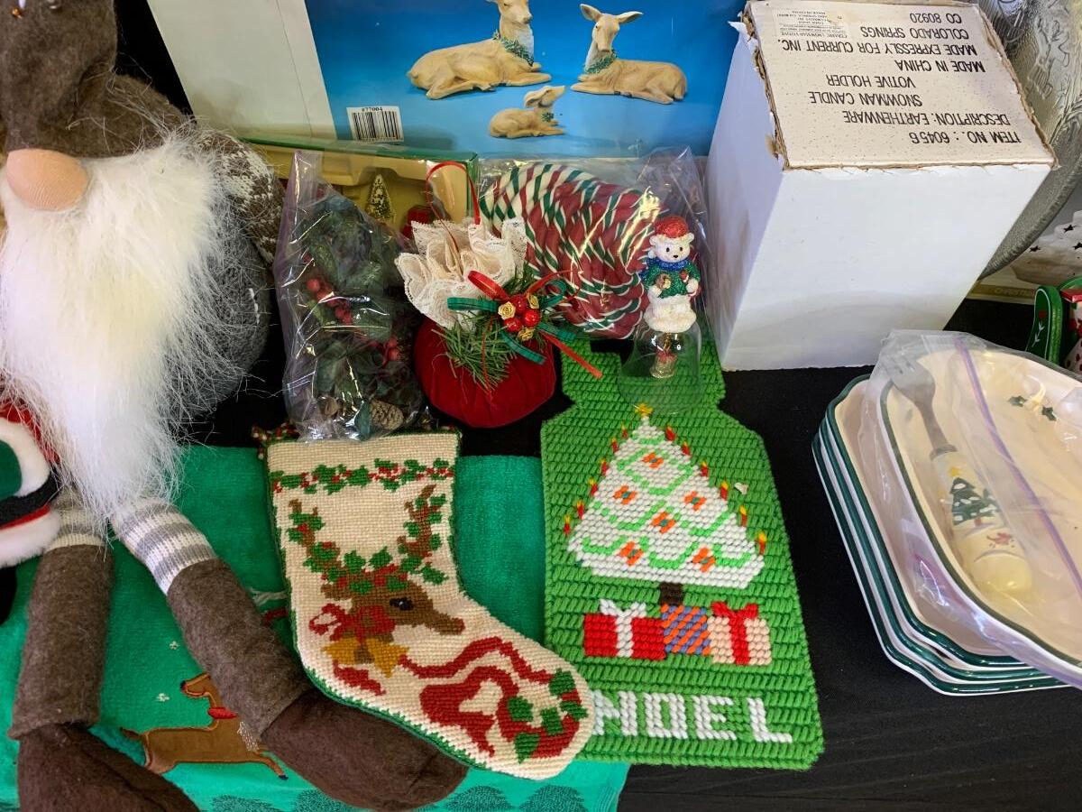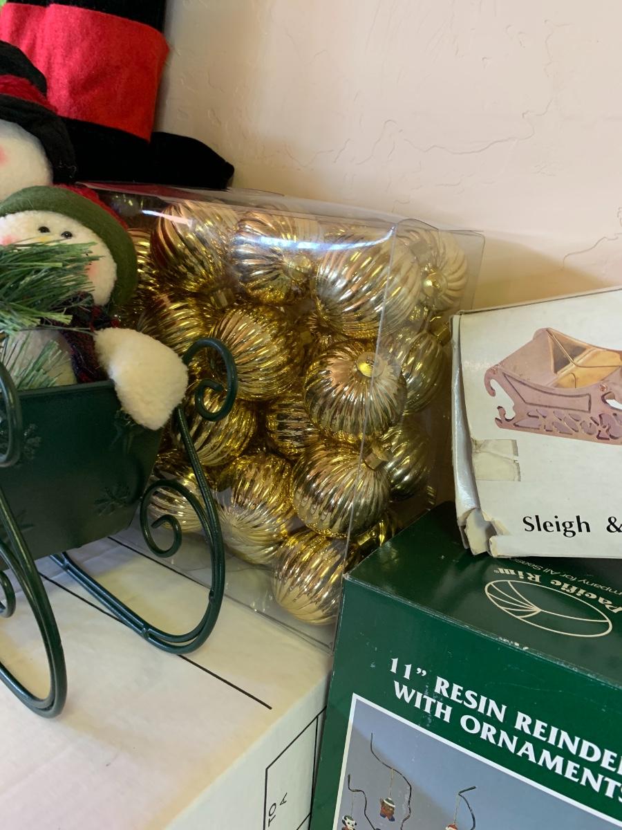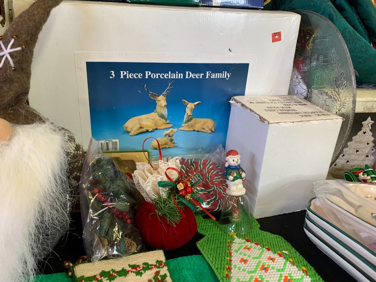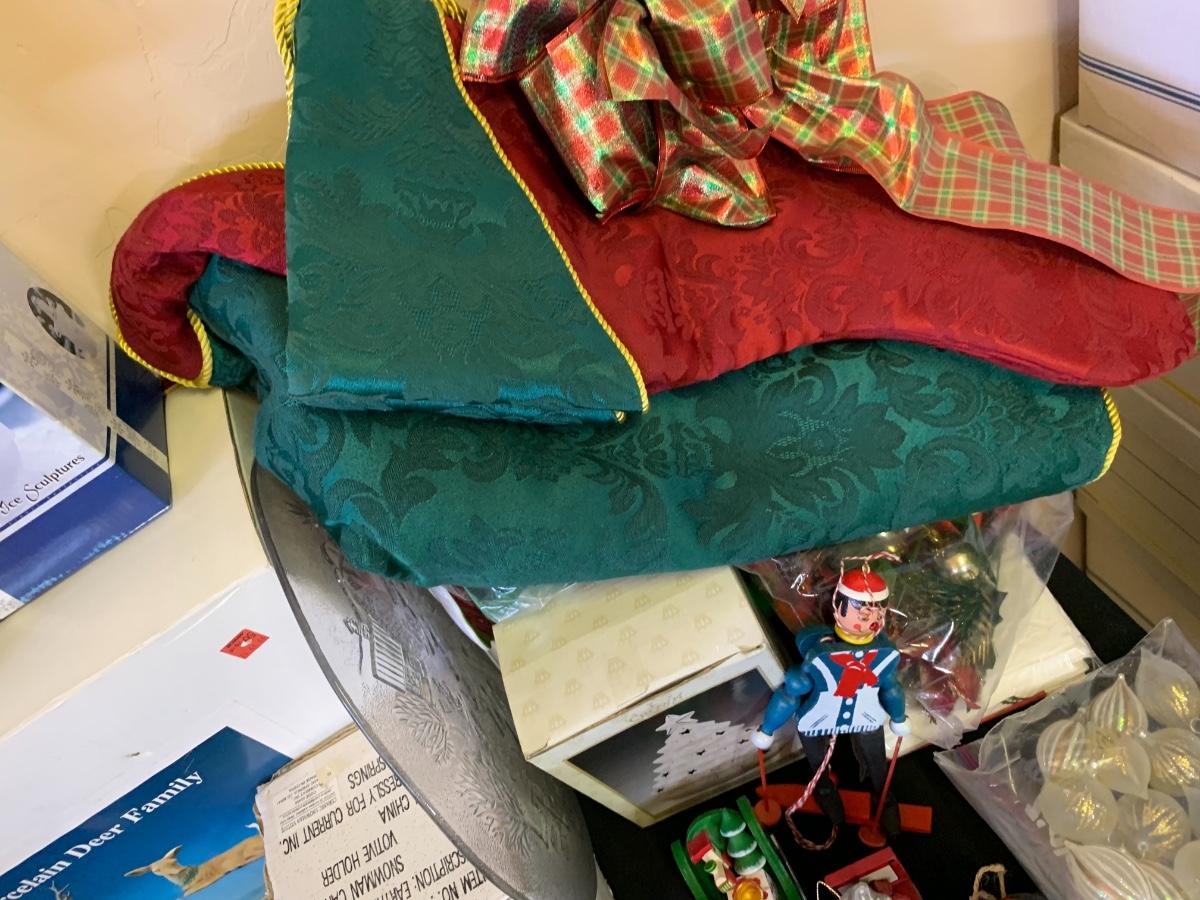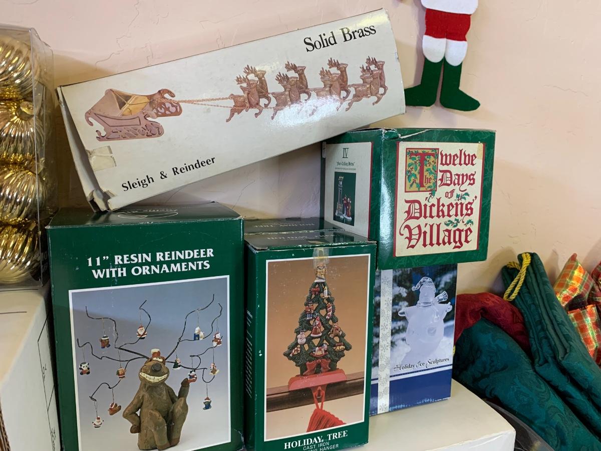 Lot includes various Christmas decor items, tree skirt, stockings, handmade decor items, serving plates, reindeer family solid brass sleigh and reindeer.