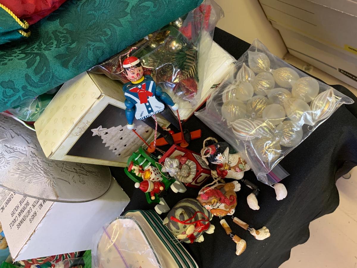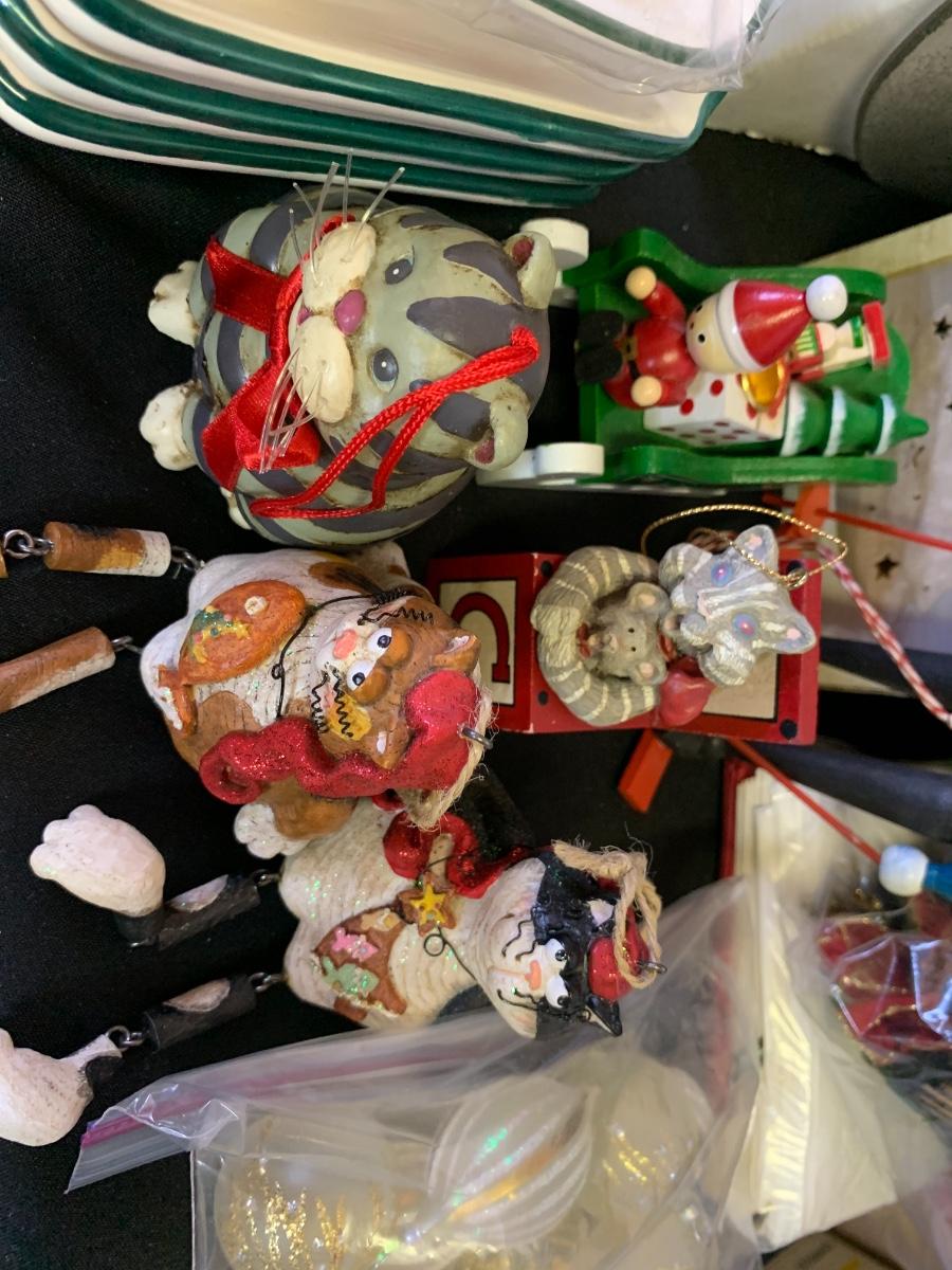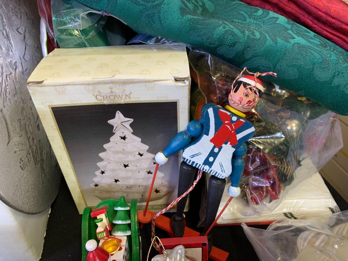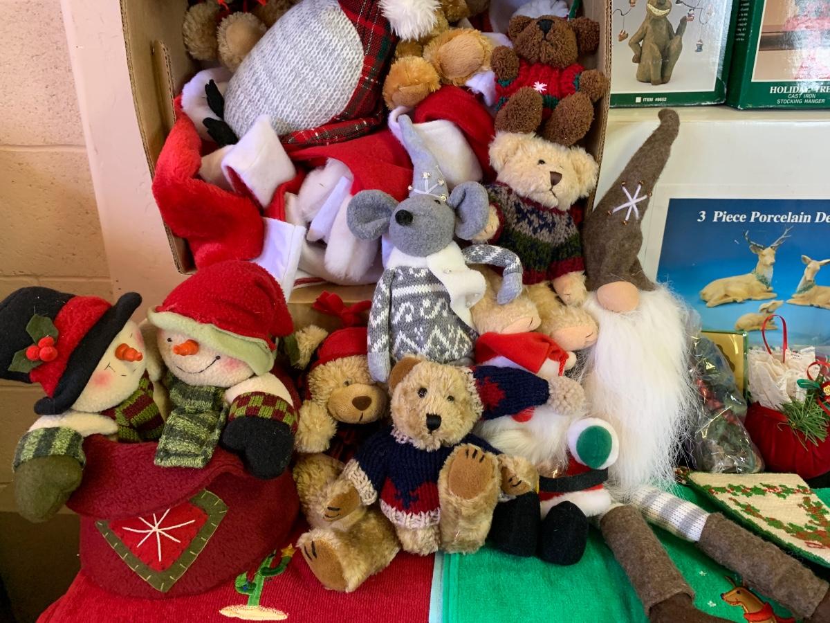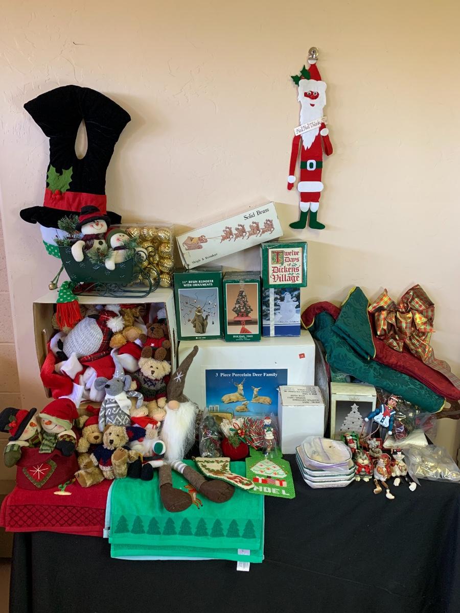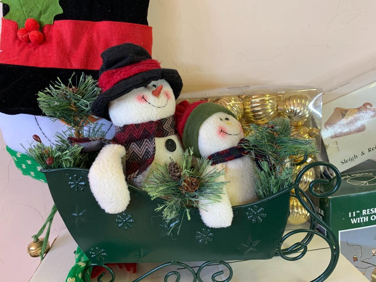 Lot includes various Christmas decor items, tree skirt, stockings, handmade decor items, serving plates, reindeer family solid brass sleigh and reindeer.
