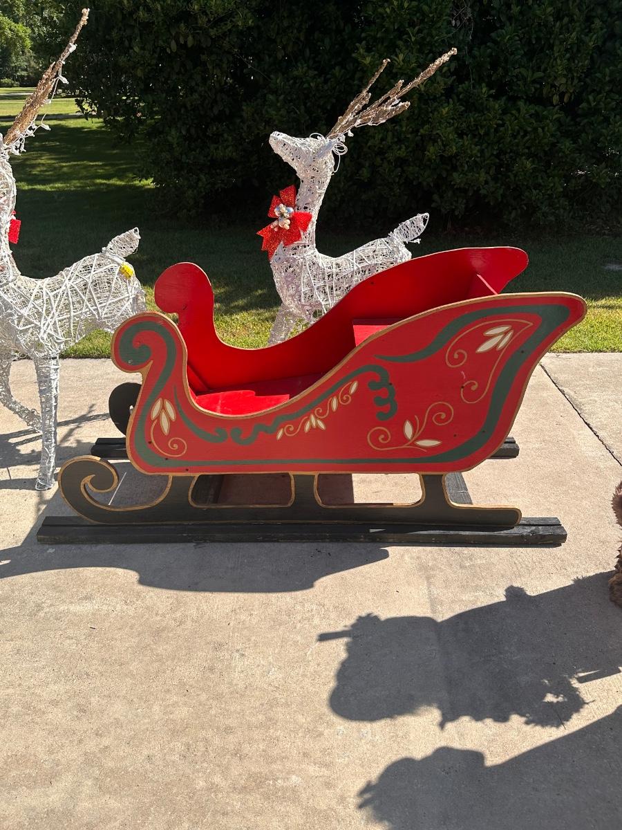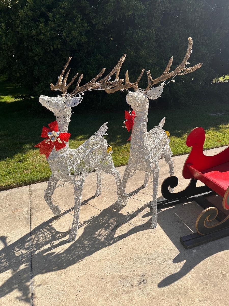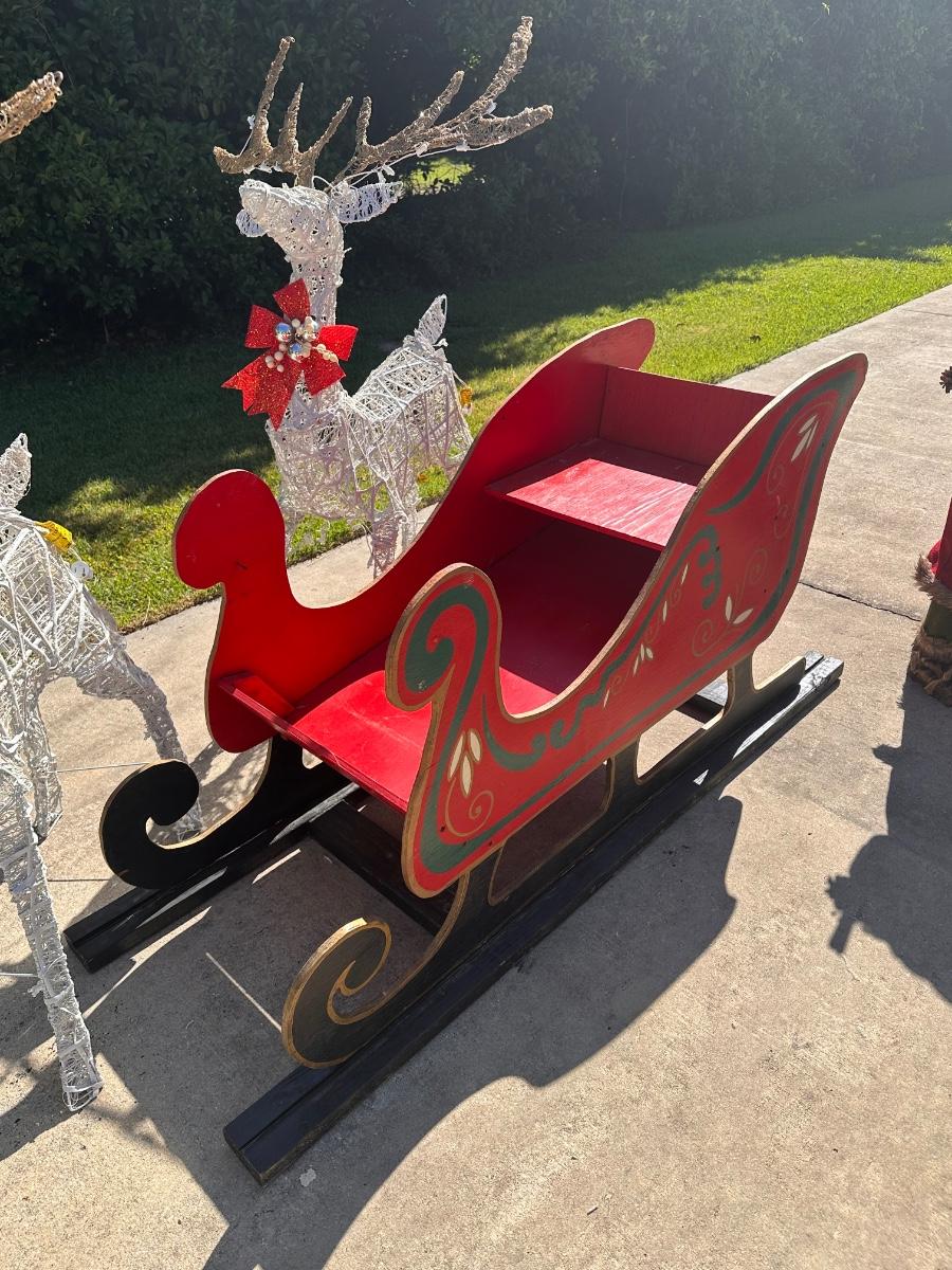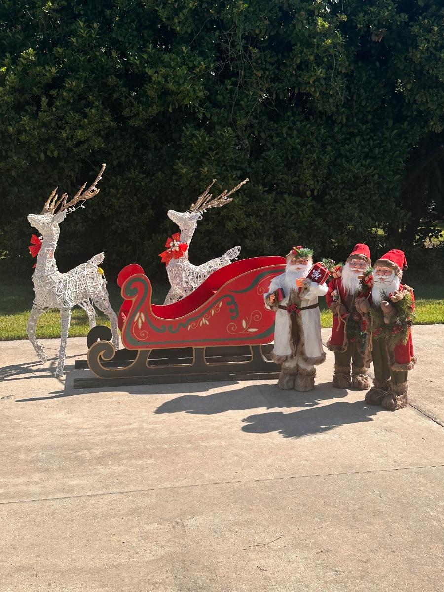 Sleigh is 30” H x 64” W x 23” D ~ 3 Santa’s stand 35” Tall ~ 2 Reindeer are 57” Tall to top of antlers ~ Some of the light of the reindeer will need to be replaced ~ 5 boxes of Gift boxes included that owner added to sleigh ~ gift boxes may need new lights ~ additional 34” Teddy Santa included.
