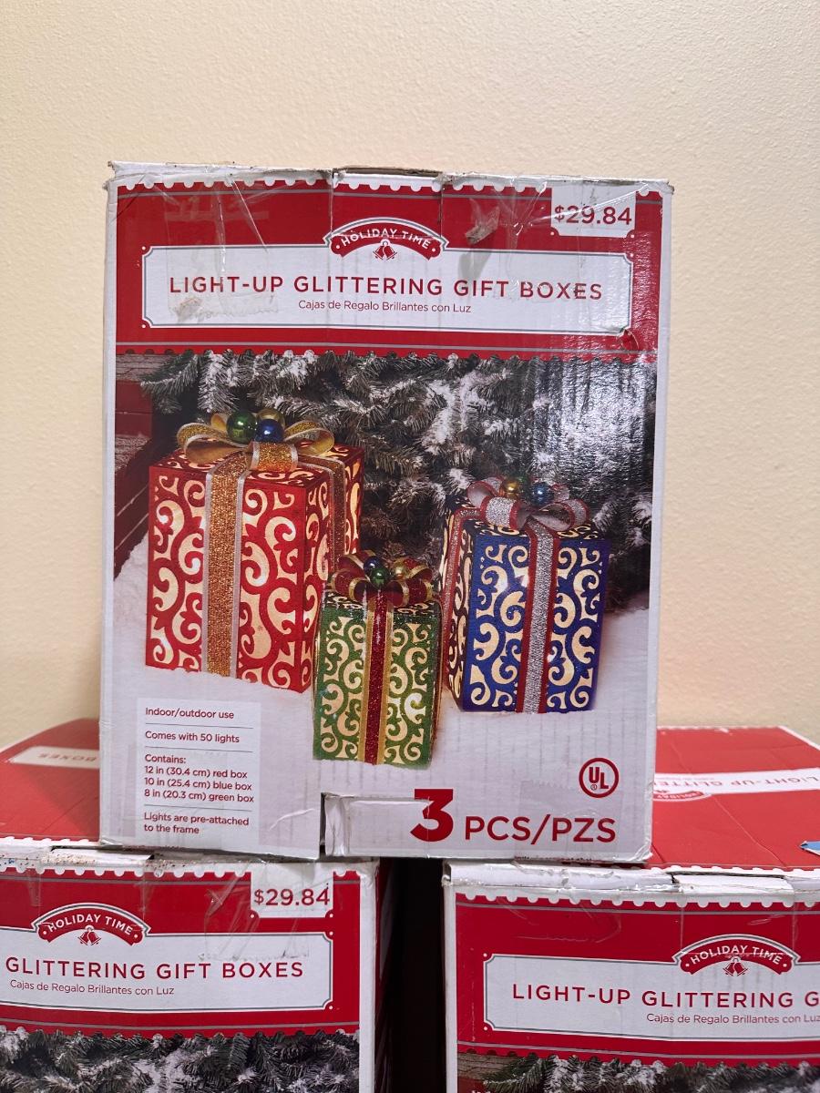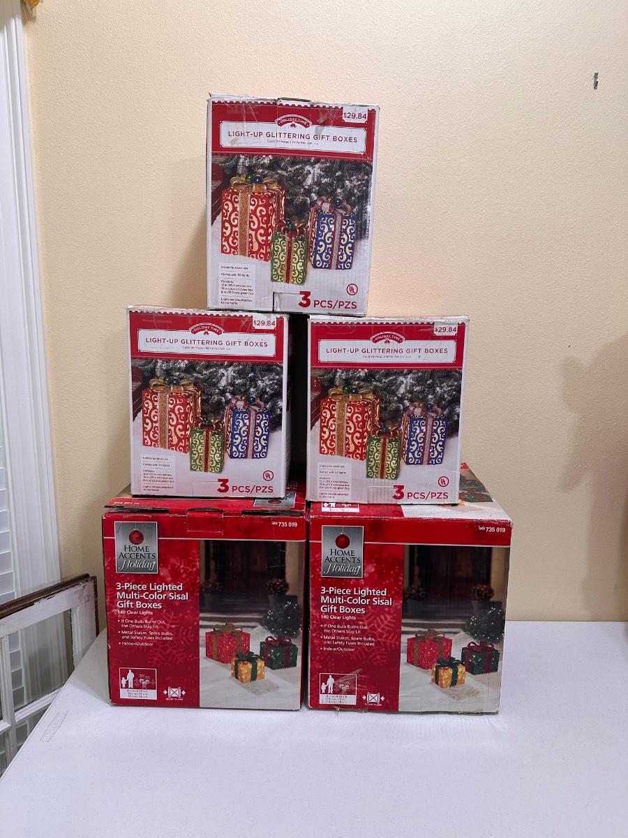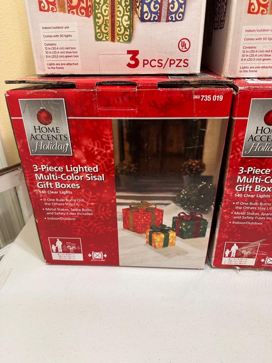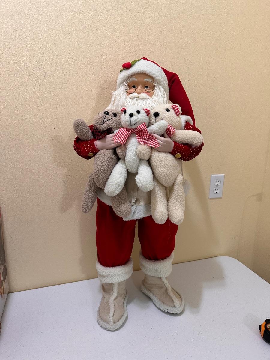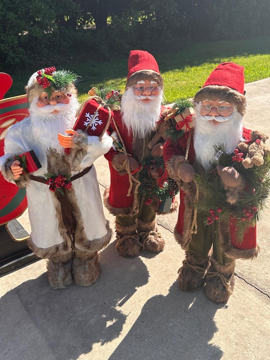 Sleigh is 30” H x 64” W x 23” D ~ 3 Santa’s stand 35” Tall ~ 2 Reindeer are 57” Tall to top of antlers ~ Some of the light of the reindeer will need to be replaced ~ 5 boxes of Gift boxes included that owner added to sleigh ~ gift boxes may need new lights ~ additional 34” Teddy Santa included.