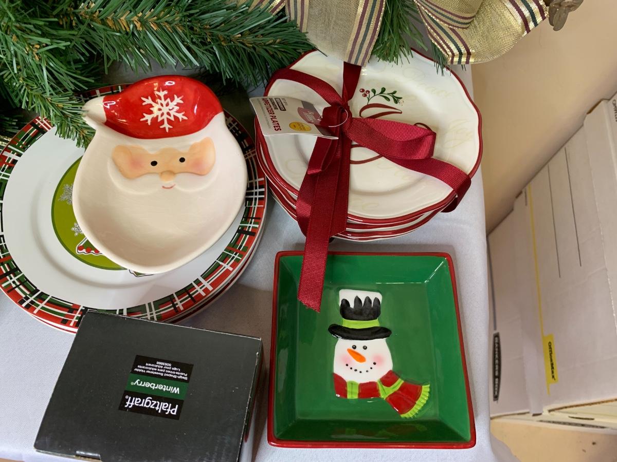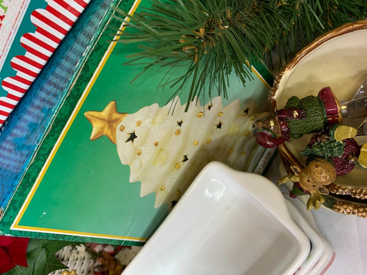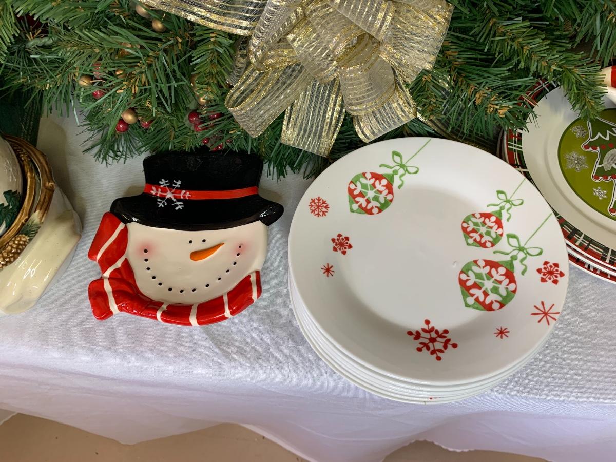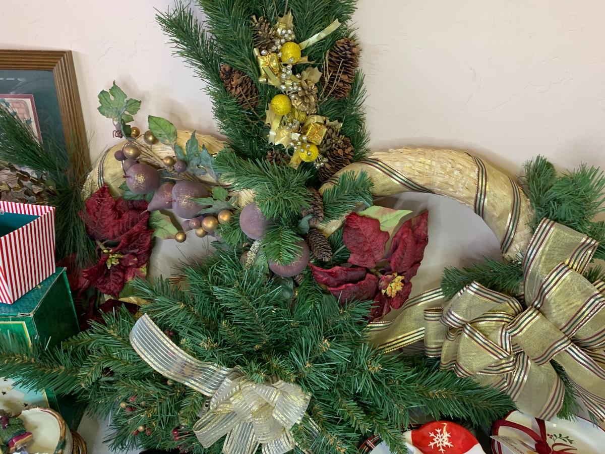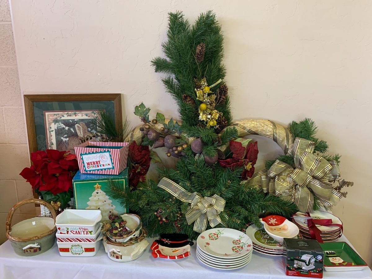 Lot includes wreaths, greenery, and various Christmas china and entertaining pieces. Also a Christmas tree votive holder.