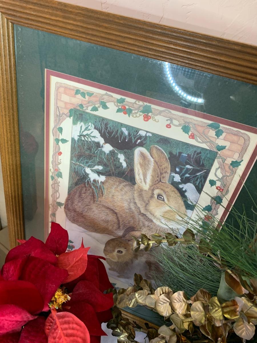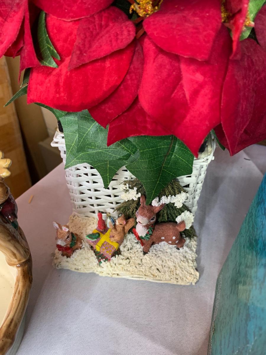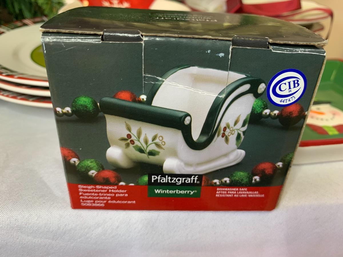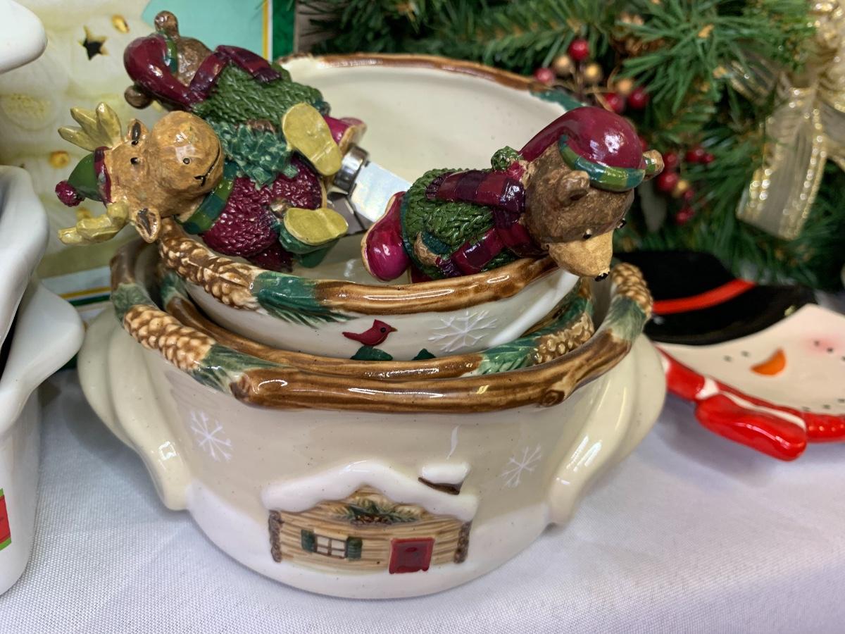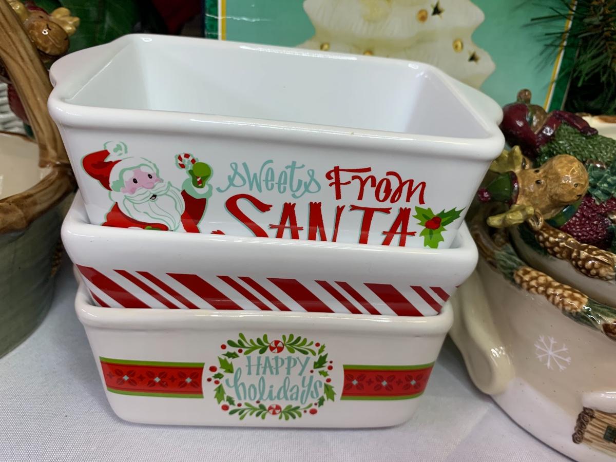 Lot includes wreaths, greenery, and various Christmas china and entertaining pieces. Also a Christmas tree votive holder.