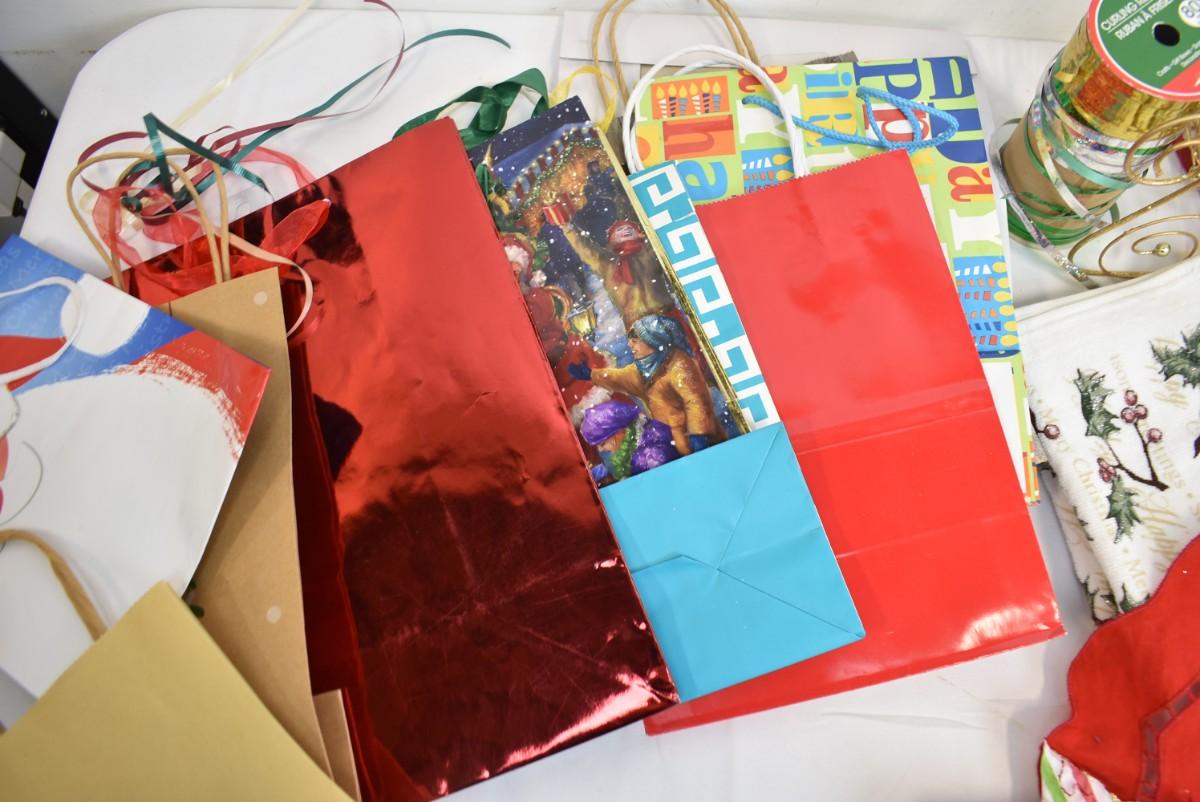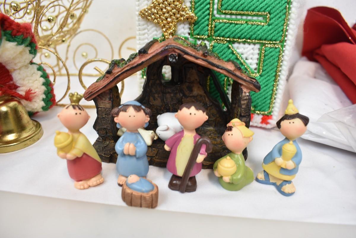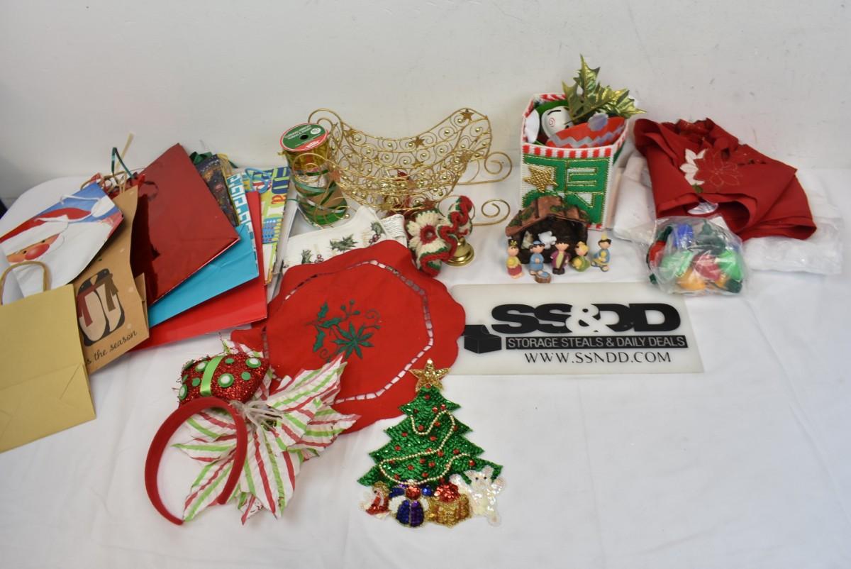 Christmas Lot: Small Nativity Set, Gift Bags, Ribbon, Sleigh