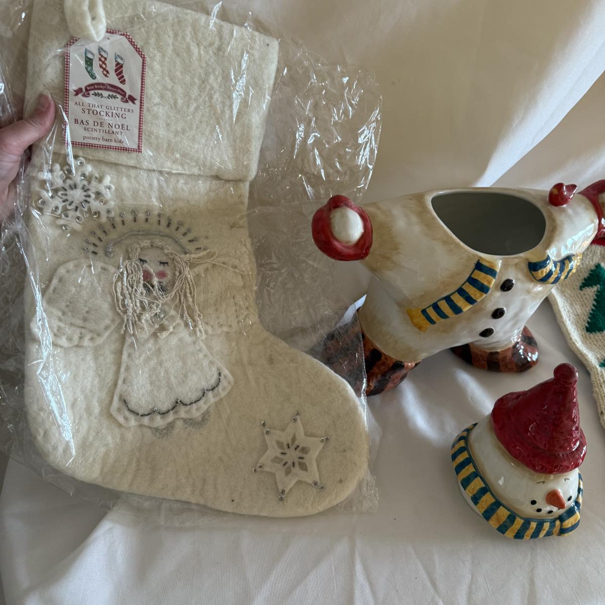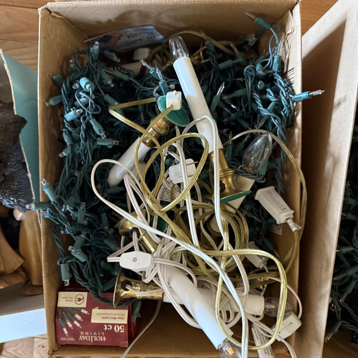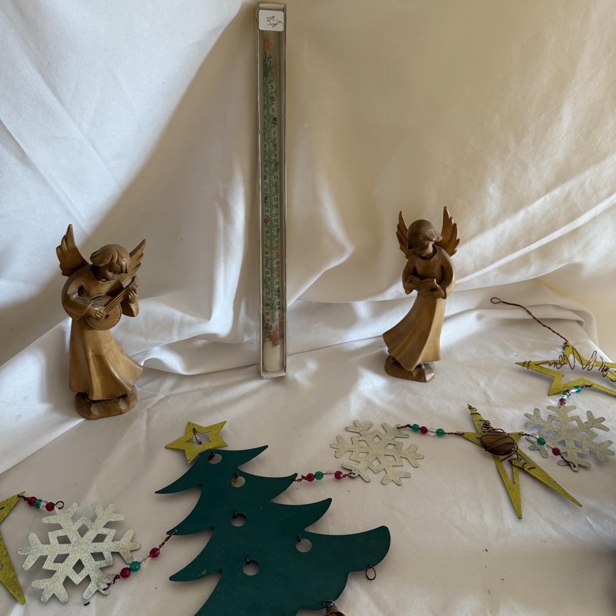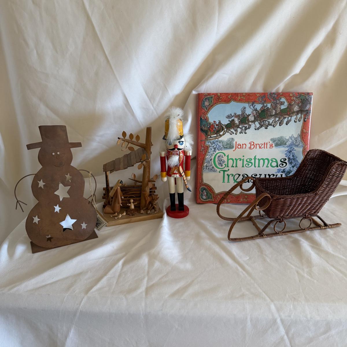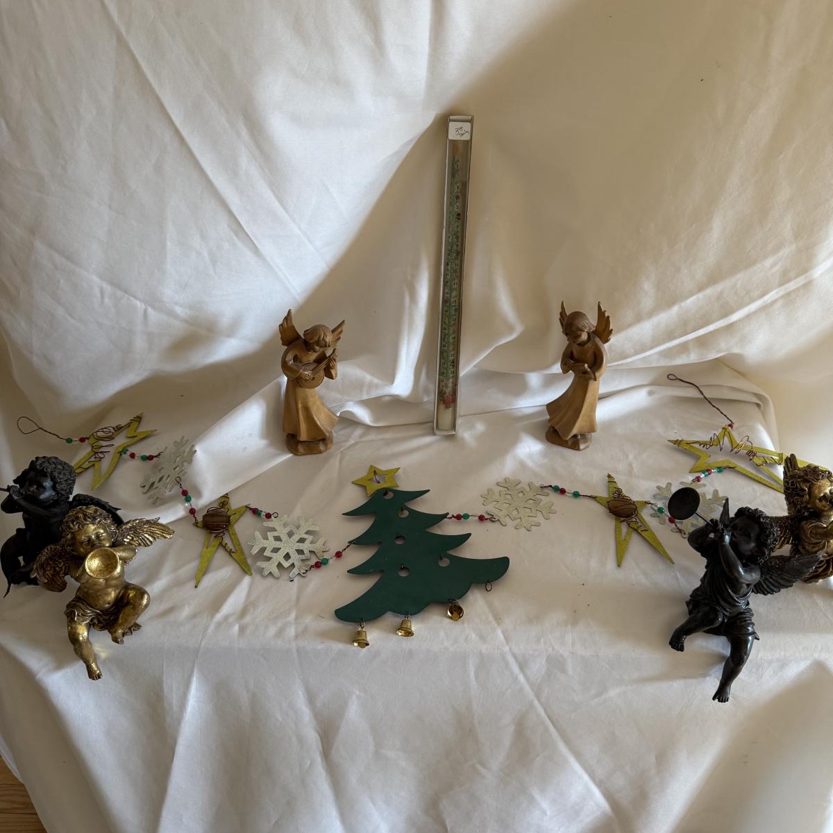 This lot is a Christmas dream!!! Everything in this lot powers on. There are over ten strings of lights all of which are white. Also included is some electric candle lights, some NIB lawn snowflake decorations that are 12”, 18”, and 24”. Next are two faux wreaths that both light up, both with 24”D. There are also two different table garlands. Both are plastic and one is a twisty branch style with holly and the other looks like pine and holly this one is 72”. Moving on, we have a little wooden nativity scene, a ceramic snowman cookie jar, some metal and bead snowflakes, a nut cracker that stands 10”H, two stockings, a metal snowman candle holder, a Christmas book, some beaded berry looking garland, a Christmas tree stand that measures 14” x 14”, a little wicker slay, some little wooden angels and finally some little trumpet cherubs! The little trumpet cherubs are about 8”H. Local pick up only.